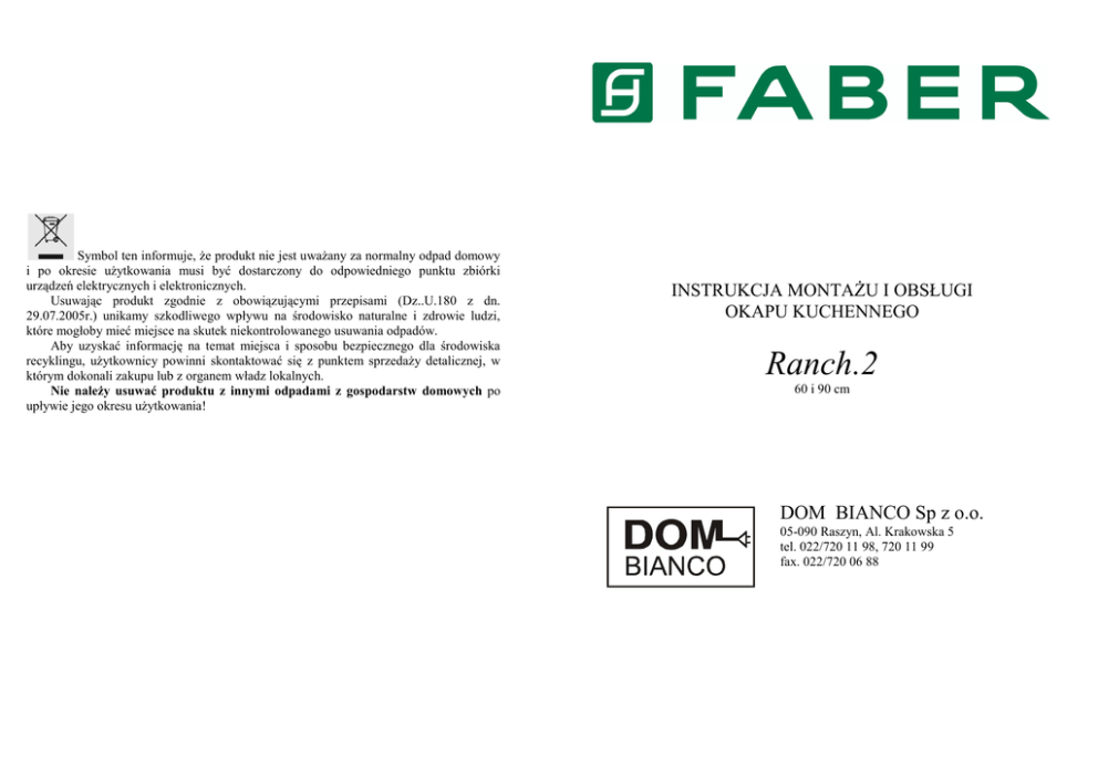 Symbol ten informuje, że produkt nie jest uważany za normalny odpad domowy i po okresie użytkowania musi być dostarczony do odpowiedniego punktu zbiórki urządzeń elektrycznych i elektronicznych. Usuwając produkt zgodnie z obowiązującymi przepisami (Dz..U.180 z dn. 29.07.2005r.) unikamy szkodliwego wpływu na środowisko naturalne i zdrowie ludzi, które mogłoby mieć miejsce na skutek niekontrolowanego usuwania odpadów. Aby uzyskać informację na temat miejsca i sposobu bezpiecznego dla środowiska recyklingu, użytkownicy powinni skontaktować się z punktem sprzedaży detalicznej, w którym dokonali zakupu lub z organem władz lokalnych. Nie należy usuwać produktu z innymi odpadami z gospodarstw domowych po upływie jego okresu użytkowania! INSTRUKCJA MONTAŻU I OBSŁUGI OKAPU KUCHENNEGO Ranch.2 60 i 90 cm DOM BIANCO Sp z o.o. 05-090 Raszyn, Al. Krakowska 5 tel. 022/720 11 98, 720 11 99 fax. 022/720 06 88 PROBLEMY W TRAKCIE UŻYTKOWANIA WYMIARY W trakcie użytkowania okapu mogą wystąpić problemy. Przed skontaktowaniem się z serwisem należy sprawdzić: 1) Podczas pracy okapu słychać dziwny hałas: • Sprawdzić czy wszystkie śruby są dobrze dokręcone; • Zdjąć ewentualne przedmioty znajdujące się na półce nad okapem. 2) Okap się nie włącza: • Przeprowadzić prawidłową kalibrację sensora; • Sprawdzić pozycję sterownika silnika; • Sprawdzić czy łącznik przewodu zasilania jest prawidłowo podłączony do wtyczki silnika, która znajduję się pod filtrami przeciwtłuszczowymi; • Sprawdzić czy wtyczka jest prawidłowo podłączona do zasilania; 3) Okap pracuje mało wydajnie (słabo pochłania): • Umyć filtry metalowe bądź wymienić na nowe filtry węglowe; • Sprawdzić czy wyjście powietrza nie jest zatkane. UWAGA: Kontaktując się z serwisem należy podać dane z tabliczki znamionowej znajdującej się wewnątrz okapu pod filtrami przeciwtłuszczowymi: 1) Model okapu, 2) Kod produktu, 3) Data produkcji 4) znajdujący się obok tabliczki znamionowej numer Inspektora kontroli jakości DREWNIANA RAMA -1-8- REKOMENDACJE I ZALECENIA EASY DISMOUNTING - wyjmowanie zespołu silnikowego (TYLKO W SPECJALNYCH WERSJACH) W celu wyczyszczenia zespołu silnikowego: -odłączyć okap od źródła zasilania -wyjąć: filtry przeciwtłuszczowe i węglowe (wersja pochłaniacz). Odłączyć złączkę zasilania Ca i przełącznika oświetlenia Cmd położonych po bokach silnika. Przekręcić dźwigienki Lb blokujące, a następnie wyjąć zatyczki. Pociągając do przodu wyciągnąć zespół silnikowy w taki sposób, aby odczepić zatyczki podtrzymujące. Model Ranch jest przystosowany do pracy zarówno w wersji wyciąg (podłączenie do kanałów wentylacyjnych w ścianach budynków), jak i w wersji pochłaniacz z nawrotem oczyszczonego powietrza do pomieszczenia kuchennego. Przed przystąpieniem do montażu okapu kuchennego należy przewidzieć ewentualne trudności, jakie mogą powstać podczas montażu i użytkowania urządzenia. Prace montażowe powinny być wykonywane przez odpowiednio przeszkolony i wykwalifikowany personel. Prace montażowe oraz umiejscowienie i sposób podłączenia urządzenia do instalacji wentylacyjnych i elektrycznych musi odpowiadać obowiązującym przepisom prawa i normom, a w szczególności postanowieniom rozporządzenia Ministra Infrastruktury z dnia 12 kwietnia 2002 r w sprawie warunków technicznych, jakim powinny odpowiadać budynki i ich usytuowanie (Dz. U. nr 75 z 2002 r. poz. 690 ). Producent i importer nie ponosi żadnej odpowiedzialności prawnej i materialnej za wszelkie straty materialne i szkody w zdrowiu osób spowodowane nie stosowaniem się do podanych w niniejszej instrukcji zasad montażu urządzenia. • Miękką szmatką i odpowiednim detersywem wyczyścić korpus okapu, uważając aby do zespołu silnikowego nie dostała się woda. Za pomocą szczotki wyczyścić dukt wylotu powietrza. Dobrze osuszyć przed ponownym zamontowaniem • • • • Okap kuchenny nie powinien być instalowany niżej niż 65 cm od płyty grzewczej, przy czym odległość tę mierzymy od najwyższego punktu płyty grzewczej lub kuchenki (np. ruszt). Przed podłączeniem urządzenia do źródła zasilania elektrycznego należy upewnić się, czy napięcie i częstotliwość prądu w instalacji elektrycznej odpowiadają wartościom podanym na tabliczce znamionowej okapu. Połączenie wyciągu i przewodu kominowego powinno być poprowadzone jak najkrótszą drogą i rurą o minimalnej średnicy 120 mm. W przypadku stosowania okapu kuchennego w wersji wyciąg, kanał wentylacyjny nie może być połączony z kanałami służącymi do odprowadzania spalin pochodzących z innych urządzeń zasilanych innymi źródłami energii niż elektryczna (np. piece centralnego ogrzewania, termy do wody itp.). Zainstalować wyłącznik dwubiegunowy, w którym odległość między stykami w położeniu “wyłączony” wynosi co najmniej 3 mm. - 7-2• Jeżeli w pomieszczeniu, w którym ma być zainstalowany okap kuchenny, znajdują się inne urządzenia bezpośrednio spalające paliwa, np. piec centralnego ogrzewania, to urządzenie takie nie może pobierać do spalania powietrza z pomieszczenia lub musi to być urządzenie o tak zwanym zbilansowanym przepływie spalin. W przypadku, gdy okap kuchenny jest użytkowany jako wyciąg w pomieszczeniu razem z urządzeniem zasilanym energią inną niż elektryczna, to podciśnienie w pomieszczeniu nie może przekroczyć 0,04 mbar (4 Pa), gdyż przy większej wartości może nastąpić zassanie spalin do pomieszczenia. Upewnić się, czy został zapewniony dopływ odpowiedniej ilości świeżego powietrza do pomieszczenia. Jeżeli nie, to w dolnej części ściany, należy zrobić otwór wychodzący na zewnątrz budynku o średnicy 10cm ( płyty gazowe z zaworami bezpieczeństwa) lub 20cm, jeżeli płyty gazowe nie posiadają zaworów przeciw wypływowych. UŻYTKOWANIE • • • • •