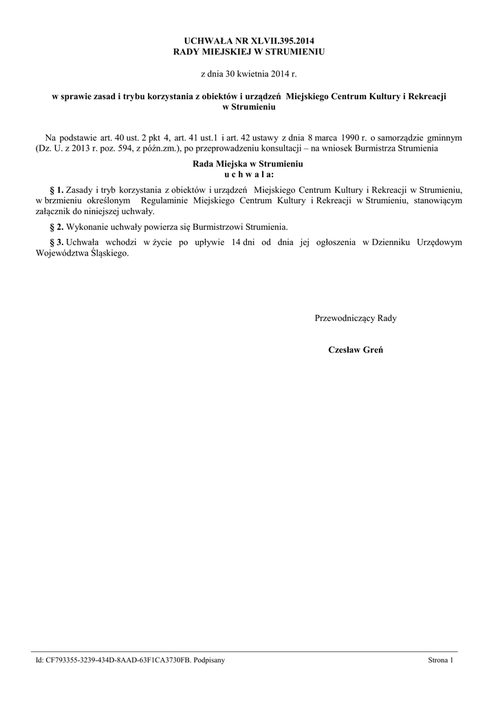 UCHWAŁA NR XLVII.395.2014 RADY MIEJSKIEJ W STRUMIENIU z dnia 30 kwietnia 2014 r. w sprawie zasad i trybu korzystania z obiektów i urządzeń Miejskiego Centrum Kultury i Rekreacji w Strumieniu Na podstawie art. 40 ust. 2 pkt 4, art. 41 ust.1 i art. 42 ustawy z dnia 8 marca 1990 r. o samorządzie gminnym (Dz. U. z 2013 r. poz. 594, z późn.zm.), po przeprowadzeniu konsultacji – na wniosek Burmistrza Strumienia Rada Miejska w Strumieniu u c h w a l a: § 1. Zasady i tryb korzystania z obiektów i urządzeń Miejskiego Centrum Kultury i Rekreacji w Strumieniu, w brzmieniu określonym Regulaminie Miejskiego Centrum Kultury i Rekreacji w Strumieniu, stanowiącym załącznik do niniejszej uchwały. § 2. Wykonanie uchwały powierza się Burmistrzowi Strumienia. § 3. Uchwała wchodzi w życie po upływie 14 dni od dnia jej ogłoszenia w Dzienniku Urzędowym Województwa Śląskiego. Przewodniczący Rady Czesław Greń Id: CF793355-3239-434D-8AAD-63F1CA3730FB. Podpisany Strona 1 Załącznik do Uchwały Nr XLVII.395.2014 Rady Miejskiej w Strumieniu z dnia 30 kwietnia 2014 r. Regulamin Miejskiego Centrum Kultury i Rekreacji w Strumieniu I. Część ogólna 1. Miejskie Centrum Kultury i Rekreacji w Strumieniu, zwane dalej Centrum, jest zespołem obiektów i urządzeń Gminy Strumień. 2. Centrum jest zarządzane przez Zakład Gospodarki Komunalnej i Mieszkaniowej w Strumieniu, zwany dalej zarządcą. 3. W skład Centrum wchodzą obiekty i urządzenia: 1) basen kąpielowy; 2) zjeżdżalnia; 3) korty do tenisa ziemnego; 4) kort do gry w squasha; 5) plac zabaw dla dzieci. 4. Każdy korzystający z obiektów i urządzeń Centrum obowiązany jest do przestrzegania obowiązujących na jego terenie regulaminów oraz innych powszechnie obowiązujących przepisów prawa. 5. Teren i obiekty Centrum objęte są systemem monitoringu wizyjnego. 6. Zabrania się wstępu oraz przebywania na terenie Centrum osób nietrzeźwych lub będących pod wpływem działania środków odurzających. 7. Zabrania się przebywania na terenie Centrum poza wyznaczonymi godzinami otwarcia, za wyjątkiem osób do tego upoważnionych. 8. Osoby nieprzestrzegające postanowień obowiązujących regulaminów oraz naruszające zasady porządku publicznego podlegają odpowiedzialności na podstawie Kodeksu wykroczeń oraz mogą zostać usunięte z terenu Centrum. 9. Korzystanie z obiektów i urządzeń Centrum jest odpłatne za wyjątkiem obiektu i urządzeń placu zabaw dla dzieci. II. Regulamin basenu kąpielowego 1. Basen kąpielowy czynny jest w okresie od czerwca do września, w godzinach od 10.00 do 18.00 w czerwcu i wrześniu oraz w godzinach od 9.00 do 19.00 w lipcu i sierpniu. 2. Przebywanie na terenie basenu kąpielowego poza wyznaczonymi godzinami jest zabronione. 3. Wstęp na teren basenu kąpielowego dopuszczalny jest wyłącznie na podstawie ważnego biletu który można zakupić w kasie. Obowiązujące ceny biletów oraz związany z nimi czas przebywania na terenie basenu kąpielowego podane są w cenniku podanym do publicznej wiadomości przy wejściu na teren basenu kąpielowego. 4. Zarządca basenu kąpielowego uprawniony jest do kontroli biletów w każdym czasie, a osoby nie posiadające ważnego biletu podlegają usunięciu poza teren basenu kąpielowego. 5. Sprzedaż biletów wstępu na basen kąpielowy kończy się na godzinę przed zamknięciem kąpieliska w danym dniu. 6. Grupy zorganizowane liczące minimum 15 osób, wchodzą na teren basenu kąpielowego na podstawie listy uczestników sporządzonej przez opiekuna grupy. 7. Dzieci do lat 7 mogą przebywać na terenie basenu kąpielowego wyłącznie pod opieką osoby pełnoletniej. 8. Na terenie basenu kąpielowego zabrania się: Id: CF793355-3239-434D-8AAD-63F1CA3730FB. Podpisany Strona 1 1) biegania po chodnikach i plaży basenowej, wywoływania nadmiernego hałasowania, wrzucania innych osób do wody oraz ich przytapiania; 2) skakania do basenu z bocznych brzegów oraz z innych niebezpiecznych miejsc, poza miejscami wyznaczonymi; 3) plażowania i chodzenia w obuwiu po plaży basenowej znajdującej się w otoczeniu niecki basenowej; 4) wzywania pomocy bez przyczyny, wszczynania fałszywych alarmów i prowokowania sytuacji grożących utonięciem lub innym wypadkiem; 5) wchodzenia na tereny wyłączone z użytkowania i odpowiednio oznaczone oraz do pomieszczeń, gdzie obowiązuje zakaz wstępu; 6) wnoszenia opakowań szklanych lub przedmiotów, które mogłyby wyrządzić szkodę innym osobom lub powodować zagrożenie dla innych osób; 7) wnoszenia do basenu nadmuchiwanych pontonów i materaców o dużych gabarytach oraz piłek tenisowych; 8) nieuprawnionego używania urządzeń ochronnych i pierwszej pomocy, a także samowolnego przenoszenia wyposażenia basenu kąpielowego. 9. Wszyscy korzystający są zobowiązani dbać o czystość basenu kąpielowego, a swoim zachowaniem nie powinni przeszkadzać innym osobom. 10. Osoby korzystające z basenu kąpielowego powinny używać jego wyposażenia przeznaczeniem. zgodnie z jego 11. Przed każdym wejściem do basenu należy skorzystać z prysznica i przejść przez brodzik. 12. Obowiązkowo należy przebierać się i rozbierać wyłącznie w miejscach do tego przeznaczonych, tj. w szatniach lub w przebieralniach. 13. Przed przekroczeniem drzwi przebieralni należy zdjąć lub zmienić obuwie na przystosowane do przebywania w strefie mokrej. 14. Osoby nie umiejące pływać mogą przebywać tylko w płytkiej części basenu. 15. Do basenu dziecięcego mają wstęp wyłącznie dzieci do lat 5. Dorosłym wstęp do basenu dziecięcego jest zabroniony, z wyłączeniem przypadku, gdy towarzyszą swoim podopiecznym. 16. Przy korzystaniu z wodnych atrakcji należy zachować ostrożność, w szczególności zabrania się stwarzania sytuacji mogących zagrażać zdrowiu lub życiu korzystających z tych atrakcji. 17. Zakazany jest wstęp na teren basenu osobom chorym, w szczególności na choroby zakaźne. 18. Osobom 