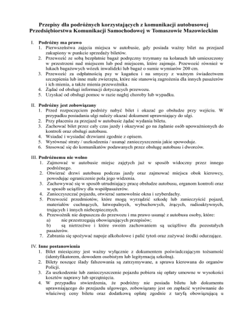 Przepisy dla podróżnych korzystających z komunikacji autobusowej Przedsiębiorstwa Komunikacji Samochodowej w Tomaszowie Mazowieckim I. Podróżny ma prawo 1. Pierwszeństwa zajęcia miejsca w autobusie, gdy posiada ważny bilet na przejazd zakupiony w punkcie sprzedaży biletów. 2. Przewozić ze sobą bezpłatnie bagaż podręczny trzymany na kolanach lub umieszczony w przestrzeni nad miejscem lub pod miejscem, które zajmuje. Przewozić również w lukach bagażowych wózek inwalidzki lub bagaż o sumie wymiarów 200 cm. 3. Przewozić za odpłatnością psy w kagańcu i na smyczy z ważnym świadectwem szczepienia lub inne małe zwierzęta, które nie stanowią zagrożenia dla innych pasażerów i ich mienia, a także mienia przewoźnika. 4. Żądać od obsługi informacji dotyczących przewozu. 5. Uzyskać od obsługi pomoc w razie nagłej choroby lub wypadku. II. Podróżny jest zobowiązany 1. Przed rozpoczęciem podróży nabyć bilet i okazać go obsłudze przy wejściu. W przypadku posiadania ulgi należy okazać dokument uprawniający do ulgi. 2. Przy płaceniu za przejazd w autobusie żądać wydania biletu. 3. Zachować bilet przez cały czas jazdy i okazywać go na żądanie osób upoważnionych do kontroli oraz obsługi autobusu. 4. Wsiadać i wysiadać drzwiami zgodnie z opisem. 5. Wyrównać straty / uszkodzenia / usunąć zanieczyszczenia jakie spowoduje. 6. Stosować się do komunikatów podawanych przez obsługę autobusu i dworców. III. Podróżnemu nie wolno 1. Zajmować w autobusie miejsc zajętych już w sposób widoczny przez innego podróżnego. 2. Otwierać drzwi autobusu podczas jazdy oraz zajmować miejsca obok kierowcy, powodując ograniczenie pola jego widzenia. 3. Zachowywać się w sposób utrudniający pracę obsłudze autobusu, organom kontroli oraz w sposób uciążliwy dla współpasażerów. 4. Zanieczyszczać pojazdu, otwierać samowolnie okna i szyberdachy. 5. Przewozić przedmiotów, które mogą wyrządzić szkodę lub zanieczyścić pojazd, materiałów cuchnących, łatwopalnych, wybuchowych, żrących, radioaktywnych, trujących i innych niebezpiecznych. 6. Przewoźnik nie dopuszcza do przewozu i ma prawo usunąć z autobusu osoby, które: a) nie przestrzegają obowiązujących przepisów; b) są nietrzeźwe i które swoim zachowaniem są uciążliwe dla pozostałych pasażerów. 7. Zabrania się spożywać napoje alkoholowe i palić tytoń oraz zażywać środki odurzające. IV. Inne postanowienia 1. Bilet miesięczny jest ważny wyłącznie z dokumentem poświadczającym tożsamość (identyfikatorem, dowodem osobistym lub legitymacją szkolną). 2. Bilety noszące ślady fałszowania są zatrzymywane, a sprawa kierowana do organów Policji. 3. Za uszkodzenie lub zanieczyszczenie pojazdu pobiera się opłaty umowne w wysokości kosztów naprawy lub sprzątnięcia. 4. W przypadku stwierdzenia, że podróżny nie posiada biletu lub dokumentu uprawniającego do przejazdu ulgowego, zobowiązany jest on zapłacić wyrównanie do właściwej ceny biletu oraz dodatkową opłatę zgodnie z taryfą obowiązującą u przewoźnika. Wszelkie uwagi dotyczące realizacji przewozów prosimy kierować: Przedsiębiorstwo Komunikacji Samochodowej w Tomaszowie Mazowieckim Sp. z o.o. ul. Dworcowa 6 97-200 Tomaszów Mazowiecki [email protected] tel.: +48 44 724 59 53