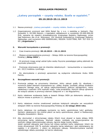 REGULAMIN PROMOCJI „Łatwy porządek – czysty relaks. Szafa w sypialni.” 05.10.2015-25.11.2015 1.1 Nazwa promocji: „Łatwy porządek – czysty relaks. Szafa w sypialni” . 1.2 Organizatorem promocji jest IKEA Retail Sp. z o.o. z siedzibą w Jankach, Plac Szwedzki 3, 05-090 Raszyn, z kapitałem zakładowym w wysokości 20.000.000,00 PLN, wpisana do rejestru przedsiębiorców Krajowego Rejestru Sądowego, przez Sąd Rejonowy dla m.st. Warszawy, XIV Wydział Gospodarczy Krajowego Rejestru Sądowego, pod numerem KRS 0000091681, REGON: 010577890, NIP: 527 010 33 85 („Organizator”). 2. Warunki korzystania z promocji: 2.1 Czas trwania promocji: 05.10.2015 – 25.11.2015. 2.2 Miejsce przeprowadzenia promocji – Sklepy IKEA na terenie Rzeczpospolitej Polskiej („Sklep IKEA”). 2.3 W promocji mogą wziąć udział tylko osoby fizyczne posiadające pełną zdolność do czynności prawnych. 2.4 Promocja skierowana jest do klientów detalicznych - konsumentów w rozumieniu art. 22(1) kodeksu cywilnego. 2.5 Do skorzystania z promocji uprawnieni są wyłącznie członkowie klubu IKEA Family. 3. Szczegółowe warunki promocji: 3.1 Promocja polega na przyznaniu klientowi, który zakupi szafę (tj. obudowę i minimum jeden element wyposażenia np.: półka, drążek, szuflada, płacąc środkami własnymi danego dnia, za zakup udokumentowany jednym paragonem), karty rabatowej o wartości 10% wartości szafy. Lista produktów, których zakup uprawnia do wzięcia udziału w promocji stanowi Załącznik nr 1 do Regulaminu. 3.2 Karty rabatowe wydawane będą w kasach Sklepu IKEA po dokonaniu zakupu, o którym mowa w punkcie 3.1. powyżej. 3.3 Karty rabatowe można zrealizować podczas kolejnych zakupów we wszystkich sklepach IKEA na terenie Rzeczpospolitej Polskiej do 21 lutego 2016 roku. 3.4 Karty rabatowe nie podlegają wymianie na karty upominkowe lub/i gotówkę. Kartami rabatowymi nie można płacić za karty upominkowe, płacić w Restauracji, Sklepiku Szwedzkim i Bistro. 3.5 Aby skorzystać z otrzymanego rabatu Klient musi okazać w kasie sklepu IKEA otrzymaną kartę rabatową. Wartość rabatu rozkłada się proporcjonalnie do wartości całego jednorazowego zakupu, łącznie dając kwotę rabatu. Jeżeli wartość zakupów jest równa lub niższa wartości karty rabatowej: klient nie może sfinansować 100 % wartości zakupów kartą rabatową i jest zobowiązany do zapłaty 1 zł (słownie: 1 złoty) za dokonane zakupy. Niewykorzystana wartość udzielonego rabatu pozostaje na karcie rabatowej. 1 Jeżeli wartość zakupów jest wyższa niż wartość karty rabatowej: klient może zrealizować przy takich zakupach całość rabatu, dopłacając za pozostałą część zakupów innym środkiem płatniczym. 3.6 Zwrot (na podstawie Regulaminu zwrotu towarów zakupionych w sklepach IKEA) artykułów zakupionych w promocji (do których została wydana karta rabatowa IKEA) oznacza jednocześnie rezygnację z promocji: a) Karta niewykorzystana - wartość karty musi zostać pomniejszona proporcjonalnie do wartości zwracanych artykułów promocyjnych. W przypadku zwrotu wszystkich artykułów następuje odbiór niewykorzystanej karty rabatowej. b) Karta wykorzystana częściowo - wartość karty musi zostać pomniejszona proporcjonalnie do wartości zwracanych artykułów promocyjnych. W przypadku, gdy wartość środków na karcie jest niewystarczająca, brakujące środki zostaną potrącone z wartości zwracanych artykułów (promocyjnych lub zakupionych z wykorzystaniem karty rabatowej). c) Karta wykorzystana w całości - wartość karty zostanie odjęta od wartości zwracanych artykułów (promocyjnych lub zakupionych z wykorzystaniem karty rabatowej). 3.7 W przypadku reklamacji (na podstawie obowiązujących przepisów prawa lub na podstawie gwarancji) artykułów zakupionych w promocji: a) Wymiana reklamowanych artykułów na identyczne oznacza zachowanie praw do promocji i wymianę na produkt identyczny bez ponoszenia dodatkowych kosztów lub potrąceń. b) Wymiana reklamowanych artykułów na inne (o ile klient wyrazi na to zgodę) oznacza rezygnację z promocji, a sposób rozliczenia zostanie przeprowadzony zgodnie z zapisami punktu 3.6. 3.8 W przypadku zwrotu (na podstawie Regulaminu zwrotu towarów zakupionych w sklepach IKEA) artykułu zakupionego z wykorzystaniem karty rabatowej klient otrzyma zwrot wartości towaru pomniejszonego o wartość udzielonego rabatu (cena widoczna na paragonie). 3.9 Promocja nie obejmuje artykułów wskazanych w Załączniku nr 1 zakupionych w Dziale Sprzedaży Okazyjnej oraz z ekspozycji. 4. Inne postanowienia: 4.1 Przystąpienie do promocji jest równoznaczne z potwierdzeniem się przez klienta z treścią niniejszego Regulaminu i jego akceptacją. 4.2 Wszelkie reklamacje dotyczące promocji należy składać w terminie 14 dni od dnia zakończenia promocji: zapoznania bezpośrednio w Dziale Obsługi Klienta w Sklepie IKEA w formie pisemnej, przesłać listownie na adres Sklepu IKEA (Kierownik Działu Obsługi Klienta). W przypadku przesłania reklamacji za pośrednictwem poczty decyduje data nadania pisma w urzędzie pocztowym, telefonicznie: 22 275 00 00 (opłata zgodnie z taryfikatorem operatora), przy użyciu poczty elektronicznej, przesyłając korespondencję na adres e-mail: [email protected] , za pośrednictwem formularza reklamacyjnego znajdującego się na stronie internetowej IKEA.pl. Reklamacje będą rozpatrzone pisemnie w terminie 14 dni. 2 Powyższe nie wyłącza, nie ogranicza, ani nie zawiesza uprawnień klienta związanych z nabytym towarem (w tym składania reklamacji co do ich jakości) wynikających z obowiązujących przepisów prawa, w tym z przepisów Kodeksu cywilnego o rękojmi za wady rzeczy sprzedanej. 4.3 Pisemna reklamacja powinna zawierać: dane kontaktowe z klientem tj. imię i nazwisko, adres, telefon oraz opis i powód reklamacji. 4.4 Regulamin promocji dostępny jest w Sklepie IKEA w Dziale Obsługi Klienta w