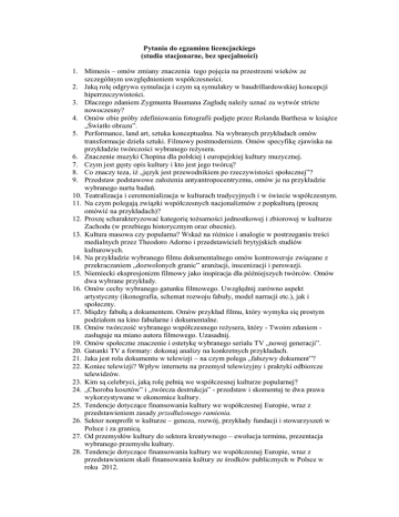 Pytania do egzaminu licencjackiego (studia stacjonarne, bez specjalności) 1. Mimesis – omów zmiany znaczenia tego pojęcia na przestrzeni wieków ze szczególnym uwzględnieniem współczesności. 2. Jaką rolę odgrywa symulacja i czym są symulakry w baudrillardowskiej koncepcji hiperrzeczywistości. 3. Dlaczego zdaniem Zygmunta Baumana Zagładę należy uznać za wytwór stricte nowoczesny? 4. Omów obie próby zdefiniowania fotografii podjęte przez Rolanda Barthesa w książce „Światło obrazu”. 5. Performance, land art, sztuka konceptualna. Na wybranych przykładach omów transformacje dzieła sztuki. Filmowy postmodernizm. Omów specyfikę zjawiska na przykładzie twórczości wybranego reżysera. 6. Znaczenie muzyki Chopina dla polskiej i europejskiej kultury muzycznej. 7. Czym jest gęsty opis kultury i kto jest jego twórcą? 8. Co znaczy teza, iż „język jest przewodnikiem po rzeczywistości społecznej”? 9. Przedstaw podstawowe założenia antyantropocentryzmu, omów je na przykładzie wybranego nurtu badań. 10. Teatralizacja i ceremonializacja w kulturach tradycyjnych i w świecie współczesnym. 11. Na czym polegają związki współczesnych nacjonalizmów z popkulturą (proszę omówić na przykładach)? 12. Proszę scharakteryzować kategorię tożsamości jednostkowej i zbiorowej w kulturze Zachodu (w przebiegu historycznym oraz obecnie). 13. Kultura masowa czy popularna? Wskaż na różnice i analogie w postrzeganiu treści medialnych przez Theodoro Adorno i przedstawicieli brytyjskich studiów kulturowych. 14. Na przykładzie wybranego filmu dokumentalnego omów kontrowersje związane z przekraczaniem „dozwolonych granic” aranżacji, inscenizacji i perswazji. 15. Niemiecki ekspresjonizm filmowy jako inspiracja dla późniejszych twórców. Omów dwa wybrane przykłady. 16. Omów cechy wybranego gatunku filmowego. Uwzględnij zarówno aspekt artystyczny (ikonografia, schemat rozwoju fabuły, model narracji etc.), jak i społeczny. 17. Między fabułą a dokumentem. Omów przykład filmu, który wymyka się prostym podziałom na kino fabularne i dokumentalne. 18. Omów twórczość wybranego współczesnego reżysera, który - Twoim zdaniem zasługuje na miano autora filmowego. Uzasadnij. 19. Omów społeczne znaczenie i estetykę wybranego serialu TV „nowej generacji”. 20. Gatunki TV a formaty: dokonaj analizy na konkretnych przykładach. 21. Jaka jest rola dokumentu w telewizji – na czym polega „fałszywy dokument”? 22. Koniec telewizji? Wpływ internetu na przemysł telewizyjny i praktyki odbiorcze telewidzów. 23. Kim są celebryci, jaką rolę pełnią we współczesnej kulturze popularnej? 24. „Choroba kosztów” i „twórcza destrukcja” - przedstaw i skomentuj te dwa prawa wykorzystywane w ekonomice kultury. 25. Tendencje dotyczące finansowania kultury we współczesnej Europie, wraz z przedstawieniem zasady przedłużonego ramienia. 26. Sektor nonprofit w kulturze – geneza, rozwój, przykłady fundacji i stowarzyszeń w Polsce i za granicą. 27. Od przemysłów kultury do sektora kreatywnego – ewolucja terminu, prezentacja wybranego przemysłu kultury. 28. Tendencje dotyczące finansowania kultury we współczesnej Europie, wraz z przedstawieniem skali finansowania kultury ze środków publicznych w Polsce w roku 2012.