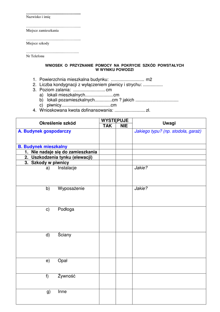 ........................................................... Nazwisko i imię ........................................................... Miejsce zamieszkania ........................................................... Miejsce szkody ......................................................... Nr Telefonu WNIOSEK O PRZYZNANIE POMOCY NA POKRYCIE SZKÓD POWSTAŁYCH W WYNIKU POWODZI 1. Powierzchnia mieszkalna budynku: ........................... m2 2. Liczba kondygnacji z wyłączeniem piwnicy i strychu: ................ 3. Poziom zalania: .......................... cm a) lokali mieszkalnych.......................cm b) lokali pozamieszkalnych..............cm ? jakich ................................... c) piwnicy........................................cm 4. Wnioskowana kwota dofinansowania: ......................... zł. Określenie szkód WYSTĘPUJE TAK NIE Uwagi A. Budynek gospodarczy Jakiego typu? (np. stodoła, garaż) B. Budynek mieszkalny 1. Nie nadaje się do zamieszkania 2. Uszkodzenia tynku (elewacji) 3. Szkody w piwnicy a) Instalacje Jakie? b) Wyposażenie c) Podłoga d) Ściany e) Opał f) Żywność g) Inne Jakie? 3. Szkody w części mieszkalnej a) Instalacje Jakie? b) Wyposażenie audio-video c) Lodówka d) Kuchenka e) pozostały sprzęt AGD f) Ściany g) Sufit h) Podłoga, dywany i) Meble j) Pościel, ubranie k) Okna, drzwi l) inne 4. Szkody w części gospodarczej Jakie? ........................................................................... Data i czytelny podpis