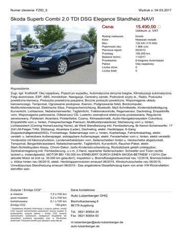 Numer zlecenia: FZID_5 Wydruk z: 04.03.2017 Skoda Superb Combi 2.0 TDI DSG Elegance Standheiz.NAVI Cena: 15.490,00 Rodzaj nadwozia Kolor Moc Pojemność sko. Pierwsza rejestr. Przebieg Badanie techni. Przekładnia Paliwo Liczba drzwi Liczba foteli Kombi Niebieski metalik 125 kW (170 KM) 1.968 ccm 05/2012 195.000 km 11/2017 6-biegowa Automatyka Olej napędowy 5 5 Udokum. p. VAT Wyposażenie Zugr.-lgd. Kraftstoff: Olej napędowy, Pojazd po wypadku, Automatyczna skrzynia biegów, Klimatyzacja automatyczna, Felgi aluminiowe, ESP, ABS, Immobilizer, Nawigacja, Centralny zamek, Podnośnik szyby el., Radio, Poduszka powietrzna kierowcy, Poduszka powietrzna pasażera, Boczne poduszki powietrzne, Wspomaganie układu kierowniczego, Tempomat, Ogrzewanie postojowe, Ksenon, Podgrzewanie foteli, Bordcomputer, Multifunktionslenkrad, Elektrische Sitze, Freisprecheinrichtung, Bluetooth, Mp3-Schnittstelle, Kindersitzbefestigung, Kurvenlicht, Lichtsensor, Nebelscheinwerfer, Tagfahrlicht, Traktionskontrolle, Regensensor, Dachreling, Einparkhilfe vorn, Wspomaganie parkowania, Odtwarzacz CD, Lusterko zewnętrzne elektrycznie przestawiane, Regularnie serwisowany, Polsterart: Alcantara, Polsterfarbe: Czarny, Klimaautomatik, Audio-Navigationssystem Columbus, Einparkhilfe vorn u. hinten, Freisprechanlage Premium, Multifunktionslenkrad, Sitzheizung vorn u. hinten, Lichtassistent (Coming Home/Leaving Home), ab Werk Standheizung inkl. Fernbedienung, Bi-Xenon-Scheinwerfer, 17 Zoll LM-Felgen Trifid, Sitzbezug: Alcantara (Leder), Dachreling, elektr. Heckklappe, 6-Gang Doppelschaltgetriebe(DSG), Frontairbags, Seitenairbags vorn u. hinten, Kopfairbags, Fahrerknieairbag, elektr. verstell- u. beheizbare Außenspiegel, anklappbare Außenspiegel, elektr. Fensterheber vorn u. hinten, elektr.verstellb. Vordersitze mit Memoryfunktion, Lendenwirbelstützen vorn, Seitenscheiben hinten u. Heckscheibe abgedunkelt, Tempomat, Berganfahrassistent, Nebelscheinwerfer, Tagfahrlicht, Kurvenlicht, Raucher-Paket, elektr. Start-/Schließsystem Kessy, Chrom-Dekor, Isofix-Kindersitzvorbereitung, Rücksitzbank geteilt umklappbar, Zentralverriegelung inkl. Fernbedienung, u.v.m, 2.Hand, reparierter Seitenschaden: Schweller und Türen rechts lackiert u. instandgesetzt, MOTOR BEI 130.000 km ERNEUERT DURCH EINEN SKODA-BETRIEB! 11/2014 (Der aktuelle Motor ist erst ca. 35.000 km gelaufen!), Inspektion u. Bremsflüssigkeitswechsel neu 12/2016, Bremsscheibenu. klötze hinten neu 06/2015, elektr. Heckklappenmotoren erneuert 06/2015, Windschutzscheibe neu 06/2015, Umwälzpumpe Standheizung erneuert 06/2015 - Das angebotene Dieselfahrzeug kann von einer VW-Rückrufaktion betroffen sein. Zużycie / Emisja CO2* w mieście poza miastem kombinowany Emisja CO2 Dane kontaktowe 7,5 L/100 km 5,2 L/100 km 6,1 L/100 km 159 g/km * Dodatkowe oficjalne informacje o zużyciu paliwa i emisji CO2 nowych samochodów osobowych można znaleźć w przewodniku zużycia paliwa i emisji CO2 nowych samochodów osobowych, dostępnym bezpłatnie we wszystkich punktach sprzedaży oraz w Deutschen Automobil Treuhand GmbH pod adresem www.dat.de Auto Lutzenberger OHG Bischofsackerweg 8 86179 Augsburg Tel. 0821 80854-30 Fax 0821 80854-50 [email protected] auto-lutzenberger.de Numer zlecenia: FZID_5 Wydruk z: 04.03.2017 Skoda Superb Combi 2.0 TDI DSG Elegance Standheiz.NAVI Numer zlecenia: FZID_5 Wydruk z: 04.03.2017 Skoda Superb Combi 2.0 TDI DSG Elegance Standheiz.NAVI Numer zlecenia: FZID_5 Wydruk z: 04.03.2017 Skoda Superb Combi 2.0 TDI DSG Elegance Standheiz.NAVI