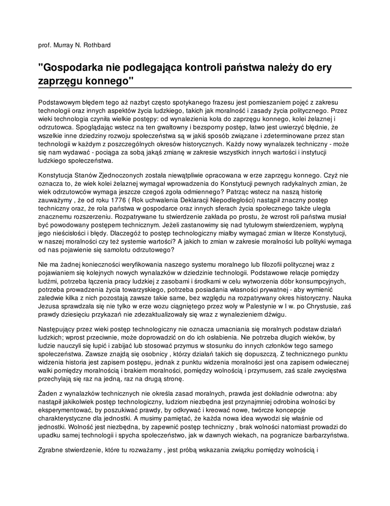 prof. Murray N. Rothbard "Gospodarka nie podlegająca kontroli państwa należy do ery zaprzęgu konnego" Podstawowym błędem tego aż nazbyt często spotykanego frazesu jest pomieszaniem pojęć z zakresu technologii oraz innych aspektów życia ludzkiego, takich jak moralność i zasady życia politycznego. Przez wieki technologia czyniła wielkie postępy: od wynalezienia koła do zaprzęgu konnego, kolei żelaznej i odrzutowca. Spoglądając wstecz na ten gwałtowny i bezsporny postęp, łatwo jest uwierzyć błędnie, że wszelkie inne dziedziny rozwoju społeczeństwa są w jakiś sposób związane i zdeterminowane przez stan technologii w każdym z poszczególnych okresów historycznych. Każdy nowy wynalazek techniczny - może się nam wydawać - pociąga za sobą jakąś zmianę w zakresie wszystkich innych wartości i instytucji ludzkiego społeczeństwa. Konstytucja Stanów Zjednoczonych została niewątpliwie opracowana w erze zaprzęgu konnego. Czyż nie oznacza to, że wiek kolei żelaznej wymagał wprowadzenia do Konstytucji pewnych radykalnych zmian, że wiek odrzutowców wymaga jeszcze czegoś zgoła odmiennego? Patrząc wstecz na naszą historię zauważymy , że od roku 1776 ( Rok uchwalenia Deklaracji Niepodległości) nastąpił znaczny postęp techniczny oraz, że rola państwa w gospodarce oraz innych sferach życia społecznego także uległa znacznemu rozszerzeniu. Rozpatrywane tu stwierdzenie zakłada po prostu, że wzrost roli państwa musiał być powodowany postępem technicznym. Jeżeli zastanowimy się nad tytułowym stwierdzeniem, wypłyną jego nieścisłości i błędy. Dlaczegóż to postęp technologiczny miałby wymagać zmian w literze Konstytucji, w naszej moralności czy też systemie wartości? A jakich to zmian w zakresie moralności lub polityki wymaga od nas pojawienie się samolotu odrzutowego? Nie ma żadnej konieczności weryfikowania naszego systemu moralnego lub filozofii politycznej wraz z pojawianiem się kolejnych nowych wynalazków w dziedzinie technologii. Podstawowe relacje pomiędzy ludźmi, potrzeba łączenia pracy ludzkiej z zasobami i środkami w celu wytworzenia dóbr konsumpcyjnych, potrzeba prowadzenia życia towarzyskiego, potrzeba posiadania własności prywatnej - aby wymienić zaledwie kilka z nich pozostają zawsze takie same, bez względu na rozpatrywany okres historyczny. Nauka Jezusa sprawdzała się nie tylko w erze wozu ciągniętego przez woły w Palestynie w I w. po Chrystusie, zaś prawdy dziesięciu przykazań nie zdezaktualizowały się wraz z wynalezieniem dźwigu. Następujący przez wieki postęp technologiczny nie oznacza umacniania się moralnych podstaw działań ludzkich; wprost przeciwnie, może doprowadzić on do ich osłabienia. Nie potrzeba długich wieków, by ludzie nauczyli się łupić i zabijać lub stosować przymus w stosunku do innych członków tego samego społeczeństwa. Zawsze znajdą się osobnicy , którzy działań takich się dopuszczą. Z technicznego punktu widzenia historia jest zapisem postępu, jednak z punktu widzenia moralności jest ona zapisem odwiecznej walki pomiędzy moralnością i brakiem moralności, pomiędzy wolnością i przymusem, zaś szale zwycięstwa przechylają się raz na jedną, raz na drugą stronę. Żaden z wynalazków technicznych nie określa zasad moralnych, prawda jest dokładnie odwrotna: aby nastąpił jakikolwiek postęp technologiczny, ludziom niezbędna jest przynajmniej odrobina wolności by eksperymentować, by poszukiwać prawdy, by odkrywać i kreować nowe, twórcze koncepcje charakterystyczne dla jednostki. A musimy pamiętać, że każda nowa idea wywodzi się właśnie od jednostki. Wolność jest niezbędna, by zapewnić postęp techniczny , brak wolności natomiast prowadzi do upadku samej technologii i spycha społeczeństwo, jak w dawnych wiekach, na pogranicze barbarzyństwa. Zgrabne stwierdzenie, które tu rozważamy , jest próbą wskazania związku pomiędzy wolnością i ograniczoną władzą państwa oraz erą zaprzęgu konnego i udowodnienia przez podstępną a rzekomą implikację, że socjalizm i państwo dobrobytu są dostosowane do wymogów ery odrzutowców i komputerów. Jest jednak wprost przeciwnie: to socjalizm i planowanie centralne są od wieków znane społeczeństwom ludzkim począwszy od okrutnego despotyzmu Orientu i starożytnych imperiów, a na totalitarnych rządach państwa Inków skończywszy. Wolność i moralność stopniowo zdobywały sobie pole przez wieki aż do momentu, kiedy wreszcie potęgująca się wolność umożliwiła zaistnienie ogromnego postępu technologicznego w okresie rewolucji przemysłowej przyczyniając się do rozkwitu nowoczesnego kapitalizmu. Powrót, w naszym wieku, do skupienia kontroli nad gospodarką w rękach państwa zagraża zepchnięciem nas do stanu barbarzyństwa dawno minionej przeszłości. Opowiadający się za skupieniem kontroli nad gospodarką w rękach państwa nazywają się „postępowcami”, o libertarianach wyrażają się natomiast jako o „reakcjonistach”. Etykietki te wynikają z frazesu, który tu rozważamy. Początków „determinizmu technologicznego” jako argumentu na poparcie konieczności skoncentrowania kontroli nad gospodarką w rękach państwa doszukiwać się należy u Karola Marksa, a jego kontynuacji w pracach Thorsteina Veblena i jego licznych zwolenników - prawdziwych reakcjonistów naszych czasów. wolnosciowe_czytanki/gospodarka/gospodarka_nie_podlegajaca_kontroli_panstwa_nalezy_do_ery_zaprzegu_konnego.txt · ostatnio zmienione: 2008/09/29 03:34 przez gigabyte