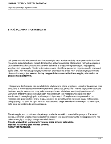 UWAGA "CZAD" - SKRYTY ZABÓJCA! Wpisany przez kpt. Ryszard Dudek STRAŻ POŻARNA - OSTRZEGA !!! Jak powszechnie wiadomo okres zimowy wiąże się z koniecznością zabezpieczenia domów i mieszkań przed skutkami niskich temperatur, głównie poprzez stosowanie różnych ociepleń i uszczelnień oraz korzystania w szerokim zakresie z urządzeń ogrzewczych, najczęściej węglowych i gazowych. Niesie to jednak ze sobą określone poważne zagrożenia dla zdrowia i życia ludzi. Jak wykazują statystyki zdarzeń prowadzone przez PSP charakterystycznym dla okresu zimowego jest wzrost liczby przypadków zatrucia tlenkiem węgla, nierzadko ze skutkiem śmiertelnym. Niesprawne technicznie lub niewłaściwie użytkowane piece węglowe, urządzenia gazowe oraz związane z nimi instalacje dymowo-spalinowe stwarzają poważne i realne zagrożenie zatrucia tlenkiem węgla, zwłaszcza przy jednoczesnym braku właściwej wentylacji pomieszczeń. Głównym źródłem zatruć w budynkach mieszkalnych jest niesprawność przewodów kominowych: wentylacyjnych, spalinowych i dymowych. Powyższe może prowadzić do niedrożności przewodów, braku ciągu, a nawet do powstawania zjawiska ciągu wstecznego, polegającego na tym, że dym zamiast wydostawać się przewodem kominowym na zewnątrz, cofa się z powrotem do pomieszczenia. Tlenek węgla jest produktem niepełnego spalania wszelkich materiałów palnych. Pamiętać trzeba, że tlenek węgla zwany popularnie czadem jest gazem niezwykle niebezpiecznym, nie tylko ze względu na jego toksyczne właściwości. Przede wszystkim jest niewykrywalny przez zmysły człowieka, stąd też nazywany jest nie bez powodu SKRYTYM ZABÓJCĄ. 1/6 UWAGA "CZAD" - SKRYTY ZABÓJCA! Wpisany przez kpt. Ryszard Dudek Pamiętaj !!! – aby uniknąć zatrucia tlenkiem węgla: 1. Dbaj o stan techniczny urządzeń spalinowych, grzewczych, przewodów kominowych (dymowych, spalinowych i wentylacyjnych) i instalacji gazowych. 2. Poddawaj je co najmniej raz w roku okresowej kontroli sprawności technicznej. 3. Usuwaj zanieczyszczenia z przewodów dymowych i spalinowych: - od palenisk opalanych paliwem płynnym i gazowym co najmniej raz na 6 miesięcy, - od palenisk opalanych paliwem stałym (drewno, węgiel, koks, itp.) co najmniej raz na 3 miesiące, - w zakładach zbiorowego żywienia i usług gastronomicznych - co najmniej raz w miesiącu. 4. Usuwaj zanieczyszczenia z przewodów wentylacyjnych co najmniej raz w roku. 5. Nie zatykaj przewodów wentylacyjnych !!!! 6. Nie ogrzewaj pomieszczeń kuchnia gazową. 7. 2/6 UWAGA "CZAD" - SKRYTY ZABÓJCA! Wpisany przez kpt. Ryszard Dudek Wszelkie czynności związane z rozłączaniem i przyłączaniem urządzeń grzewczych i innych spalinowych, kontrolą i czyszczeniem przewodów kominowych oraz ich naprawę mogą wykonywać tylko specjaliści z odpowiednimi uprawnieniami (uprawnieni kominiarze). 8. Każde urządzenie grzewcze opalane paliwem ciekłym, gazowym czy stałym zużywa powietrze do spalania paliwa i wydziela spaliny zawierające substancje szkodliwe dla zdrowia człowieka. W czasie pracy urządzenia zapewnij swobodny dopływ odpowiedniej ilości powietrza i odpływ spalin. Nie zatykaj kratek wentylacyjnych. Nie uszczelniaj otworów w drzwiach łazienek. 9. Każde pomieszczenie, w którym jest zainstalowane urządzenie opalane paliwem musi być przewietrzane i posiadać otwory do dopływu świeżego powietrza oraz otwór do przewodu wywiewnego (z kratką) służący do odprowadzania zużytego powietrza. 10. Urządzenia spalinowe powinny być obsługiwane wyłącznie przez osoby dorosłe, nie pozwalaj dzieciom na zabawę i manipulowanie przy piecu, kuchni, ogrzewaczu przepływowym wody i innym urządzeniu, a unikniesz nieszczęścia. 11. Zabronione jest użytkowanie uszkodzonych urządzeń spalinowych, przewodów kominowych i instalacji gazowej. 12. Nie dopuszczaj by spaliny wypływały do wnętrza pomieszczenia. Spaliny te zawierają tlenek węgla, który powoduje zatrucie organizmu. 13. Jeżeli wyczujesz zapach spalin w pomieszczeniu, natychmiast wyłącz urządzenia wydzielające spaliny, wyjdź z pomieszczenia, pootwieraj okna i drzwi, wezwij specjalistę do naprawy urządzenia lub przewodów kominowych. 3/6 UWAGA "CZAD" - SKRYTY ZABÓJCA! Wpisany przez kpt. Ryszard Dudek 14. Urządzenia użytkuj zgodnie z instrukcją obsługi. 15. Wszelkie samowolne przeróbki urządzeń, instalacji, przyłączy, przewodów kominowych, próby dostosowania do innego rodzaju paliwa i przestawianie urządzenia na inne miejsce są niedozwolone. Objawy zatrucia tlenkiem węgla: szum w uszach, ociężałość, przyspieszone tętno, zawroty głowy, ogólne osłabienie i utrata przytomności. 4/6 UWAGA "CZAD" - SKRYTY ZABÓJCA! Wpisany przez kpt. Ryszard Dudek Przy wysokich stężeniach, tlenku węgla w powietrzu, już po kilku wdechach może nastąpić zgon, bez objawów ostrzegawczych, wskutek porażenia układu oddechowego oraz ostrej niewydolności układu krążenia. Powikłaniem zatruć tlenkiem węgla są zmiany zwyrodnieniowe w ośrodkowym układzie nerwowym, nerwobóle i niewydolność płuc, natomiast w zatruciach przewlekłych: bóle i zawroty głowy, znużenie, zmiany w ośrodkowym układzie nerwowym objawiające się m. in. pogorszeniem pamięci i zdolności koncentracji, bezsennością. W PRZYPADKU ZATRUCIA NALEŻY UDZIELIĆ CHOREMU PIERWSZEJ POMOCY I WEZWAĆ POGOTOWIE RATUNKOWE. Postępowanie przy udzielaniu pierwszej pomocy: • wynieś chorego na świeże powietrze (przewietrz pomieszczenie), • rozepnij odzież, ułatwiaj oddychanie, • w przypadku, gdy chory stracił przytomność i nie oddycha podejmij reanimację, • chorego okryj kocem i nie pozwalaj mu zasnąć, • nieustannie dozoruj chorego, aż do przybycia pogotowia. Właściwości tlenku węgla: Tlenek węgla CO, potocznie zwany czadem. W temperaturze pokojowej jest to bezbarwny i bezwonny gaz. Ma silne własności toksyczne. Gromadzi się głównie pod sufitem poniew