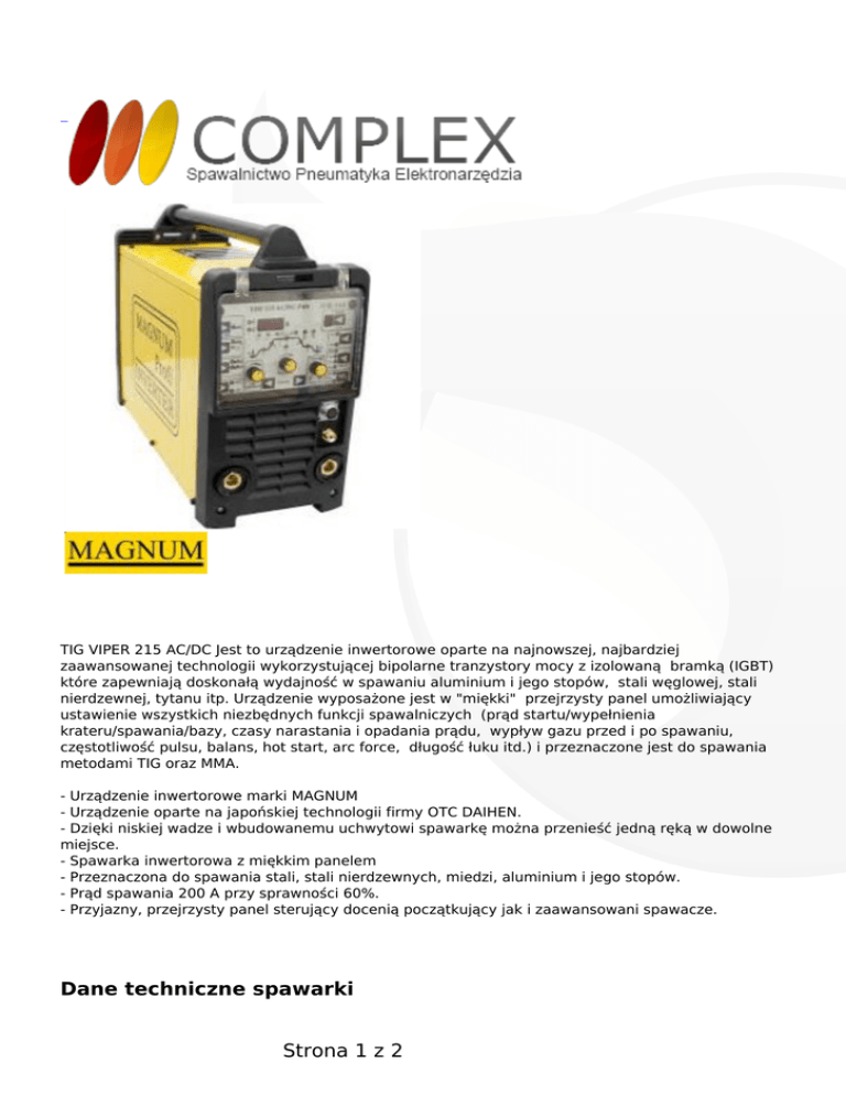 TIG VIPER 215 AC/DC Jest to urządzenie inwertorowe oparte na najnowszej, najbardziej zaawansowanej technologii wykorzystującej bipolarne tranzystory mocy z izolowaną bramką (IGBT) które zapewniają doskonałą wydajność w spawaniu aluminium i jego stopów, stali węglowej, stali nierdzewnej, tytanu itp. Urządzenie wyposażone jest w "miękki" przejrzysty panel umożliwiający ustawienie wszystkich niezbędnych funkcji spawalniczych (prąd startu/wypełnienia krateru/spawania/bazy, czasy narastania i opadania prądu, wypływ gazu przed i po spawaniu, częstotliwość pulsu, balans, hot start, arc force, długość łuku itd.) i przeznaczone jest do spawania metodami TIG oraz MMA. - Urządzenie inwertorowe marki MAGNUM - Urządzenie oparte na japońskiej technologii firmy OTC DAIHEN. - Dzięki niskiej wadze i wbudowanemu uchwytowi spawarkę można przenieść jedną ręką w dowolne miejsce. - Spawarka inwertorowa z miękkim panelem - Przeznaczona do spawania stali, stali nierdzewnych, miedzi, aluminium i jego stopów. - Prąd spawania 200 A przy sprawności 60%. - Przyjazny, przejrzysty panel sterujący docenią początkujący jak i zaawansowani spawacze. Dane techniczne spawarki Strona 1 z 2 Napięcie zasilania 230 V / 50 Hz Prąd spawania 200 A Szczelność obudowy IP23S Napięcie biegu jałowego 65 V Regulacja płynna Pobór mocy 6,8 kVA Zabezpieczenie 22 A Sprawność 40% Masa 12,8 kg Strona 2 z 2