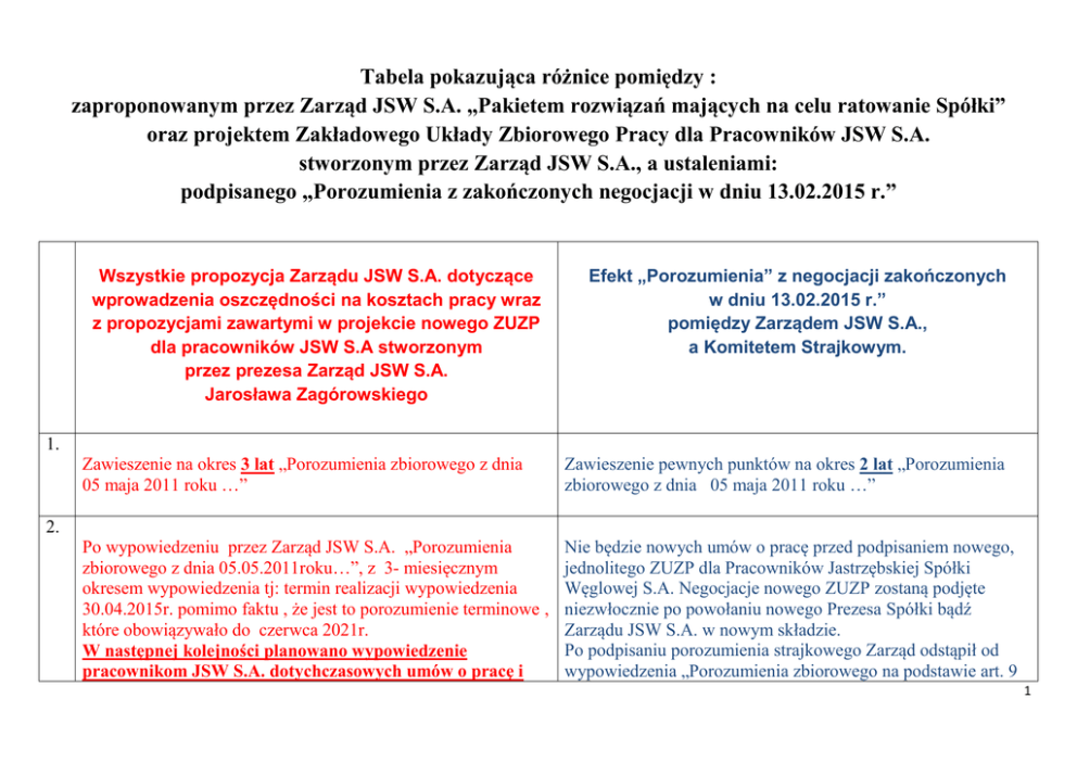 Tabela pokazująca różnice pomiędzy : zaproponowanym przez Zarząd JSW S.A. „Pakietem rozwiązań mających na celu ratowanie Spółki” oraz projektem Zakładowego Układy Zbiorowego Pracy dla Pracowników JSW S.A. stworzonym przez Zarząd JSW S.A., a ustaleniami: podpisanego „Porozumienia z zakończonych negocjacji w dniu 13.02.2015 r.” Wszystkie propozycja Zarządu JSW S.A. dotyczące wprowadzenia oszczędności na kosztach pracy wraz z propozycjami zawartymi w projekcie nowego ZUZP dla pracowników JSW S.A stworzonym przez prezesa Zarząd JSW S.A. Jarosława Zagórowskiego Efekt „Porozumienia” z negocjacji zakończonych w dniu 13.02.2015 r.” pomiędzy Zarządem JSW S.A., a Komitetem Strajkowym. 1. Zawieszenie na okres 3 lat „Porozumienia zbiorowego z dnia 05 maja 2011 roku …” Zawieszenie pewnych punktów na okres 2 lat „Porozumienia zbiorowego z dnia 05 maja 2011 roku …” Po wypowiedzeniu przez Zarząd JSW S.A. „Porozumienia zbiorowego z dnia 05.05.2011roku…”, z 3- miesięcznym okresem wypowiedzenia tj: termin realizacji wypowiedzenia 30.04.2015r. pomimo faktu , że jest to porozumienie terminowe , które obowiązywało do czerwca 2021r. W następnej kolejności planowano wypowiedzenie pracownikom JSW S.A. dotychczasowych umów o pracę i Nie będzie nowych umów o pracę przed podpisaniem nowego, jednolitego ZUZP dla Pracowników Jastrzębskiej Spółki Węglowej S.A. Negocjacje nowego ZUZP zostaną podjęte niezwłocznie po powołaniu nowego Prezesa Spółki bądź Zarządu JSW S.A. w nowym składzie. Po podpisaniu porozumienia strajkowego Zarząd odstąpił od wypowiedzenia „Porozumienia zbiorowego na podstawie art. 9 2. 1 zastąpienie ich umowami na bazie umów zbliżonych do obowiązujących w firmie Szkolenie i Górnictwo od 01.05.2015r. KP z dnia 05.05.2011 r. W nowych umowach prawdopodobnie nie byłoby: Pozostają zapisy : 1. 14-tej pensji uzależnienie od wyników w całości na zawsze. 2. Karty górnika zmiana zapisów na „dodatek stażowy” za faktycznie przepracowany czas pracy i szybsza możliwość jej utraty za jakiekolwiek naruszenie „regulaminu Pracy” oraz niewypłacana za czas postoju, 3. Deputatu węglowego tylko pracownicy pod ziemią w wysokości 4 ton płatnych w 12 miesięcznych ratach. 4. Nagrody Barbórkowej po ocenieniu wyników ekonomicznych i wydobywczych obliczana w mniej korzystny sposób i tak jak w przypadku „dodatku stażowego” utrata części lub całość za uchybienia w stosunku do „Regulaminu pracy” 5. Jubileuszy obniżenie tylko do wysokości maksymalnie 200 % po 30 latach pracy. 6. Odprawy emerytalnych tylko do wysokości 200 % bez względu na staż pracy. 7. Wprowadzenie zapisu czasu pracy tylko w „Regulaminie pracy” tak zwanego efektywnego 8 godz. z odbiciem się na podszybiu. 8. Wynagrodzenie za pracę w soboty, niedziele i święta do czarnej dniówki pracownicy mieli mieć płacony 1. Po okresie zawieszania bez zmian. Patrz zapisy uzgodnione na czas 2 lat zawieszenia pkt. 5 i 6 tabeli. 2. Pozostaje Karta Górnika w takim samym kształcie jak do tej pory. 3. Pozostaje układ 8 ton. Obecnie zostaje zawieszony na dwa lata patrz pkt. 8 tabeli. 4. Nagroda Barbórkowa bez zmian na tych samych zasadach jak do tej pory. 5. Jubileusz na tych samych zasadach do maksymalnie do 400 % po 50 latach pracy. 6. Odprawy emerytalno – rentowe na tych samych zasadach maksymalnie do 500 % po 50 latach pracy. 7. Pozostaje dla prac 7,5 godz. – złożona interwencja do PIP. Na dzień dzisiejszy zwiększony czas pracy na zasadzie komunikatu głównego inżyniera. 8. Sobota, niedziela i święta są dniami wolnymi od pracy i wynagrodzenie według KP oraz z „Z” tką. 2 dodatek wysokości 10 zł za godz. w momencie dobrej sytuacji ekonomicznej firmy. 3. 4. 5. W zakładach JSW S.A. praca będzie wykonywana w dni robocze od poniedziałku do soboty włącznie w przeciętnie pięciodniowym tygodniu pracy. Sobota nie będzie traktowana jako dzień wolny z czego wynika, że będzie opłacana jak normalny dzień roboczy. Dzień wolny od pracy wynikający z rozkładu czasu pracy będzie określany przez Dyrekcję Zakładów JSW S.A. w miesięcznych harmonogramach czasu pracy. Począwszy od 1 lutego 2015r. do końca 2016 r. praca w niedziele i święta oraz w nadgodzinach opłacana będzie na podstawie Kodeksu Pracy. Strony wspólnie wyraziły wolę, że opracują zasady umożliwiające organizację pracy w soboty z wyłączeniem dobrowolności, a praca w soboty wynagradzana będzie płacą dniówkową oraz dodatkiem w wysokości stawki zaszeregowania roboty. Zasady i czas wprowadzenia tego rozwiązania muszą podlegać szczegółowym ustaleniom . W tym celu strony powołają zespół roboczy, który zakończy pracę do końca 2015 r. Praca w niedzielę i święta oraz w nadgodzinach będzie opłacana na dotychczasowych zasadach. Tylko w okresie odrabiania strat praca w soboty i niedziele będzie organizowana na zasadach kodeksowych. Przez okres dwóch lat może obowiązywać wszystkich pracowników 8 – godzinny system czasu pracy jeżeli będzie to zgodne z prawem pracy. Związki Zawodowe złożyły 6/7 dniowy system pracy w kopalniach JSW S.A. powrót do zawiadomienie do Państwowej Inspekcji Pracy o sytemu czterobrygadowego. nieprzestrzeganiu w JSW S.A. prawa pracy zgodnie z art. 128 i 129 Kodeksu Pracy. 14-ta pensja za rok 2014 zostanie wypłacona w czterech 14-ta pensja za rok 2014 zostanie wypłacona w dwóch ratach, jednakowych ratach, wypłacanych w odstępach 12 miesięcznych 40% w lutym 2015 r., 60% we wrześniu 2015 r. począwszy od maja 2016 r. Wypłata 14-tej pensji za lata 2015, Za lata 2015, 2016 i 2017 14-ta pensja zostanie wypłacona w 2016 i 2017 w całości zostanie uzależniona od uzyskania przez wysokości 50% wg. dotychczasowych zasad natomiast JSW S.A. w tych latach zysku. pozostałe 50% zostanie uzależnione od uzyskania przez JSW S.A. zysku. Wypłata 14-tej pensji za lata 2015, 2016 i 2017 