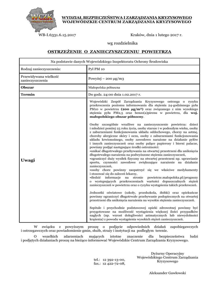 WYDZIAŁ BEZPIECZEŃSTWA I ZARZĄDZANIA KRYZYSOWEGO WOJEWÓDZKIE CENTRUM ZARZĄDZANIA KRYZYSOWEGO WB-I.6331.6.15.2017 Kraków, dnia 1 lutego 2017 r. wg rozdzielnika OSTRZEŻENIE O ZANIECZYSZCZENIU POWIETRZA Na podstawie danych Wojewódzkiego Inspektoratu Ochrony Środowiska Rodzaj zanieczyszczenia: Pył PM 10 Przewidywana wielkość zanieczyszczenia Powyżej – 200 μg/m3 Obszar Małopolska północna Termin Do godz. 24:00 dnia 1.02.2017 r. Wojewódzki Zespół Zarządzania Kryzysowego ostrzega o ryzyku przekroczenia poziomu informowania dla stężenia 24-godzinnego pyłu PM10 w powietrzu (200 µg/m³) oraz związanego z nim wysokiego stężenia pyłu PM2,5 oraz benzo(a)pirenu w powietrzu, dla woj. małopolskiego obszar północny. Uwagi Osoby szczególnie wrażliwe na zanieczyszczenie powietrza: dzieci i młodzież poniżej 25 roku życia, osoby starsze i w podeszłym wieku, osoby z zaburzeniami funkcjonowania układu oddechowego, chorzy na astmę, choroby alergiczne skóry i oczu, osoby z zaburzeniami funkcjonowania układu krwionośnego, osoby zawodowo narażone na działanie pyłów i innych zanieczyszczeń oraz osoby palące papierosy i bierni palacze, powinny podjąć następujące środki ostrożności: •unikać długotrwałego przebywania na otwartej przestrzeni dla uniknięcia długotrwałego narażenia na podwyższone stężenia zanieczyszczeń, •ograniczyć duży wysiłek fizyczny na otwartej przestrzeni np. uprawianie sportu, czynności zawodowe zwiększające narażenie na działanie zanieczyszczeń, •osoby chore powinny zaopatrzyć się we właściwe medykamenty i stosować się do zaleceń lekarzy, •śledzić informacje na stronie powietrze.malopolska.pl/prognozy o występujących przekroczeniach wartości dopuszczalnych stężeń zanieczyszczeń w powietrzu oraz o ryzyku wystąpienia takich przekroczeń. Jednostki oświatowe (szkoły, przedszkola, żłobki) oraz opiekuńcze powinny ograniczyć długotrwałe przebywanie podopiecznych na otwartej przestrzeni dla uniknięcia narażenia na wysokie stężenia zanieczyszczeń. Szpitale i przychodnie podstawowej opieki zdrowotnej powinny być przygotowane na możliwość wystąpienia większej ilości przypadków nagłych (np. wzrost dolegliwości astmatycznych lub niewydolności krążenia) z powodu wystąpienia wysokich stężeń zanieczyszczeń. W związku z powyższym proszę o podjęcie odpowiednich działań zapobiegawczych i ostrzegawczych oraz powiadomienie gmin, służb, straży i instytucji na podległym terenie. O wszelkich zdarzeniach mających istotne znaczenie dla bezpieczeństwa ludzi i podjętych działaniach proszę na bieżąco informować Wojewódzkie Centrum Zarządzania Kryzysowego. tel.: 12 392-13-00, fax.: 12 422-72-08, Dyżurny Operacyjny Wojewódzkiego Centrum Zarządzania Kryzysowego Aleksander Gawłowski [email protected] Rozdzielnik: PCZ Kraków PCZ Wieliczka PCZK Proszowice PCZK Miechów