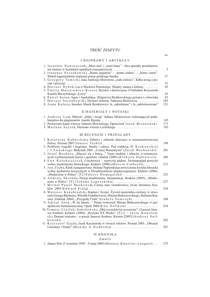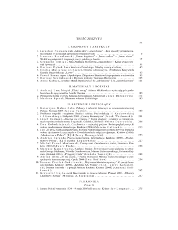 3 TREÆ ZESZYTU Str. I. R O Z P R AW Y I A RT Y K U £ Y 1. J a r o s ³ a w N o w a s z c z u k, Mors atra i mors bona dwa sposoby przedstawiania mierci w ³aciñskich epitafiach renesansowych . . . . . . . . . . . . . . . . . . . . . . . . . . . . 2. I r e n e u s z S z c z u k o w s k i, Homo inquietus homo ardens homo viator. Wokó³ augustyñskich inspiracji poezji polskiego baroku . . . . . . . . . . . . . . . . . . . . . . . . 3. G r z e g o r z T o m i c k i, Jana Andrzeja Morsztyna cuda mi³oci. Kilka uwag o poezji i precyzji . . . . . . . . . . . . . . . . . . . . . . . . . . . . . . . . . . . . . . . . . . . . . . . . . . . . . . . . . . 4. D a r i u s z D y b e k, Las u Wac³awa Potockiego. Miêdzy natur¹ a kultur¹ . . . . . . . . . 5. E m i l i a M u s i e r o w i c z - K i e r e , Strzelec i dziewczyna. O balladzie Krzysztofa Kamila Baczyñskiego £owy . . . . . . . . . . . . . . . . . . . . . . . . . . . . . . . . . . . . . . . . . . . . 6. P a w e ³ S a r n a, Agon i Apokalipsa. Zbigniewa Bieñkowskiego pytania o cz³owieka 7. D a r i u s z S z c z u k o w s k i, Dyskurs mi³osny Tadeusza Ró¿ewicza . . . . . . . . . . . . 8. A n n a K a ³ u ¿ a, Jaros³aw Marek Rymkiewicz: Ja odró¿nione i Ja odró¿nicowane 5 17 31 45 63 83 105 121 II. M AT E R I A £ Y I N O TAT K I 1. A n d r z e j L a m, Metryki Zdañ i uwag Adama Mickiewicza wykazuj¹cych podobieñstwo do epigramatów Anio³a l¹zaka . . . . . . . . . . . . . . . . . . . . . . . . . . . . . . . . . . . . 2. Przeoczone kopie wierszy Juliusza S³owackiego. Opracowa³ J a c e k B r z o z o w s k i 3. M a r l e n a S ê c z e k, Nieznane wiersze Liciñskiego . . . . . . . . . . . . . . . . . . . . . . . . . . 145 171 183 III. R E C E N Z J E I P R Z E G L ¥ D Y 1. K a t a r z y n a K a b a c i ñ s k a, Zabawy i zabawki dzieciêce w osiemnastowiecznej Polsce. Poznañ 2007 (J a n u s z T a z b i r) . . . . . . . . . . . . . . . . . . . . . . . . . . . . . . . . . . . 2. Problemy tragedii i tragizmu. Studia i szkice. Pod redakcj¹ H. K r u k o w s k i e j i J. £ a w s k i e g o. Bia³ystok 2005. Czarny Romantyzm (J a c e k Wa c h o w s k i) 3. J ó z e f B a c h ó r z, Z³¹czyæ siê z burz¹... Tuzin studiów i szkiców o romantycznych wyobra¿eniach morza i egzotyki. Gdañsk (2005) (E l ¿ b i e t a D ¹ b r o w i c z) . 4. E w a K o ³ o d z i e j c z y k, Czechowicz najwy¿ej piêkno. wiatopogl¹d poetycki wobec modernizmu literackiego. Kraków (2006) (M a r c i n C a ³ b e c k i) . . . . . . . . . 5. J a n Z i ê b a, Klerk zaanga¿owany. Stefana Napierskiego nowoczesna krytyka literacka wobec dyskursów krytycznych w Dwudziestoleciu miêdzywojennym. Kraków (2006). Modernizm w Polsce. [T.] 14 (J e r z y D o m a g a l s k i) . . . . . . . . . . . . . . . . . . . . . . 6. A n d r z e j S k r e n d o, Poezja modernizmu. Interpretacje. Kraków (2005). Modernizm w Polsce. [T.] 13 (A n n a L e g e ¿ y ñ s k a) . . . . . . . . . . . . . . . . . . . . . . . . . . . . 7. M i c h a ³ P a w e ³ M a r k o w s ki, Czarny nurt. Gombrowicz, wiat, literatura. Kraków 2005 (E d w a r d F i a ³ a) . . . . . . . . . . . . . . . . . . . . . . . . . . . . . . . . . . . . . . . . . . . . 8. M a t e u s z K a n a b r o d z k i, Kap³an i fryzjer. ¯ywio³ materialno-cielesny w utworach Georga Büchnera, Witolda Gombrowicza, Mirona Bia³oszewskiego, Helmuta Kajzara. (Gdañsk 2004). Przygody Cia³a (I z a b e l a T o m c z y k) . . . . . . . . . . . . . . . . 9. A d r i a n G l e ñ, W tej latarni... Póna twórczoæ Mirona Bia³oszewskiego w perspektywie hermeneutycznej. Opole 2004 (E w a N o f i k o w) . . . . . . . . . . . . . . . . . . . . 10. T o m a s z C i e l a k - S o k o ³ o w s k i, Mój wszechwiat uczyniony. O poezji Janusza Szubera. Kraków (2004). Krytyka XX Wieku. [T.] 2. J e r z y K o w a l e ws k i, Dramat istnienia o poezji Janusza Szubera. Krosno [2005] (A n d r z e j S u l ik o w s k i) . . . . . . . . . . . . . . . . . . . . . . . . . . . . . . . . . . . . . . . . . . . . . . . . . . . . . . . . . . . . . 11. K r z y s z t o f G a j d a, Jacek Kaczmarski w wiecie tekstów. Poznañ 2003. Obszary Literatury i Sztuki (M o n i k a A. S i e d l e c k a) . . . . . . . . . . . . . . . . . . . . . . . . . . . . . IV. K R O N I K A Zmarli 1. Janusz Pelc (5 wrzenia 1930 9 maja 2005) (D a n u t a K ü n s t l e r - L a n g n e r) . . . 199 201 206 213 223 227 238 248 254 262 267 275 4 CONTENTS OF THE FASCICLE Page I. T R E AT I S E S A N D A RT I C L E S 1. J a r o s ³ a w N o w a s z c z u k, Mors atra and mors bona Two Ways of Presenting Death in Renaissance Latin Epitaphs . . . . . . . . . . . . . . . . . . . . . . . . . . . . . . . . . . . . . . . 2. I r e n e u s z S z c z u k o w s k i, Homo inquietus homo ardens homo viator. On the Augustan Inspirations in Polish Baroque . . . . . . . . . . . . . . . . . . . . . . . . . . . . . . 3. G r z e g o r z T o m i c k i, Miracles of Love by Jan Andrzej Morsztyn. A Few Remarks on Poetry and Precision . . . . . . . . . . . . . . . . . . . . . . . . . . . . . . . . . . . . . . . . . . 4. D a r i u s z D y b e k, The Forest in Wac³aw Potockis Works. Between Nature and Culture . . . . . . . . . . . . . . . . . . . . . . . . . . . . . . . . . . . . . . . . . . . . . . . . . . . . . . . . . . . . . . . 5. E m i l i a M u s i e r o w i c z - K i e r e , The Shooter and the Girl. On Krzysztof Kamil Baczyñskis Ballad Chase . . . . . . . . . . . . . . . . . . . . . . . . . . . . . . . . . . . . . . . . . . . . . . 6. P a w e ³ S a r n a, Agon and Apocalypsis. Zbigniew Bieñkowskis Questions Concerning Man . . . . . . . . . . . . . . . . . . . . . . . . . . . . . . . . . . . . . . . . . . . . . . . . . . . . . . . . . . . . . 7. D a r i u s z S z c z u k o w s k i, Tadeusz Ró¿ewiczs Love Discourse . . . . . . . . . . . . . . 8. A n n a K a ³ u ¿ a, Jaros³aw Marek Rymkiewicz: I Differentiated and I Dedifferentiated . . . . . . . . . . . . . . . . . . . . . . . . . . .