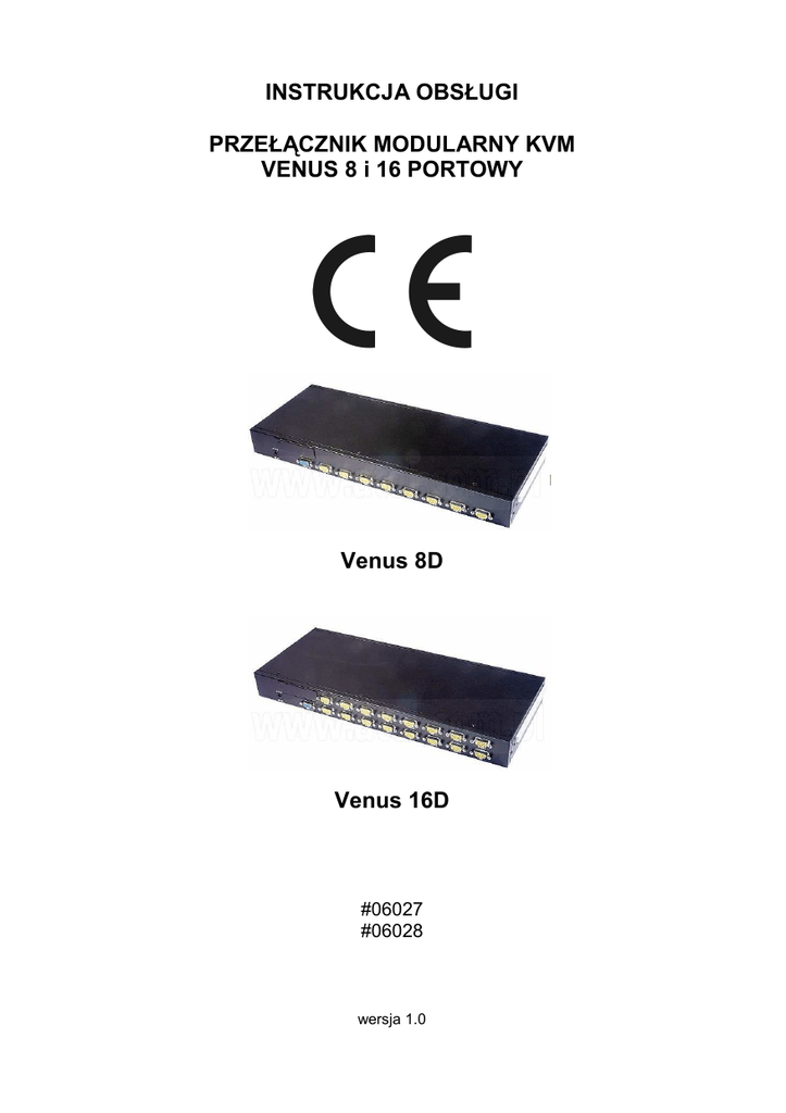 INSTRUKCJA OBSŁUGI PRZEŁĄCZNIK MODULARNY KVM VENUS 8 i 16 PORTOWY Venus 8D Venus 16D #06027 #06028 wersja 1.0 Wstęp Przełączniki KVM są idealnym rozwiązaniem dla administratorów sieci zarządzających wieloma serwerami (platformami). W połączeniu z konsolą KVM KDR, urządzenia umoŜliwiają zarządzanie 8 lub 16 platformami, zapewniając przyjazne i niezawodne środowisko pracy. Przełącznik modularny jest przeznaczony do bezpośredniego podłączenia do złącza na tylnym panelu konsoli KVM, dzięki czemu zestaw jednego przełącznika i konsoli zajmuje tylko 1U miejsca w szafie 19". W przypadku konieczności zarządzania większa liczbą platform niŜ obsługuje 1 przełącznik modularny, naleŜy dokupić samodzielne przełączniki Venus 8 lub Venus 16 i połączyć je specjalnym, dołączonym do zestawu kablem (maksymalnie 8 przełączników). OstrzeŜenie NaleŜy zapewnić bezpieczne warunki pracy urządzenia. Dokonanie przez uŜytkownika jakichkolwiek własnych zmian w urządzeniu moŜe spowodować jego nieprawidłowe funkcjonowanie i utratę gwarancji. Bezpieczeństwo uŜytkowania Urządzenie zostało zaprojektowane i wyprodukowane z najwyŜszą starannością o bezpieczeństwo osób instalujących i uŜytkujących. Dla zapewnienia bezpieczeństwa pracy, naleŜy stosować się do wszelkich wskazań zawartych w tej instrukcji jak i instrukcjach obsługi urządzeń towarzyszących (np. komputera PC). 1. Zawartość opakowania - przełącznik KVM, - zestaw do montaŜu w szafie 19” - niniejsza instrukcja obsługi Podczas dostawy naleŜy upewnić się, czy opakowanie nie jest uszkodzone. W przypadku stwierdzonych uszkodzeń naleŜy niezwłocznie skontaktować się z dostawcą. Prosimy równieŜ o sprawdzenie zgodności zawartości opakowania z powyŜej zamieszczoną listą. 2. Zawartość instrukcji Instrukcja ta zawiera opis przełączników KVM Venus w wersji 8 i 16 portowej z odpowiednimi procedurami instalacji, konfiguracji i uŜytkowania. Przed przystąpieniem do instalacji urządzenia naleŜy dokładnie przeczytać całość tej instrukcji, w szczególności zaś punkty poświęcone bezpieczeństwu. 3. Zasady bezpieczeństwa Przełączniki KVM z serii Venus są zgodne z przepisami w zakresie bezpieczeństwa uŜytkowania urządzeń elektrycznych. - gniazdo sieciowe musi być uziemione zgodnie z obowiązującymi przepisami, - przed przeniesieniem lub wykonywaniem innych operacji technicznych urządzenie naleŜy odłączyć od zasilania, - nie stosować uszkodzonych lub zuŜytych przewodów zasilania, gdyŜ powodują one znaczne zagroŜenie dla bezpieczeństwa uŜytkownika, - prace instalacyjne muszą być wykonywane przez odpowiednio przeszkolony personel techniczny, - nie stosować urządzenia w miejscach występowania substancji łatwopalnych, - zabezpieczyć urządzenie przed dostępem dzieci lub osób niepowołanych, - upewnić się, Ŝe urządzenie zostało odpowiednio zamocowane, 2 - urządzenie traktowane jest jako wyłączone dopiero po odłączeniu przewodów zasilania oraz przewodów łączących je z innymi urządzeniami, - jeśli urządzenie zostanie przeniesione z miejsca chłodnego do ciepłego, w jego wnętrzu moŜe skroplić się para wodna uniemoŜliwiając prawidłowe funkcjonowanie. NaleŜy wówczas odczekać, aŜ wilgoć odparuje. Uwaga: Nie naleŜy dotykać styków gniazd znajdujących się na obudowie urządzenia. Wyładowanie elektrostatyczne moŜe spowodować trwałe uszkodzenie urządzenia. 4. Instalacja sprzętu 4.1. Zasilanie Przełącznik modularny KVM Venus zasilany jest przez zasilacz konsoli do której został podłączony, ze źródła prądu przemiennego ~230V 50Hz. 4.2. Oprogramowanie Przełączniki KVM Venus nie wymagają do pracy dodatkowego oprogramowania. Uwaga: Urządzenia po włączeniu konsoli KVM KDR wymagają podania hasła. Standardowe hasło przypisane urządzeniu to osiem zer – „00000000”. Nie zaleca się zmiany hasła do czasu poznania menu OSD. W przypadku zapomnienia hasła konieczne będzie odesłanie urządzenia do dystrybutora. 4.3. Środowisko pracy NaleŜy zadbać, aby urządzenie umieszczone było w sposób zapewniający dobry przepływ powietrza i łatwy dostęp do portów. Powietrze powinno być wolne od zanieczyszczeń, a urządzenie nie powinno znajdować się w bezpośredniej bliskości źródeł ciepła (piece, grzejniki, bezpośrednie nasłonecznienie), co mogłoby spowodować uszkodzenie urządzenia lub poŜar. Przełącznik nie powinien ponadto być umieszczony w pobliŜu urządzeń generujących zakłócenia elektromagnetyczne (silniki, telewizory itp.). 4.4. MontaŜ przełącznika w szafie 19" Uwagi: Przed przystąpieniem do montaŜu urządzenia naleŜy: • upewnić się, Ŝe zawartość opakowania jest zgodna z listą, a części nie uległy uszkodzeniu w trakcie dostawy (w razie problemu naleŜy się skontaktować z dystrybutorem). • upewnić się, Ŝe wszystkie urządzenia peryferyjne i konsola zostały wyłączone Skład zestawu montaŜowego: • dwa uchwyty montaŜowe z śrubami mocującymi • cztery śruby (6mm) do montaŜu uchwytów 3 4.4.1 Zamontuj uchwyty mocujące z obydwu stron przełącznika. 4.4.2 Wprowadź urządzenie w szynę montaŜową z tylnej strony szafy, bezpośrednio łącząc przełącznik z konsolą (złącze do złącza bez uŜycia jakiegokolwiek kabla). 4.4.3 Dokręć śruby na uchwytach mocujących po obu stronach przełącznika. 4 4.5. Instalacja okablowania Uwaga: Kabel VGA + 2*PS2 do łączenia komputera z przełącznikiem KVM nie naleŜy do zestawu. NaleŜy zakupić go osobno. Aby połączyć przełącznik KVM z komputerem naleŜy: - połączyć przełącznik KVM kablem video (VGA) z komputerem, - podłączyć wtyki PS2 do właściwych gniazd PS2 myszy i klawiatury komputera, - podłączyć zasilacz konsoli do przełącznika i do sieci prądu przemiennego ~230 V 50 Hz. 4.6. Skróty klawiszowe Wciśnij klawisze w ciągu 2 sekund. Komenda Spacja ↑ ↓ [1,2,...,8] 