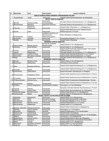 Nazwisko Imię 1 Krysztoforski Józef Lp. stanowisko nazwa instytucji 15 Boniek 16 Budzińska KRZYŻ KAWALERSKI ORDERU ODRODZENIA POLSKI nauczyciel Zespołu Szkół Samochodowych we Włocławku ZŁOTY KRZYŻ ZASŁUGI nauczyciel Ośrodek Szkolno-Wychowawczy nr 2 w Bydgoszczy Krystyna Zofia surdopedagog Marzena kierownik internatu Ośrodek Szkolno-Wychowawczy nr 2 w Bydgoszczy Marzenna Zespół Szkół i Placówek nr 1 w Bydgoszczy Małgorzata nauczyciel Zespół Szkół Mechanicznych, Elektrycznych i Lidia nauczyciel Elektronicznych w Toruniu zastępca dyrektora ds. ekonomicznoPałac Młodzieży w Bydgoszczy Jolanta administarcyjnych Jadwiga nauczyciel Przedszkole Miejskie nr 8 w Toruniu Renata nauczyciel Zespół Szkół w Bysławiu SREBRNY KRZYŻ ZASŁUGI kierownik szkolenia Zespół Szkół nr 12 w Bydgoszczy Maciej Janusz praktycznego Anita Monika nauczyciel Zespół Szkół nr 12 w Bydgoszczy Zespół Szkół Przemysłu Spożywczego i VIII Liceum Janusz Andrzej nauczyciel Ogólnokształcące w Toruniu Małgorzata nauczyciel Ośrodek Szkolno-Wychowawczy nr 2 w Bydgoszczy Jolanta Teresa nauczyciel Zespół Szkół Ogolnokształcących nr 2 w Toruniu Mirosława Jadwiga nauczyciel Zespół Szkół Ogolnokształcących w Tucholi Dariusz nauczyciel Ośrodek Szkolno-Wychowawczy nr 2 w Bydgoszczy BRĄZOWY KRZYŻ ZASŁUGI Barbara Anna nauczyciel Zespół Szkół nr 22 w Bydgoszczy Aleksandra nauczyciel Gimnazjum Gminy Brzuze 17 Dyło Zbigniew Mariusz nauczyciel 18 Formela 19 Kwiecińska Halina Edyta Maria nauczyciel nauczyciel 20 Paczkowska Magdalena Maria nauczyciel 21 Przybylski 22 Przybyszewska Przemysław Tomasz nauczyciel Monika Anna nauczyciel 23 Sylwestrzak 24 Szylbert Monika Kamila Magdalena 25 26 27 28 Danuta Oliwia Zofia Dorota Lucyna Beata 1 Bieniek 2 Boczkowska 3 Figurska 4 Komór 5 Kraszkiewicz 6 Suchecka 7 Szefler 8 Cierzniewski 9 Górecka 10 11 12 13 14 1 2 3 4 5 6 7 8 9 10 11 12 13 14 15 16 Kosicki Lewan Obuchowicz Poturalska Rega wicedyrektor wychowawca świetlicy Zespół Szkół Ogólnokształcących nr 7 w Bydgoszczy Zespół Szkół Ogólnokształcących nr 7 w Bydgoszczy Zespół Placówek Oświatowych w Wielgiem Zespół Szkół Gastronomiczno-Hotelarskich w Toruniu Zespół Szkół Gastronomiczno-Hotelarskich w Toruniu Zespół Szkół Towarzystwa Salezjańskiego Toruniu Zespół Szkół Gastronomiczno-Hotelarskich w Toruniu Gimnazjum nr 2 we Włocławku Adamska Albrecht Banakiewicz Baranowski Barcikowska Specjalny Ośrodek Szkolno-Wychowawczy w Tucholi nauczyciel nauczyciel Zespół Szkół Samochodowych we Włocławku nauczyciel Szkoła Podstawowa nr 37 w Bydgoszczy nauczyciel Zespół Szkół nr 30 Specjalnych w Bydgoszczy MEDAL ZŁOTY ZA DŁUGOLETNIĄ SŁUŻBĘ Aleksandra nauczyciel Zespół Szkół nr 8 w Bydgoszczy Zofia pracownik obsługi Zespół Szkół Zawodowych w Brodnicy Anna pomoc nauczyciela Przedszkole Miejskie nr 16 w Toruniu Bohdan Zenon nauczyciel Szkoła Podstawowa nr 3 w Toruniu Małgorzata nauczyciel Zespół Szkół nr 2 w Grębocinie Bartosz-Jaworska Baśniak Bawolska Bednarczuk Bergmann Biadun Białobrzeski Bilska-Górny Blank Bobrowski Bogucka Barbara Krystyna Janusz Maciej Małgorzata Jolanta Ewa Marek Mariusz Elżbieta Janusz Antoni Krystyna Teresa Arkadiusz Grzegorz Elżbieta Anna Tuschik Ubecka Wojtysiak-Majda Zamorowska nauczyciel nauczyciel dyrektor nauczyciel dyrektor nauczyciel nauczyciel nauczyciel nauczyciel nauczyciel nauczyciel Zespół Szkół Chemicznych w Bydgoszczy Gimnazjum nr 1 w Pruszczu Szkoła Podstawowa nr 6 w Inowrocławiu Zespół Szkół w Kowalewie Zespół Szkół Ogólnokształcących nr 2 w Grudziądzu Gimnazjum nr 9 w Bydgoszczy Zespół Szkół Elektrycznych we Włocławku Szkoła Podstawowa w Kowalewie Pomorskim Zespół Szkół nr 27 w Bydgoszczy Zespół Szkół nr 3 we Włocławku Gimnazjum nr 25 w Bydgoszczy 17 Borczykowska 18 Boruch 19 Braciszewska Bożena Eleonora Danuta Maria Beata sekretarz szkoły nauczyciel dyrektor 20 Brzezińska 21 Brzozowska Danuta Maria Bożena Elżbieta nauczyciel nauczyciel 22 23 24 25 Bułatek Burek Bylińska Całka Grażyna Maria Jolanta Krystyna Jolanta Jadwiga Krystyna nauczyciel nauczyciel nauczyciel nauczyciel 26 27 28 29 30 31 32 33 Chochoł Cieśla Cieślewicz Ciszewska Cysewska Czaplicka Czapska Czerniak Zygmunt Andrzej Krystyna Maria Barbara Irena Maria Iwona Elżbieta Halina Bogumiła Andrzej pracownik obsługi samodzielny referent pracownik obsługi sekretarz szkoły nauczyciel sekretarz szkoły nauczyciel pracownik obsługi 34 35 36 37 38 39 40 Czeszewska Dezor Dobaczewska Dobrzyński Dombrowicz Dornowski Durzyńska Jadwiga Zofia Helena Maria Jolanta Mariusz Jerzy Leszek Marian Elżbieta Jolanta główny księgowy nauczyciel nauczyciel kierownik gospodarczy starszy ratownik dyrektor nauczyciel 41 Dyhid Joanna Ewa pracownik administracji 42 Dziedzic Bożena nauczyciel 43 44 45 46 47 48 49 50 Cezary Ewa Barbara Maciej Jacek Małgorzata Henryk Bogusław Halina Anna Maria nauczyciel sekretarz szkoły dyrektor nauczyciel prcaownik obsługi nauczyciel nauczyciel nauczyciel Joanna Maria Katarzyna Maria Marek Andrzej Krzysztof Bożena pedagog nauczyciel prcaownik obsługi nauczyciel nauczyciel 56 Graczyk 57 Gral 58 Gramowska Hanna Małgorzata Barbara Renata Hanna nauczyciel intendent nauczyciel 59 60 61 62 63 64 65 Danuta Maria Zuzanna Grażyna Teresa Alicja Maria Danuta Teresa Józefa nauczyciel pracownik obsługi nauczyciel nauczyciel starsza księgowa nauczyciel dyrektor Andrzej Kazimierz Teresa Małgorzata Aleksandra Barbara Anna Alicja Maria prcaownik obsługi sekretarz szkoły 51 52 53 54 55 Fanslau Frankowska Gajewski Gierlasińska Gliniecki Głodek Głowacka Głowska GniewkowskaMońko Godek Goliński Gołębiowski Grabowska Grodzicka Groszewska Grubecka Guzicka Guźniczak Jankowska Janocha 66 Jegierski 67 Jelińska 68 Junyk 69 Juras 70 Kaczmarek dyrektor pracownik obsługi nauczyciel Zespół Szkół Ogólnokształcących nr 4 IV Liceum Ogólnokształcące w Toruniu 