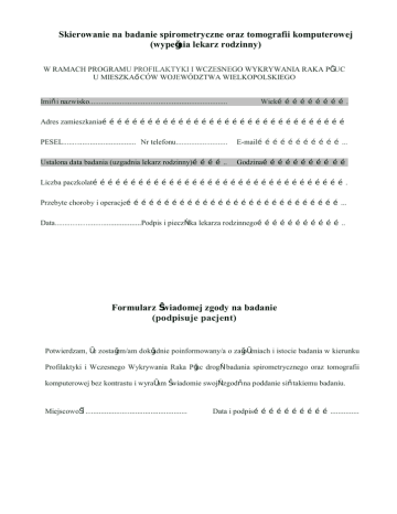Skierowanie na badanie spirometryczne oraz tomografii komputerowej (wypełnia lekarz rodzinny) W RAMACH PROGRAMU PROFILAKTYKI I WCZESNEGO WYKRYWANIA RAKA PŁUC U MIESZKAŃCÓW WOJEWÓDZTWA WIELKOPOLSKIEGO Imię i nazwisko........................................................................ Wiek………………………. Adres zamieszkania…………………………………………………………………………………… PESEL...................................... Nr telefonu........................... E-mail……………………………... Ustalona data badania (uzgadnia lekarz rodzinny)………….. Godzina……………………… …… Liczba paczkolat………………………………………………………………………………………. Przebyte choroby i operacje…………………………………………………………………………... Data.............................................Podpis i pieczątka lekarza rodzinnego…………………………….. Formularz świadomej zgody na badanie (podpisuje pacjent) Potwierdzam, że zostałem/am dokładnie poinformowany/a o założeniach i istocie badania w kierunku Profilaktyki i Wczesnego Wykrywania Raka Płuc drogą badania spirometrycznego oraz tomografii komputerowej bez kontrastu i wyrażam świadomie swoją zgodę na poddanie się takiemu badaniu. Miejscowość..................................................... Data i podpis…………………………............... Zakres danych osobowych powierzonych do przetwarzania na potrzeby zadania pt.” Program Profilaktyki i Wczesnego Wykrywania Raka Płuc” 1. Dane osoby objętej programem: Imię………………………………………………………………………. Nazwisko……………………………………………………………….... Adres zamieszkania lub pobytu………………………………………….. ………………………………………………………………………….... Numer ewidencyjny PESEL……………………………………………… Stan zdrowia……………………………………………………………… Miejscowość……………………… Data i podpis ………………… 2. Wyrażam zgodę na przetwarzania moich danych osobowych w zakresie imię, nazwisko, adres zamieszkania lub pobytu, nr ewidencyjny PESEL, stan zdrowia, podpis w celu uczestnictwa w "Programie Profilaktyki i Wczesnego Wykrywania Raka Płuc". Przyjmuję do wiadomości że: · administratorem danych osobowych jest Marszałek Województwa Wielkopolskiego z siedzibą Urzędu Marszałkowskiego Województwa Wielkopolskiego przy al. Niepodległości 18, 61-713 Poznań · dane przetwarzane będą w celu weryfikacji poprawności przeprowadzenia ww. Programu i archiwizacji · przysługuje mi prawo do treści swoich danych i ich poprawiania · podanie danych osobowych jest dobrowolne Miejscowość……………………… Data i podpis ………………..