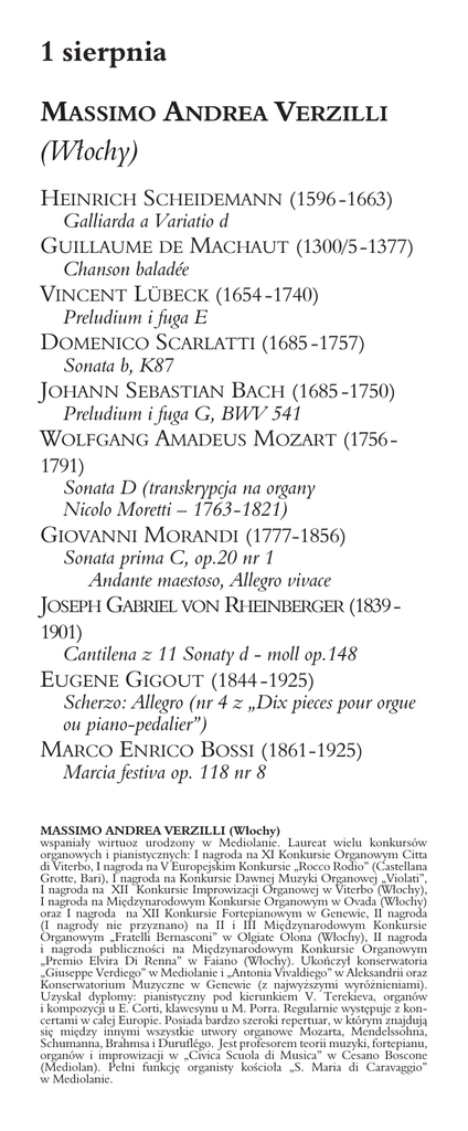 1 sierpnia MASSIMO ANDREA VERZILLI (Włochy) HEINRICH SCHEIDEMANN (1596 -1663) Galliarda a Variatio d GUILLAUME DE MACHAUT (1300/5 -1377) Chanson baladée VINCENT LÜBECK (1654 -1740) Preludium i fuga E DOMENICO SCARLATTI (1685 -1757) Sonata b, K87 JOHANN SEBASTIAN BACH (1685 -1750) Preludium i fuga G, BWV 541 WOLFGANG AMADEUS MOZART (1756 1791) Sonata D (transkrypcja na organy Nicolo Moretti – 1763-1821) GIOVANNI MORANDI (1777-1856) Sonata prima C, op.20 nr 1 Andante maestoso, Allegro vivace JOSEPH GABRIEL VON RHEINBERGER (1839 1901) Cantilena z 11 Sonaty d - moll op.148 EUGENE GIGOUT (1844 -1925) Scherzo: Allegro (nr 4 z „Dix pieces pour orgue ou piano-pedalier”) MARCO ENRICO BOSSI (1861-1925) Marcia festiva op. 118 nr 8 MASSIMO ANDREA VERZILLI (Włochy) wspaniały wirtuoz urodzony w Mediolanie. Laureat wielu konkursów organowych i pianistycznych: I nagroda na XI Konkursie Organowym Citta di Viterbo, I nagroda na V Europejskim Konkursie „Rocco Rodio” (Castellana Grotte, Bari), I nagroda na Konkursie Dawnej Muzyki Organowej „Violati”, I nagroda na XII Konkursie Improwizacji Organowej w Viterbo (Włochy), I nagroda na Międzynarodowym Konkursie Organowym w Ovada (Włochy) oraz I nagroda na XII Konkursie Fortepianowym w Genewie, II nagroda (I nagrody nie przyznano) na II i III Międzynarodowym Konkursie Organowym „Fratelli Bernasconi” w Olgiate Olona (Włochy), II nagroda i nagroda publiczności na Międzynarodowym Konkursie Organowym „Premio Elvira Di Renna” w Faiano (Włochy). Ukończył konserwatoria „Giuseppe Verdiego” w Mediolanie i „Antonia Vivaldiego” w Aleksandrii oraz Konserwatorium Muzyczne w Genewie (z najwyższymi wyróżnieniami). Uzyskał dyplomy: pianistyczny pod kierunkiem V. Terekieva, organów i kompozycji u E. Corti, klawesynu u M. Porra. Regularnie występuje z koncertami w całej Europie. Posiada bardzo szeroki repertuar, w którym znajdują się między innymi wszystkie utwory organowe Mozarta, Mendelssohna, Schumanna, Brahmsa i Duruflégo. Jest profesorem teorii muzyki, fortepianu, organów i improwizacji w „Civica Scuola di Musica” w Cesano Boscone (Mediolan). Pełni funkcję organisty kościoła „S. Maria di Caravaggio” w Mediolanie.