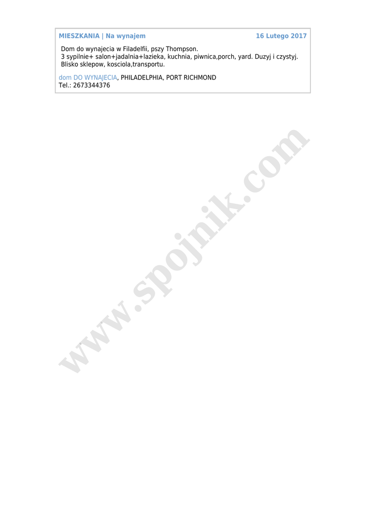 MIESZKANIA | Na wynajem 16 Lutego 2017 Dom do wynajecia w Filadelfii, pszy Thompson. 3 sypilnie+ salon+jadalnia+lazieka, kuchnia, piwnica,porch, yard. Duzyj i czystyj. Blisko sklepow, kosciola,transportu. w w w .s po jn ik .c o m dom DO WYNAJECIA, PHILADELPHIA, PORT RICHMOND Tel.: 2673344376