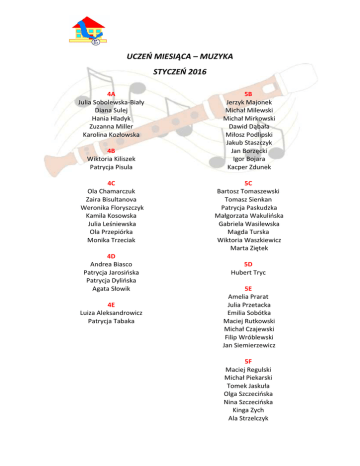 UCZEŃ MIESIĄCA – MUZYKA STYCZEŃ 2016 4A Julia Sobolewska-Biały Diana Sulej Hania Hladyk Zuzanna Miller Karolina Kozłowska 4B Wiktoria Kiliszek Patrycja Pisula 4C Ola Chamarczuk Zaira Bisultanova Weronika Floryszczyk Kamila Kosowska Julia Leśniewska Ola Przepiórka Monika Trzeciak 4D Andrea Biasco Patrycja Jarosińska Patrycja Dylińska Agata Słowik 4E Luiza Aleksandrowicz Patrycja Tabaka 5B Jerzyk Majonek Michał Milewski Michał Mirkowski Dawid Dąbała Miłosz Podlipski Jakub Staszczyk Jan Borzęcki Igor Bojara Kacper Zdunek 5C Bartosz Tomaszewski Tomasz Sienkan Patrycja Paskudzka Małgorzata Wakulińska Gabriela Wasilewska Magda Turska Wiktoria Waszkiewicz Marta Ziętek 5D Hubert Tryc 5E Amelia Prarat Julia Przetacka Emilia Sobótka Maciej Rutkowski Michał Czajewski Filip Wróblewski Jan Siemierzewicz 5F Maciej Regulski Michał Piekarski Tomek Jaskuła Olga Szczecińska Nina Szczecińska Kinga Zych Ala Strzelczyk 6B Jan Łatacz Kacper Pawul Zuzia Rudalska Marysia Zdunek Dawid Piotrowski Kuba Bogdanowicz 6C Filip Matyka Eryk Błażewicz Jędrzej Frątczak Filip Simiński Mukhammad Atashev 6D Bartek Wardziak Maciej Trzeciak Kuba Breński Klaudia Janecka Hania Żaglewska
