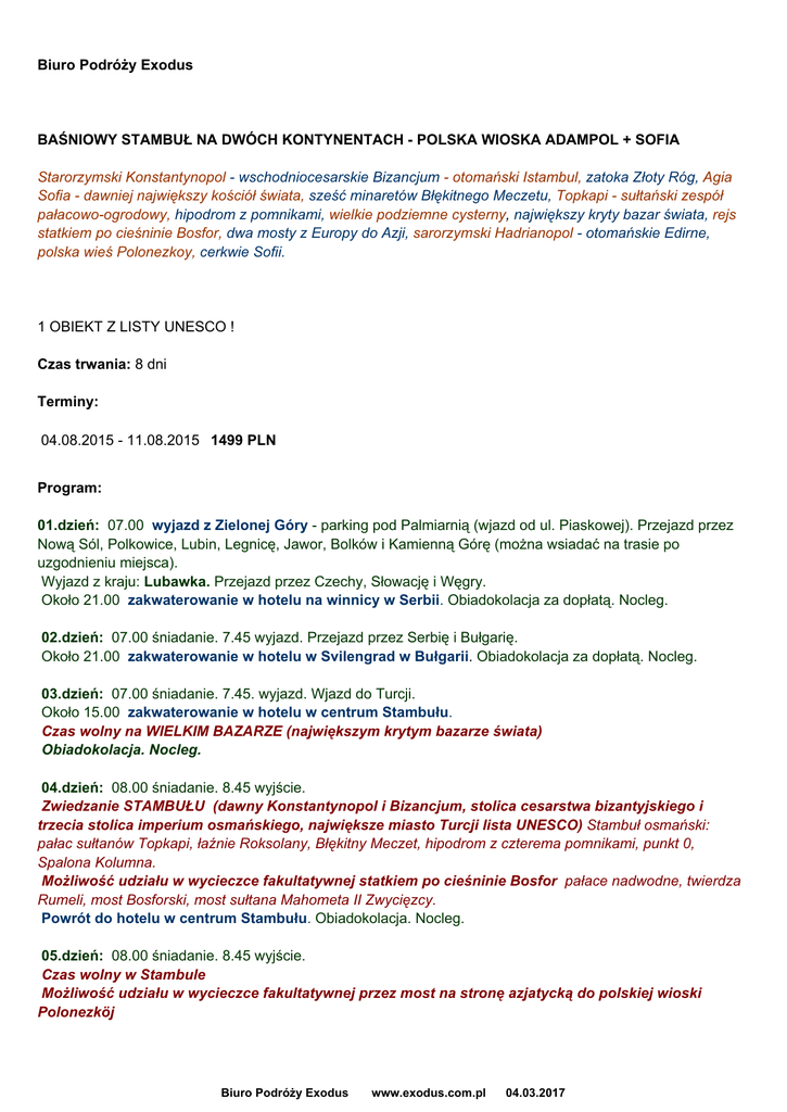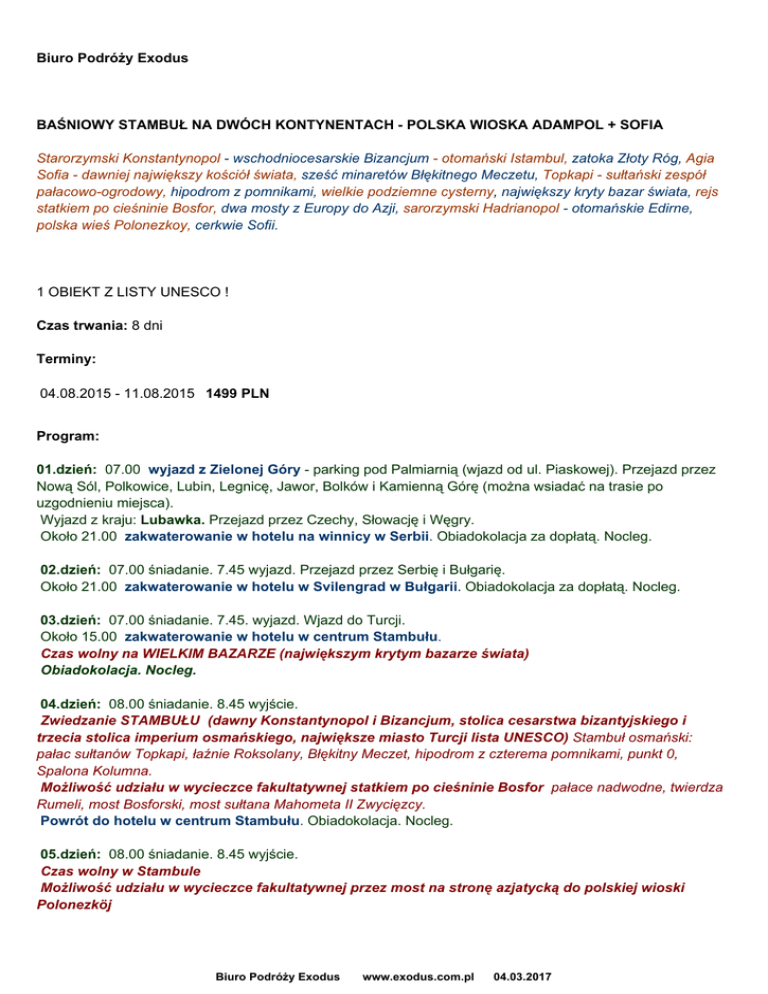 Biuro Podróży Exodus BAŚNIOWY STAMBUŁ NA DWÓCH KONTYNENTACH - POLSKA WIOSKA ADAMPOL + SOFIA Starorzymski Konstantynopol - wschodniocesarskie Bizancjum - otomański Istambul, zatoka Złoty Róg, Agia Sofia - dawniej największy kościół świata, sześć minaretów Błękitnego Meczetu, Topkapi - sułtański zespół pałacowo-ogrodowy, hipodrom z pomnikami, wielkie podziemne cysterny, największy kryty bazar świata, rejs statkiem po cieśninie Bosfor, dwa mosty z Europy do Azji, sarorzymski Hadrianopol - otomańskie Edirne, polska wieś Polonezkoy, cerkwie Sofii. BEZ PRZEJAZDÓW NOCNYCH ! 1 OBIEKT Z LISTY UNESCO ! Czas trwania: 8 dni Terminy: 04.08.2015 - 11.08.2015 1499 PLN Program: 01.dzień: 07.00 wyjazd z Zielonej Góry - parking pod Palmiarnią (wjazd od ul. Piaskowej). Przejazd przez Nową Sól, Polkowice, Lubin, Legnicę, Jawor, Bolków i Kamienną Górę (można wsiadać na trasie po uzgodnieniu miejsca). Wyjazd z kraju: Lubawka. Przejazd przez Czechy, Słowację i Węgry. Około 21.00 zakwaterowanie w hotelu na winnicy w Serbii. Obiadokolacja za dopłatą. Nocleg. 02.dzień: 07.00 śniadanie. 7.45 wyjazd. Przejazd przez Serbię i Bułgarię. Około 21.00 zakwaterowanie w hotelu w Svilengrad w Bułgarii. Obiadokolacja za dopłatą. Nocleg. 03.dzień: 07.00 śniadanie. 7.45. wyjazd. Wjazd do Turcji. Około 15.00 zakwaterowanie w hotelu w centrum Stambułu. Czas wolny na WIELKIM BAZARZE (największym krytym bazarze świata) Obiadokolacja. Nocleg. 04.dzień: 08.00 śniadanie. 8.45 wyjście. Zwiedzanie STAMBUŁU (dawny Konstantynopol i Bizancjum, stolica cesarstwa bizantyjskiego i trzecia stolica imperium osmańskiego, największe miasto Turcji lista UNESCO) Stambuł osmański: pałac sułtanów Topkapi, łaźnie Roksolany, Błękitny Meczet, hipodrom z czterema pomnikami, punkt 0, Spalona Kolumna. Możliwość udziału w wycieczce fakultatywnej statkiem po cieśninie Bosfor pałace nadwodne, twierdza Rumeli, most Bosforski, most sułtana Mahometa II Zwycięzcy. Powrót do hotelu w centrum Stambułu. Obiadokolacja. Nocleg. 05.dzień: 08.00 śniadanie. 8.45 wyjście. Czas wolny w Stambule Możliwość udziału w wycieczce fakultatywnej przez most na stronę azjatycką do polskiej wioski Polonezköj Biuro Podróży Exodus www.exodus.com.pl 04.03.2017 Powrót do hotelu w centrum Stambułu. Obiadokolacja. Nocleg. 6.dzień: 07.00 śniadanie. 07.45 wyjazd. Zwiedzanie EDIRNE (dawny Adrianopol, druga stolica imperium osmańskiego) meczet Selima II Pijaka, meczet Z Trzema Minaretami, pomnik architekta Mimara Sinana. Wyjazd z Turcji. Około 21.00 zakwaterowanie w hotelu w Svilengrad. Obiadokolacja za dopłatą. Nocleg. 07.dzień: 07.00 śniadanie. 7.45 wyjazd. Przejazd przez Bułgarię i Serbię. Zwiedzanie SOFII (stolica Bułgarii) cerkiew katedralna Aleksander Newski, pomnik cara Aleksandra II, cerkiew rosyjska Św.Mikołaja Cudotwórcy, dawny Komitet Centralny Komunistycznej Partii Bułgarii, cerkiew Św.Petka, pomnik Sofii, katedra prawosławna, rzymska rotunda Św.Jerzego, pałac prezydencki, łaźnie tureckie, teatr narodowy. Około 20.00 zakwaterowanie w hotelu w Serbii. Możliwość degustacji win w piwnicach winnych Obiadokolacja za dopłatą. Nocleg. 8.dzień: 07.00 śniadanie. 7.45 wyjazd. Przejazd przez Węgry, Słowację, Czechy. Wjazd do kraju: Lubawka. Około 21.00 rozwiązanie imprezy w Zielonej Górze parking pod Palmiarnią. W cenie: autokar: wysokopokładowy, klimatyzacja, WC, video, napoje zimne i gorące (płatne) około 4700 km noclegi: 7 x hotele**/***- pokoje 2,3osobowe z łaz/WC wyżywienie: 7 śniadań + 3 obiadokolacje pilot BP EXODUS ubezpieczenie NW, KL, bagaż podatek VAT Dodatkowe opłaty: zestawy słuchawkowe (obowiązkowo) - 8 wiza turecka na granicy 20 USD fundusz graniczny, napiwki grupowe 5 4 obiadokolacje (na życzenie) - 30 wycieczki fakultatywne (minimalna ilość uczestników - 20): - wycieczka statkiem po cieśninie Bosfor 15 - polska wioska Polonezköy po stronie azjatyckiej 10 komplet wstępów do obiektów turystycznych równowartość około 40 napiwki indywidualne napoje do obiadokolacji. Uwaga: przy długich przejazdach autokar zatrzymuje się na 15-minutowe postoje każdorazowo po około 4-godzinnej jeździe. Nie bierzemy odpowiedzialności za punkty programu niezrealizowane z przyczyn od nas niezależnych. Wymagany jest paszport ważny w terminie min. do pół roku od dnia zakończenia imprezy. Biuro Podróży Exodus www.exodus.com.pl 04.03.2017