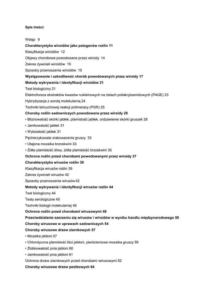 Spis treści: Wstęp 9 Charakterystyka wiroidów jako patogenów roślin 11 Klasyfikacja wiroidów 12 Objawy chorobowe powodowane przez wiroidy 14 Zakres Ŝywicieli wiroidów 15 Sposoby przenoszenia wiroidów 15 Występowanie i szkodliwość chorób powodowanych przez wiroidy 17 Metody wykrywania i identyfikacji wiroidów 21 Test biologiczny 21 Elektroforeza ekstraktów kwasów nukleinowych na Ŝelach poliakryloamidowych (PAGE) 23 Hybrydyzacja z sondą molekularną 24 Techniki łańcuchowej reakcji polimerazy (PGR) 25 Choroby roślin sadowniczych powodowane przez wiroidy 28 • Bliznowatość skórki jabłek, plamistość jabłek, ordzawienie skórki gruszek 28 • Jamkowatość jabłek 31 • Wyboistość jabłek 31 Pęcherzykowate zrakowacenia gruszy 33 • Utajona mozaika brzoskwini 33 • śółta plamistość śliwy, Ŝółta plamistość brzoskwini 35 Ochrona roślin przed chorobami powodowanymi przez wiroidy 37 Charakterystyka wirusów roślin 39 Klasyfikacja wirusów roślin 39 Zakres Ŝywicieli wirusów 42 Sposoby przenoszenia wirusów 42 Metody wykrywania i identyfikacji wirusów roślin 44 Test biologiczny 44 Testy serologiczne 45 Techniki biologii molekularnej 46 Ochrona roślin przed chorobami wirusowymi 48 Przeciwdziałanie szerzeniu się wirusów i wiroidów w wyniku handlu międzynarodowego 50 Choroby wirusowe w uprawach sadowniczych 54 Choroby wirusowe drzew ziarnkowych 57 • Mozaika jabłoni 57 • Chlorotyczna plamistość liści jabłoni, pierścieniowa mozaika gruszy 59 • śłobkowatość pnia jabłoni 60 • Jamkowatość pnia jabłoni 61 Ochrona drzew ziarnkowych przed chorobami wirusowymi 62 Choroby wirusowe drzew pestkowych 64 • Ospowatość (szarka) śliwy 64 • Karłowatość śliwy 67 • Nekrotyczna pierścieniowa plamistość drzew pestkowych 70 • Liściozwój czereśni 72 • Cętkowana plamistość liści czereśni 74 • Zielona pierścieniowa pstrość czereśni 75 • Nekrotyczna rdzawa pstrość czereśni 76 • Drobnienie owoców czereśni 77 • Utajona pierścieniowa plamistość mirabelki 78 • Mozaika wstęgowa śliwy 79 Choroby drzew pestkowych powodowane przez inne polifagiczne gatunki wirusów 80 • Choroba powodowana przez wirus chlorotycznej plamistości liści jabłoni 80 • Choroba powodowana przez wirus pierścieniowej plamistości maliny 81 • Choroba powodowana przez utajony wirus pierścieniowej plamistości truskawki 82 Ochrona drzew pestkowych przed chorobami wirusowymi 83 Choroby wirusowe agrestu i porzeczek 86 • Otaśmienie nerwów agrestu 86 • Rewersja porzeczki czarnej 87 • Deformacja agrestu, łyŜeczkowatość liści porzeczki czerwonej 89 • śółta pstrość porzeczki czarnej 90 • Zielona pstrość liści 91 Ochrona agrestu i porzeczek przed chorobami wirusowymi 92 Choroby wirusowe borówki wysokiej 94 • Nitkowatość borówki wysokiej 94 • Pstrość liści borówki wysokiej 95 • Czerwona pierścieniowa plamistość borówki wysokiej 96 • Oparzelina borówki wysokiej 98 • Szok borówki wysokiej 100 Wirusy polifagiczne występujące na borówce wysokiej 101 • Wirus mozaikowatej rozetowatości brzoskwini 101 • Wirus pierścieniowej plamistości pomidora 102 • Wirus pierścieniowej plamistości tytoniu 103 Ochrona borówki wysokiej przed chorobami wirusowymi 104 Choroby wirusowe maliny 105 • Mozaika maliny 105 • śółtaczka nerwów maliny 106 • Pierścieniowa plamistość maliny 107 • Chloroza nerwów maliny 108 • Krzaczasta karłowatość maliny 109 • śółta karłowatość maliny 110 • Kędzierzawka liści maliny 111 • Choroba powodowana przez wirus liściozwoju czereśni 113 Ochrona maliny przed chorobami wirusowymi 113 Choroby wirusowe truskawki 115 • Choroba powodowana przez utajony wirus C truskawki 115 • Marszczyca truskawki 116 • Otaśmienie nerwów truskawki 117 • Łagodna Ŝółtaczka brzegów liści truskawki 118 • Utajona pierścieniowa plamistość truskawki 119 • Cętkowana pstrość truskawki 120 Ochrona truskawki przed chorobami wirusowymi 121 Tabele 122 Literatura 139 Indeks angielskich nazw gatunków wiroidów i wirusów 142 Indeks polskich nazw gatunków wiroidów i wirusów 143 Indeks polskich nazw chorób powodowanych przez wiroidy i wirusy 145 Systematyka wiroidów i wirusów 147