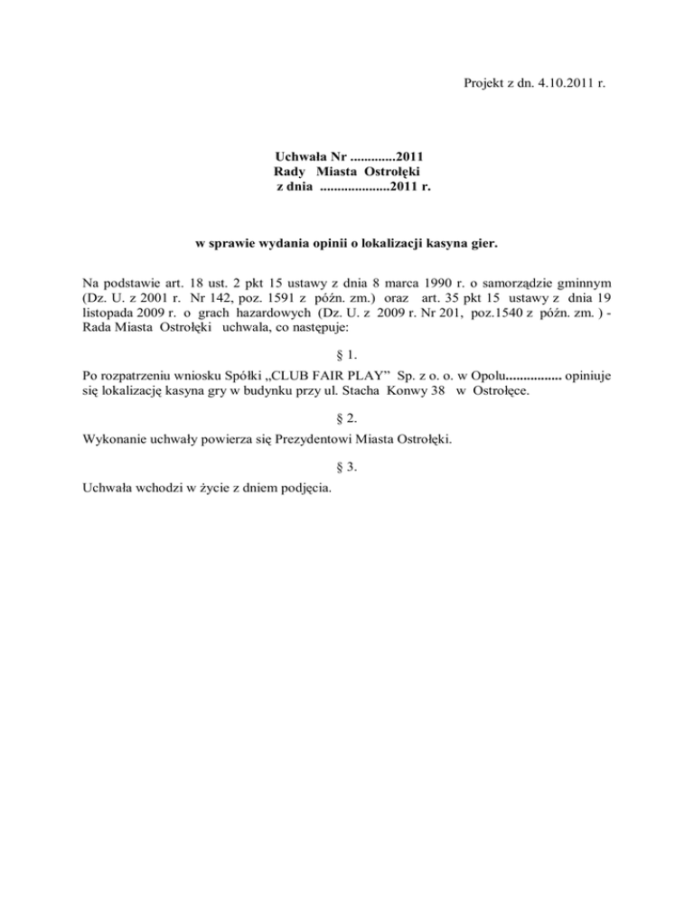 Projekt z dn. 4.10.2011 r. Uchwała Nr .............2011 Rady Miasta Ostrołęki z dnia ....................2011 r. w sprawie wydania opinii o lokalizacji kasyna gier. Na podstawie art. 18 ust. 2 pkt 15 ustawy z dnia 8 marca 1990 r. o samorządzie gminnym (Dz. U. z 2001 r. Nr 142, poz. 1591 z późn. zm.) oraz art. 35 pkt 15 ustawy z dnia 19 listopada 2009 r. o grach hazardowych (Dz. U. z 2009 r. Nr 201, poz.1540 z późn. zm. ) Rada Miasta Ostrołęki uchwala, co następuje: § 1. Po rozpatrzeniu wniosku Spółki „CLUB FAIR PLAY” Sp. z o. o. w Opolu................ opiniuje się lokalizację kasyna gry w budynku przy ul. Stacha Konwy 38 w Ostrołęce. § 2. Wykonanie uchwały powierza się Prezydentowi Miasta Ostrołęki. § 3. Uchwała wchodzi w Ŝycie z dniem podjęcia. Uzasadnienie „CLUB FAIR PLAY sp. z o. o Opole zwróciła się ponownie z wnioskiem o wydanie opinii o lokalizacyjnej dla kasyna gry w budynku przy ulicy Stacha Konwy 38 w Ostrołęce z dnia 18 lipca 2011 roku. Rada Osiedla Łazek na zebraniu w dniu 29 sierpnia 2011 roku pozytywnie zaopiniowała projekt uchwały Rady Miasta Ostrołęki o lokalizacji kasyna gier. Obowiązek uzyskania opinii rady gminy o lokalizacji kasyna wynika z art. 35 pkt 15 ustawy z dnia 19 listopada 2009 r. o grach hazardowych (Dz. U. z 2009 r. Nr 201, poz.1540). Zgodnie z tym przepisem przedsiębiorca składający wniosek do Ministra Finansów o udzielenie zezwolenia na prowadzenie działalności w zakresie kasyna gry powinien załączyć opinię rady gminy o lokalizacji kasyna gier.