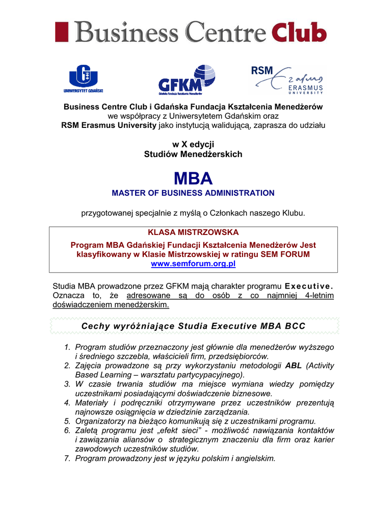 Business Centre Club i Gdańska Fundacja Kształcenia Menedżerów we współpracy z Uniwersytetem Gdańskim oraz RSM Erasmus University jako instytucją walidującą, zaprasza do udziału w X edycji Studiów Menedżerskich MBA MASTER OF BUSINESS ADMINISTRATION przygotowanej specjalnie z myślą o Członkach naszego Klubu. KLASA MISTRZOWSKA Program MBA Gdańskiej Fundacji Kształcenia Menedżerów Jest klasyfikowany w Klasie Mistrzowskiej w ratingu SEM FORUM www.semforum.org.pl Studia MBA prowadzone przez GFKM mają charakter programu E x e c u t i v e . Oznacza to, że adresowane są do osób z co najmniej 4-letnim doświadczeniem menedżerskim. Cechy wyróżniające Studia Executive MBA BCC 1. Program studiów przeznaczony jest głównie dla menedżerów wyższego i średniego szczebla, właścicieli firm, przedsiębiorców. 2. Zajęcia prowadzone są przy wykorzystaniu metodologii ABL (Activity Based Learning – warsztatu partycypacyjnego). 3. W czasie trwania studiów ma miejsce wymiana wiedzy pomiędzy uczestnikami posiadającymi doświadczenie biznesowe. 4. Materiały i podręczniki otrzymywane przez uczestników prezentują najnowsze osiągnięcia w dziedzinie zarządzania. 5. Organizatorzy na bieżąco komunikują się z uczestnikami programu. 6. Zaletą programu jest „efekt sieci” - możliwość nawiązania kontaktów i zawiązania aliansów o strategicznym znaczeniu dla firm oraz karier zawodowych uczestników studiów. 7. Program prowadzony jest w języku polskim i angielskim. Instytucja walidująca program MBA BCC RSM Erasmus University to czołowa światowa szkoła biznesu, która jest częścią słynnego Erasmus University w Holandii. Uczelnia o znakomitym prestiżu – nowoczesna, międzynarodowa szkoła kształcąca menedżerów z całego świata. RSM jest jedną z niewielu szkół biznesu na świecie posiadających potrójną akredytację: ♦ amerykańską: Association to Advance Collegiate Schools of Business – AACSB ♦ europejską: European Foundation for Management Development – EQUIS ♦ brytyjską: Association of MBAs – AMBA Kryteria przyjęcia • • • • Ukończone studia wyższe Co najmniej czteroletnia praktyka zawodowa Pozytywny wynik rozmowy kwalifikacyjnej Komunikatywna znajomość języka angielskiego Termin rozmowy kwalifikacyjnej uzgodniony zostanie z chwilą otrzymania kompletu dokumentów (w tym kwestionariusza zgłoszeniowego, kopii dyplomu ukończenia studiów wyższych, zaświadczenia o zatrudnieniu). Dodatkowe informacje ► Studia trwają 4 semestry (dwa lata, 21 zjazdów, wakacje wolne). Zajęcia odbywają się średnio raz w miesiącu podczas 3-dniowych sesji: piątek-niedziela (piątek: 12:00–18:00, sobota: 09.00–18:00, niedziela: 09:00–14:00). Inauguracja oraz pierwsza sesja rozpoczynają się 21 października 2011r. ► Miejsce zjazdów – siedziba Business Centre Club (Pałac Lubomirskich) w Warszawie. ► Koszt studiów wynosi 10900 zł plus 23% VAT za semestr, wpłata wnoszona jest przed rozpoczęciem każdego semestru Łączny koszt to: 43600 zł + 23%VAT. W ramach opłaty za studia słuchacze otrzymują: możliwość udziału we wszystkich zajęciach programowych, spotkaniach integracyjnych oraz konsultacjach z wykładowcami, pełen zestaw niezbędnych podręczników i materiałów dydaktycznych, obiady, kawę i napoje w trakcie sesji dydaktycznych. ► Po pomyślnym ukończeniu studiów absolwenci otrzymują dyplom MBA podpisany przez wszystkie partnerskie instytucje: Gdańską Fundację Kształcenia Menedżerów, Uniwersytet Gdański, RSM Erasmus University. ► Ze względu na specyfikę zajęć liczba miejsc jest ograniczona do 35. Wszystkich zainteresowanych prosimy o przesyłanie zgłoszeń na poniższe adresy mailowe: e-mail: [email protected] Iwona Serkis, tel.: 22 582 61 34 e-mail: [email protected] Dorota Trzaska, tel.: 22 582 61 31 Na pytania dotyczące organizacji studiów odpowiada w BCC: Andrzej Świderski, Dyrektor NCPG Business Centre Club, tel.: 22 582 61 30, e-mail: [email protected] Na pytania merytoryczne dotyczące programu studiów odpowiada: prof. Wojciech Rybowski, Prezes Zarządu GFKM tel.: 58 558 58 58, 58 552 01 29 faks: 58 557 27 33 lub Aldona Sobierajska, tel.: 58 558 58 58 wew. 385, e-mail: [email protected] Poniżej prezentujemy kilka wypowiedzi absolwentów i uczestników studiów dotyczących oceny realizowanego programu MBA: „Udział w studiach MBA GFKM był jedną z najlepszych decyzji, jakie podjęłam. Wysoki poziom merytoryczny, nowoczesne metody nauczania zapewniające interaktywny udział w zajęciach, możliwość wymiany doświadczeń z wieloma znakomitymi menedżerami reprezentującymi różne branże i dziedziny, to czynniki, które zdecydowanie przemawiają na korzyść GFKM i prowadzonych przez GFKM studiów MBA. Ugruntowały one i poszerzyły moją wiedzę o wiele nowych zagadnień z dziedziny zarządzania, szeroko rozumianego biznesu i Public Relations, co bardzo sobie cenię.” Ewa Beata Basiak, Dyrektor Zarządzający TUiR WARTA S.A. „Studia MBA są doświadczeniem zmieniającym sposób myślenia o biznesie i kształtującym karierę menedżera. Ja i wiele znanych mi osób doświadczyło takiej przemiany po ukończeniu programu MBA w Gdańskiej Fundacji Kształcenia Menedżerów. Program MBA daje możliwość skorzystania z doświadczeń starannie dobranego grona wykładowców GFKM, RSM Erasmus University i innych renomowanych organizacji. Uczestnicy MBA są wyjątkowym źródłem inspiracji na gruncie zawodowymi i prywatnym. GFKM to marka, którą warto mieć w swoim CV i doświadczenie, które warto nabyć, aby nie uczyć się wyłącznie na własnych błędach.” Katarzyna Derenda, Dyrektor Zarządzający, Young Digital Planet, International Operations „Z prawdziwą przyjemnością mogę polecić usługi realizowane przez GFKM każdej ambitnej osobie, która przede wszystkim jest zainteresowana nabyciem wiedzy o zarządzaniu w praktyce. Poziom kształcenia