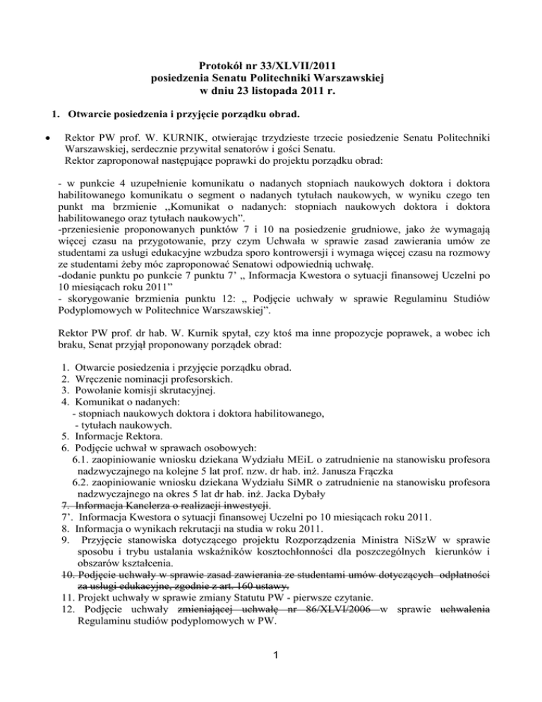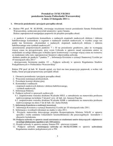Protokół nr 33/XLVII/2011 posiedzenia Senatu Politechniki