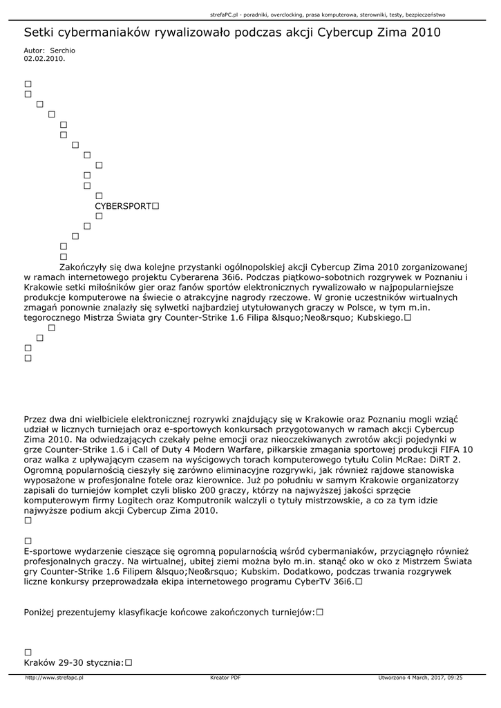 strefaPC.pl - poradniki, overclocking, prasa komputerowa, sterowniki, testy, bezpieczeństwo Setki cybermaniaków rywalizowało podczas akcji Cybercup Zima 2010 Autor: Serchio 02.02.2010. CYBERSPORT Zakończyły się dwa kolejne przystanki ogólnopolskiej akcji Cybercup Zima 2010 zorganizowanej w ramach internetowego projektu Cyberarena 36i6. Podczas piątkowo-sobotnich rozgrywek w Poznaniu i Krakowie setki miłośników gier oraz fanów sportów elektronicznych rywalizowało w najpopularniejsze produkcje komputerowe na świecie o atrakcyjne nagrody rzeczowe. W gronie uczestników wirtualnych zmagań ponownie znalazły się sylwetki najbardziej utytułowanych graczy w Polsce, w tym m.in. tegorocznego Mistrza Świata gry Counter-Strike 1.6 Filipa ‘Neo’ Kubskiego. Przez dwa dni wielbiciele elektronicznej rozrywki znajdujący się w Krakowie oraz Poznaniu mogli wziąć udział w licznych turniejach oraz e-sportowych konkursach przygotowanych w ramach akcji Cybercup Zima 2010. Na odwiedzających czekały pełne emocji oraz nieoczekiwanych zwrotów akcji pojedynki w grze Counter-Strike 1.6 i Call of Duty 4 Modern Warfare, piłkarskie zmagania sportowej produkcji FIFA 10 oraz walka z upływającym czasem na wyścigowych torach komputerowego tytułu Colin McRae: DiRT 2. Ogromną popularnością cieszyły się zarówno eliminacyjne rozgrywki, jak również rajdowe stanowiska wyposażone w profesjonalne fotele oraz kierownice. Już po południu w samym Krakowie organizatorzy zapisali do turniejów komplet czyli blisko 200 graczy, którzy na najwyższej jakości sprzęcie komputerowym firmy Logitech oraz Komputronik walczyli o tytuły mistrzowskie, a co za tym idzie najwyższe podium akcji Cybercup Zima 2010. E-sportowe wydarzenie cieszące się ogromną popularnością wśród cybermaniaków, przyciągnęło również profesjonalnych graczy. Na wirtualnej, ubitej ziemi można było m.in. stanąć oko w oko z Mistrzem Świata gry Counter-Strike 1.6 Filipem ‘Neo’ Kubskim. Dodatkowo, podczas trwania rozgrywek liczne konkursy przeprowadzała ekipa internetowego programu CyberTV 36i6. Poniżej prezentujemy klasyfikacje końcowe zakończonych turniejów: Kraków 29-30 stycznia: http://www.strefapc.pl Kreator PDF Utworzono 4 March, 2017, 09:25 strefaPC.pl - poradniki, overclocking, prasa komputerowa, sterowniki, testy, bezpieczeństwo FIFA 10: 1. Jakub Wójcik 2. Michał Polak 3. Michał Sokolnicki Counter-Strike 1.6: 1. Artur Ostrach 2. Tomasz Sopel 3. Michal Zaborowski DiRT 2: 1. Michal Kłoda - czas 2:06.62 2. Paweł Buńko - czas 2:07.31 3. Paweł Kęseł - czas 2:13.03 Poznań 29-30 stycznia Counter-Strike 1.6: 1. Damian Jaśkowski 2. Michał Librowski 3. Maciej Kmieczyński COD4: 1. Michał Ceglarz 2. Adrian Berger 3. Filip Smolibowski DiRT 2: 1. Radek Chrościński - czas 3:58:56 http://www.strefapc.pl Kreator PDF Utworzono 4 March, 2017, 09:25 strefaPC.pl - poradniki, overclocking, prasa komputerowa, sterowniki, testy, bezpieczeństwo 2. Mateusz Reliszewski - czas 4:01:32 3. Robert Kamiński - czas 4:06:60 Na zwycięzców czekały atrakcyjne nagrody rzeczowe w tym m.in. telefony komórkowe, sprzęt komputerowy firmy Logitech, doładowania 36i6 czy też gry komputerowe od CD Projekt, Codemasters oraz Electronic Arts. Już w najbliższy piątek tj. 5 lutego cybersportowe rozgrywki zagoszczą w Warszawie oraz Wrocławiu. http://www.strefapc.pl Kreator PDF Utworzono 4 March, 2017, 09:25