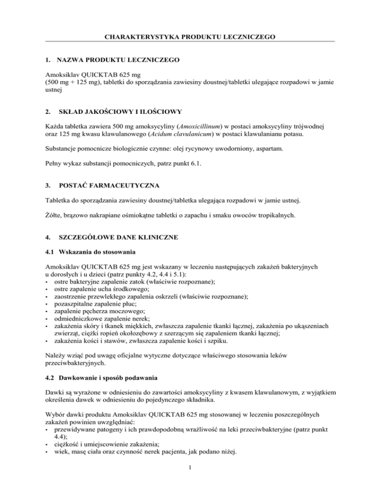 CHARAKTERYSTYKA PRODUKTU LECZNICZEGO 1. NAZWA PRODUKTU LECZNICZEGO Amoksiklav QUICKTAB 625 mg (500 mg + 125 mg), tabletki do sporządzania zawiesiny doustnej/tabletki ulegające rozpadowi w jamie ustnej 2. SKŁAD JAKOŚCIOWY I ILOŚCIOWY Każda tabletka zawiera 500 mg amoksycyliny (Amoxicillinum) w postaci amoksycyliny trójwodnej oraz 125 mg kwasu klawulanowego (Acidum clavulanicum) w postaci klawulanianu potasu. Substancje pomocnicze biologicznie czynne: olej rycynowy uwodorniony, aspartam. Pełny wykaz substancji pomocniczych, patrz punkt 6.1. 3. POSTAĆ FARMACEUTYCZNA Tabletka do sporządzania zawiesiny doustnej/tabletka ulegająca rozpadowi w jamie ustnej. Żółte, brązowo nakrapiane ośmiokątne tabletki o zapachu i smaku owoców tropikalnych. 4. SZCZEGÓŁOWE DANE KLINICZNE 4.1 Wskazania do stosowania Amoksiklav QUICKTAB 625 mg jest wskazany w leczeniu następujących zakażeń bakteryjnych u dorosłych i u dzieci (patrz punkty 4.2, 4.4 i 5.1): ostre bakteryjne zapalenie zatok (właściwie rozpoznane); ostre zapalenie ucha środkowego; zaostrzenie przewlekłego zapalenia oskrzeli (właściwie rozpoznane); pozaszpitalne zapalenie płuc; zapalenie pęcherza moczowego; odmiedniczkowe zapalenie nerek; zakażenia skóry i tkanek miękkich, zwłaszcza zapalenie tkanki łącznej, zakażenia po ukąszeniach zwierząt, ciężki ropień okołozębowy z szerzącym się zapaleniem tkanki łącznej; zakażenia kości i stawów, zwłaszcza zapalenie kości i szpiku. Należy wziąć pod uwagę oficjalne wytyczne dotyczące właściwego stosowania leków przeciwbakteryjnych. 4.2 Dawkowanie i sposób podawania Dawki są wyrażone w odniesieniu do zawartości amoksycyliny z kwasem klawulanowym, z wyjątkiem określenia dawek w odniesieniu do pojedynczego składnika. Wybór dawki produktu Amoksiklav QUICKTAB 625 mg stosowanej w leczeniu poszczególnych zakażeń powinien uwzględniać: przewidywane patogeny i ich prawdopodobną wrażliwość na leki przeciwbakteryjne (patrz punkt 4.4); ciężkość i umiejscowienie zakażenia; wiek, masę ciała oraz czynność nerek pacjenta, jak podano niżej. 1 W razie konieczności należy rozważyć zastosowanie innych postaci lub mocy produktu Amoksiklav, tj. takich, które zawierają większe dawki amoksycyliny i (lub) zawierają amoksycylinę i kwas klawulanowy w innej proporcji (patrz punkty 4.4 i 5.1). Produkt Amoksiklav QUICKTAB 625 mg, stosowany u dorosłych i u dzieci o masie ciała ≥40 kg w sposób zalecony niżej, zapewnia całkowitą dawkę dobową 1500 mg amoksycyliny i 375 mg kwasu klawulanowego, a stosowany u dzieci o masie ciała <40 kg zapewnia całkowitą dawkę dobową 2400 mg amoksycyliny i 600 mg kwasu klawulanowego. W razie stwierdzenia, że konieczne jest zastosowanie większej dobowej dawki amoksycyliny, zaleca się zastosowanie innej postaci produktu Amoksiklav, aby uniknąć niepotrzebnego podawania dużych dawek dobowych kwasu klawulanowego (patrz punkty 4.4 i 5.1). Czas trwania leczenia należy ustalić na podstawie reakcji pacjenta na lek. Niektóre zakażenia (np. szpiku i kości) wymagają dłuższego leczenia. Leczenia nie należy przedłużać ponad 14 dni bez powtórnej kontroli stanu zdrowia pacjenta (patrz informacje o przedłużonym leczeniu w punkcie 4.4). Dorośli i dzieci o masie ciała ≥40 kg Zalecane dawki: jedna tabletka (500 mg + 125 mg) podawana trzy razy na dobę. Dzieci o masie ciała <40 kg Od (20 mg + 5 mg)/kg mc./dobę do (60 mg + 15 mg)/kg mc./dobę w trzech dawkach podzielonych. Dzieciom można podawać produkt Amoksiklav w postaci tabletek, zawiesiny lub saszetek dla dzieci. Preferowanymi postaciami dla dzieci w wieku 6 lat i młodszych są zawiesina lub saszetki. Nie są dostępne dane kliniczne dotyczące stosowania u dzieci w wieku poniżej 2 lat dawek większych niż (40 mg + 10 mg)/kg mc./dobę produktów Amoksiklav zawierających amoksycylinę i kwas klawulanowy w proporcji 4:1. Pacjenci w podeszłym wieku Modyfikacja dawki nie jest konieczna. Pacjenci z zaburzeniami czynności nerek Dawkowanie ustala się na podstawie maksymalnego zalecanego stężenia amoksycyliny. U pacjentów z klirensem kreatyniny (CrCl) większym niż 30 ml/min zmiana dawki nie jest konieczna. Dorośli i dzieci o masie ciała ≥40 kg CrCl 10-30 ml/min Jedna dawka 500 mg + 125 mg podawana dwa razy na dobę CrCl <10 ml /min Jedna dawka 500 mg + 125 mg podawana raz na dobę Hemodializa Jedna dawka 500 mg + 125 mg co 24 godziny, dodatkowo jedna dawka 500 mg + 125 mg w czasie dializy, powtórzona na koniec dializy (ze względu na zmniejszenie się stężenia amoksycyliny i kwasu klawulanowego w surowicy) Dzieci o masie ciała <40 kg CrCl 10-30 ml/min Jedna dawka (15 mg + 3,75) mg/kg mc. podawana dwa razy na dobę (maksymalnie 500 mg + 125 mg dwa razy na dobę) CrCl <10 ml /min (15 mg + 3,75) mg/kg mc. raz na dobę (maksymalnie 500 mg + 125 mg) Hemodializa Jedna dawka (15 mg + 3,75) mg/kg mc. podawana raz na dobę. Przed hemodializą podaje się dodatkowo jedną dawkę (15 mg + 3,75) mg/kg mc. W celu przywrócenia odpowiedniego stężenia leku we krwi, po zakończeniu hemodializy należy podać następną dawkę (15 mg + 3,75) mg/kg mc. 2 Pacjenci z zaburzeniami czynności wątroby Zaleca się zachowanie ostrożności i regularne kontrolowanie czynności wątroby (patrz punkty 4.3 i 4.4). Sposób podawania Tabletki Amoksiklav QUICKTAB 625 mg przeznaczone są do podawania doustnego. Aby zminimalizować występowanie możliwej nietolerancji ze strony przewodu pokarmowego i zoptymalizować wchłanianie amoksycyliny z kwasem klawulanowym, Amoksiklav QUICKTAB 625 mg należy podawać na początku posiłku. Leczenie można rozpocząć produktem w postaci do stosowania pozajelitowego (zgodnie z Charakterystyką Produktu Leczniczego postaci dożylnej) i kontynuować postacią doustną. Przed samym zastosowaniem tabletki należy wymieszać z niewielką ilością wody lub umieścić bezpośrednio w jamie ustnej i połknąć po rozpuszczeniu.