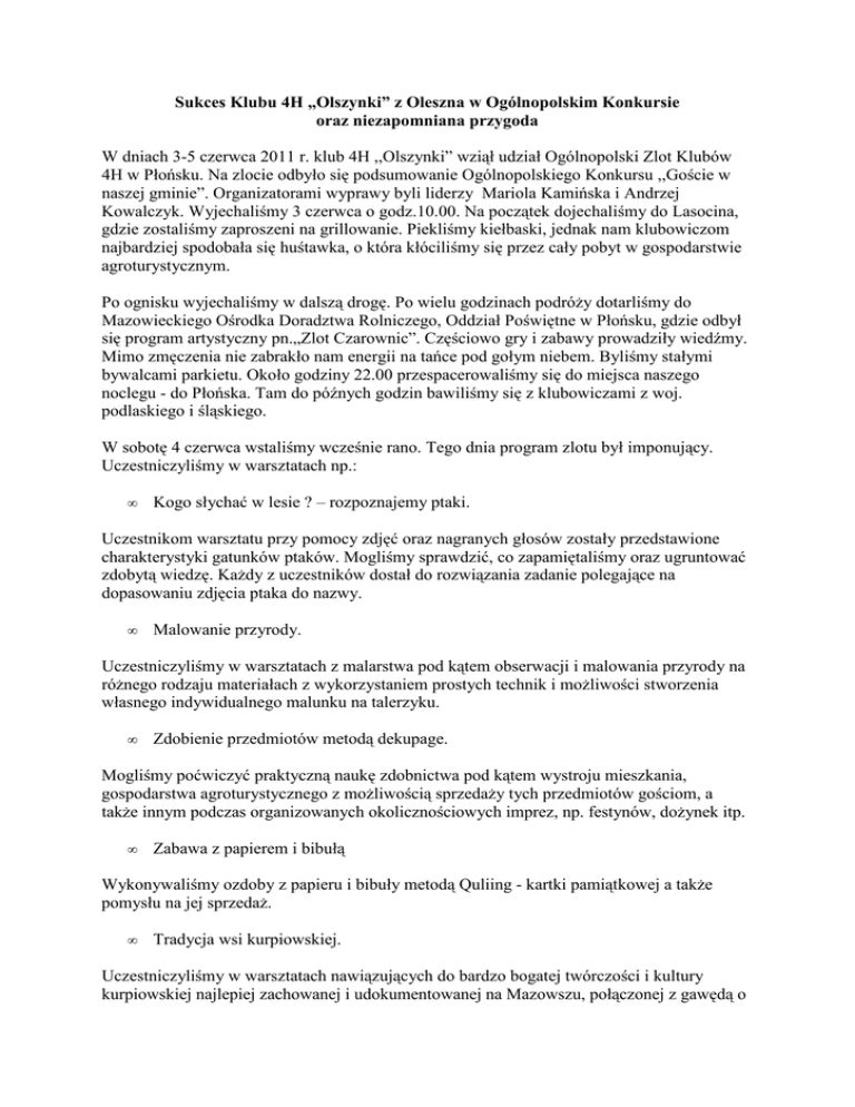 Sukces Klubu 4H „Olszynki” z Oleszna w Ogólnopolskim Konkursie oraz niezapomniana przygoda W dniach 3-5 czerwca 2011 r. klub 4H ,,Olszynki” wziął udział Ogólnopolski Zlot Klubów 4H w Płońsku. Na zlocie odbyło się podsumowanie Ogólnopolskiego Konkursu ,,Goście w naszej gminie”. Organizatorami wyprawy byli liderzy Mariola Kamińska i Andrzej Kowalczyk. Wyjechaliśmy 3 czerwca o godz.10.00. Na początek dojechaliśmy do Lasocina, gdzie zostaliśmy zaproszeni na grillowanie. Piekliśmy kiełbaski, jednak nam klubowiczom najbardziej spodobała się huśtawka, o która kłóciliśmy się przez cały pobyt w gospodarstwie agroturystycznym. Po ognisku wyjechaliśmy w dalszą drogę. Po wielu godzinach podróży dotarliśmy do Mazowieckiego Ośrodka Doradztwa Rolniczego, Oddział Poświętne w Płońsku, gdzie odbył się program artystyczny pn.„Zlot Czarownic”. Częściowo gry i zabawy prowadziły wiedźmy. Mimo zmęczenia nie zabrakło nam energii na tańce pod gołym niebem. Byliśmy stałymi bywalcami parkietu. Około godziny 22.00 przespacerowaliśmy się do miejsca naszego noclegu - do Płońska. Tam do późnych godzin bawiliśmy się z klubowiczami z woj. podlaskiego i śląskiego. W sobotę 4 czerwca wstaliśmy wcześnie rano. Tego dnia program zlotu był imponujący. Uczestniczyliśmy w warsztatach np.: • Kogo słychać w lesie ? – rozpoznajemy ptaki. Uczestnikom warsztatu przy pomocy zdjęć oraz nagranych głosów zostały przedstawione charakterystyki gatunków ptaków. Mogliśmy sprawdzić, co zapamiętaliśmy oraz ugruntować zdobytą wiedzę. Każdy z uczestników dostał do rozwiązania zadanie polegające na dopasowaniu zdjęcia ptaka do nazwy. • Malowanie przyrody. Uczestniczyliśmy w warsztatach z malarstwa pod kątem obserwacji i malowania przyrody na różnego rodzaju materiałach z wykorzystaniem prostych technik i możliwości stworzenia własnego indywidualnego malunku na talerzyku. • Zdobienie przedmiotów metodą dekupage. Mogliśmy poćwiczyć praktyczną naukę zdobnictwa pod kątem wystroju mieszkania, gospodarstwa agroturystycznego z możliwością sprzedaży tych przedmiotów gościom, a także innym podczas organizowanych okolicznościowych imprez, np. festynów, dożynek itp. • Zabawa z papierem i bibułą Wykonywaliśmy ozdoby z papieru i bibuły metodą Quliing - kartki pamiątkowej a także pomysłu na jej sprzedaż. • Tradycja wsi kurpiowskiej. Uczestniczyliśmy w warsztatach nawiązujących do bardzo bogatej twórczości i kultury kurpiowskiej najlepiej zachowanej i udokumentowanej na Mazowszu, połączonej z gawędą o zachowanych wierzeniach, wróżbach i lokalnych zwyczajach, jakie są pielęgnowane i przekazywane młodemu pokoleniu. Samodzielnie wykonaliśmy różnorodne ozdóbki do dekoracji domu, a także wystroju ogrodu zapoznaliśmy się również z wypróbowanymi metodami promocji i reklamy. • Dziedzictwo kulturowe - Ocalmy od zapomnienia Tematyka tego warsztatu przybliżyła nam zakres różnorodnych robótek z wykorzystaniem prostych materiałów dostępnych w każdym domu. Sztandarowych wyrobów proponowanych do własnoręcznego wykonania to drzewko szczęścia wykonane z miękkiego drutu, gałązek, kolorowych kamieni, grosików i muszli. • Ozdabianie ramek do zdjęć metodą scrapbookingu.. Scrapbooking jest sztuką ręcznego tworzenia i dekorowania głównie albumów ze zdjęciami i pamiątkami rodzinnymi. Ozdabialiśmy pudełka i szereg innych przedmiotów - to technika ozdabiania, komponowania odpowiedniego tła dla zdjęć, aby nie były one tylko zadrukowana kartką, ale również aby przypominały nam te najpiękniejsze chwile w życiu. Album wykonany techniką scrapbookingu można ozdabiać na wiele sposobów. W scrapbookingu nie ma określonych reguł, zasady tworzenia są dowolne, najważniejsza jest własna inwencja. Część osób preferuje, gdy zdjęcie znajduje się w centrum, dla innych zdjęcie jest tylko pretekstem do dobrej zabawy na kartach albumów. Im bardziej kreatywny twórca, tym ciekawszy efekt końcowy. w Polsce, technika ta jest jeszcze mało znana, choć coraz bardziej popularna może być wykorzystana do wykonania kartek okolicznościowych i prowadzenia kroniki w gospodarstwie agroturystycznym • Ręczne zdobienie pudełek i torebek na prezenty. Nauczyliśmy się zdobienia pudełek i torebek na prezenty okolicznościowe z wykorzystaniem prostych technik malarskich. Pudełka i torebki można wykorzystać jako opakowania na prezenty dla gości lub sprzedawać gościom jako pamiątki z pobytu w danej miejscowości. • Organizacja aktywnej formy wypoczynku. Nauczyliśmy się praktycznego planowania aktywnych form wypoczynku dla dzieci i młodzieży z uwzględnieniem wieku i lokalnych atrakcji. Np. wykorzystanie ścieżek rowerowych i ścieżek edukacyjnych z przestrzeganiem zasad bezpieczeństwa. Wyszukiwania atrakcji w swoim terenie i promocja własnego miejsca zamieszkania tak aby zachęcić innych do przyjazdu a może także wypoczynku w naszej gminie. • „Gram, grasz, zagrajmy razem” Poznaliśmy kilka bardzo ciekawych gier planszowych - odwiedzimy pingwiny na Antarktydzie, pościągamy się z żółwiami, będziemy mogli budować i burzyć na czas. • Dziedzictwo kulturowe a rozwój turystyki Przypomnienie młodemu pokoleniu jak ważne w turystyce jest dziedzictwo kulturowe poprzez prezentację wykonanych własnoręcznie rzeźb. Zobaczyliśmy prace, materiały i narzędzia pracy rzeźbiarza. Ciekawym punktem programu był występy prześmiesznego ,,Hugo” który przez zabawę zapoznawał nas z pracą policji, strażaków i leśników. Było mnóstwo konkursów tanecznych oraz zgadywanek. Odbywały się występy grup tanecznych i kabaretowych klubowiczów z każdego zakamarka Polski. Każdy z klubowiczów znalazł coś dla siebie, a zdobyte umiejętności zabieraliśmy, by nauczyć innych, a warto ! Jednak nasza grupa z niepokojem oczekiwała na ogłoszenie wyników Og