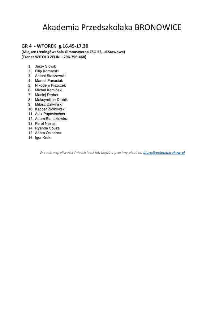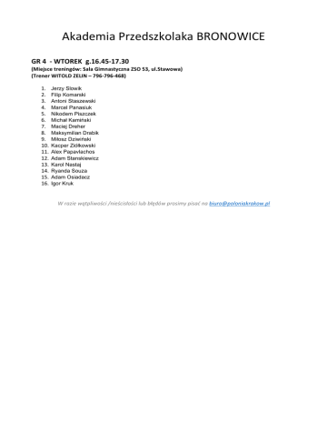 AkademiaPrzedszkolakaBRONOWICE GR4-WTOREKg.16.45-17.30 (Miejscetreningów:SalaGimnastycznaZSO53,ul.Stawowa) (TrenerWITOLDZELIN–796-796-468) 1. 2. 3. 4. 5. 6. 7. 8. 9. 10. 11. 12. 13. 14. 15. 16. Jerzy Slowik Filip Komarski Antoni Staszewski Marcel Panasiuk Nikodem Piszczek Michał Kamiński Maciej Dreher Maksymilian Drabik Miłosz Dziwiński Kacper Ziółkowski Alex Papavlachos Adam Stanskiewicz Karol Nastaj Ryanda Souza Adam Osiadacz Igor Kruk Wraziewątpliwości/nieścisłościlubbłędówprosimypisać[email protected]