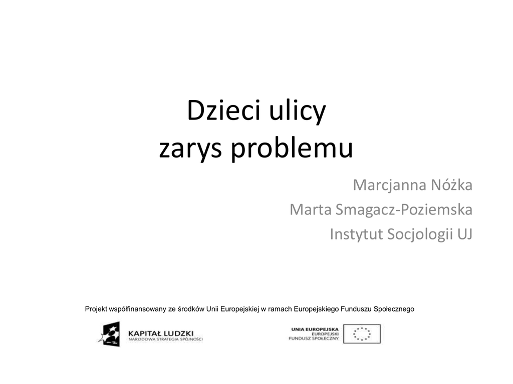 Dzieci ulicy zarys problemu Marcjanna Nóżka Marta Smagacz-Poziemska Instytut Socjologii UJ Projekt współfinansowany ze środków Unii Europejskiej w ramach Europejskiego Funduszu Społecznego Pojęcie „DZIECI ULICY” Wiedza potoczna Dyskurs naukowy Stygmatyzacja („ulicznicy” „wąchacze kleju” „łachmaniarze” „chuligani”) Próba destygmatyzacji poprzez naukowy opis, wyjaśnienie, kategoryzację Wielość paradygmatów teoretycznych Kontekstualność (warunki społeczne, ekonomiczne, polityczne itd.) Wielość perspektyw (dyscyplin) Dzieci ulicy Wybrane kryteria analizy zjawiska stosowane w badaniach • • • • Materialna sytuacja dzieci i ich rodziny Dysfunkcyjność rodziny Zaburzona relacja „dzieci – dorośli” Funkcja „ulicy” w procesie socjalizacji dziecka (miejsce życia, pracy, wychowania, rozrywki itd.) • Intensywność związku dziecka z „ulicą” • Przyczyny „wchodzenia” dziecka na ulicę Typologia na podstawie badań w Krakowie Ze względu na więź i relacje z rodziną (opiekunem, instytucją) • dzieci pozostające w takiej relacji, tj. „dzieci podłączone” • dzieci niezwiązane z rodziną (oderwane od rodziny/opiekuna/instytucji), tj. „dzieci odłączone”; Ze względu na więź z przestrzenią: • „dzieci translokalne” (niezakorzenione, przemieszczające się) • „dzieci interlokalne” (zakorzenione, osadzone w przestrzeni). Ze względu na styl życia: • „wędrowne ptaki” (tzw. włóczący styl życia), • „dzieci dzielnicy” (tzw. osiadły styl życia, zakorzenienie w przestrzeni, silna tendencja do autogettyzacji) • „flaneurzy-konsumenci” (nieletni spędzający godziny w galeriach handlowych, zachowujący się jak „spacerowicze”). Elementy wspólne wizerunku dzieci ulicy na podstawie badań w Krakowie Dysfunkcje rodziny Pozostawanie poza systemem instytucji społecznych Przebywanie i funkcjonowanie w przestrzeni publicznej i komercyjnej Opis Nienormatywny charakter pojęcia Ocena Wskazanie problemowości zjawiska