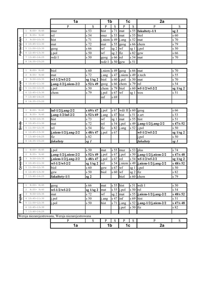 1a 1b Poniedziałek P 1 8:00- 8:45 2 8:55- 9:40 3 9:50-10:35 4 10:45-11:30 5 11:50-12:35 6 12:45-13:30 7 13:40-14:25 S Wtorek 8:00- 8:45 2 8:55- 9:40 3 9:50-10:35 4 10:45-11:30 5 11:50-12:35 6 12:45-13:30 2a S s 71 s 53 s 49 s 55 sg 2 sg 2 s 66 s 50 P mat mat j.ang geog wf fiz rel gzw S s 55 s 55 s 52 s 66 sg 1 s 82 s 54 s 51 P fakultety-1/1 biol mat chem j.pol gzw mat S sg 2 s 60 s 70 s 79 s 50 s 66 s 70 muz rel hist mat geog j.pol wdż I s 53 s 54 s 71 s 72 s 66 s 50 s 50 biol mat wf-1/2/wf-2/2 j.ang-1/2/j.niem-2/2 j.pol chem s 60 s 72 sg 1/sg 2 s 52/s 49 s 50 s 79 j.niem j.ang biol geog chem j.pol inf s 49 s 47 s 60 s 66 s 79 s 67 s 69 geog j.niem j.pol chem biol wf s 66 s 49 s 50 s 79 s 60 sg 1 mat z.tech mat rel wf-1/2/wf-2/2 wos s 70 s 55 s 70 s 54 sg 1/sg 2 s 51 inf-1/2/j.ang-2/2 j.ang-1/2/inf-2/2 hist mat rel j.niem-1/2/j.ang-2/2 fiz fakultety s 69/s 47 s 52/s 69 s 73 s 72 s 54 s 48/s 47 s 82 sg 1 j.pol j.ang wf rel fiz j.pol s 67 s 47 sg 1 s 54 s 82 s 67 wdż II hist mat j.pol j.ang s 60 s 51 s 55 s 49 s 52 geog z.art hist j.ang-1/2/j.ang-2/2 j.pol wf-1/2/wf-2/2 j.pol fakultety s 66 s 53 s 51 s 47/s 52 s 50 sg 1/sg 2 s 50 sg 1 j.pol j.ang-1/2/j.niem-2/2 j.niem-1/2/j.ang-2/2 wf-1/2/wf-2/2 biol gzw fakultety-1/1 s 50 s 52/s 49 s 48/s 47 sg 1/sg 2 s 60 s 50 sg 2 mat j.pol j.pol rel gzw biol s 55 s 67 s 67 s 54 s 67 s 60 muz j.pol rel j.niem wf wf biol s 53 s 50 s 54 s 49 sg 1 sg 2 s 60 plas j.ang-1/2/j.niem-2/2 wf-1/2/wf-2/2 j.niem-1/2/j.ang-2/2 j.pol fiz chem s 74 s 47/s 48 sg 1/sg 2 s 48/s 52 s 50 s 82 s 79 geog wf-1/2/wf-2/2 mat j.pol j.pol s 66 sg 1/sg 2 s 72 s 50 s 50 mat mat wf j.ang hist s 55 s 55 sg 2 s 47 s 71 hist j.pol mat inf j.ang j.pol s 51 s 50 s 55 s 69 s 52 s 50 wdż I rel j.niem-1/2/j.ang-2/2 hist j.ang-1/2/j.niem-2/2 fiz s 50 s 54 s 48/s 52 s 51 s 47/s 48 s 82 8 14:35-15:20 1 1c P hist muz j.niem mat wf wf geog wdż I 7 13:40-14:25 Środa 8 14:35-15:20 1 8:00- 8:45 2 8:55- 9:40 3 9:50-10:35 4 10:45-11:30 5 11:50-12:35 6 12:45-13:30 7 13:40-14:25 Czwartek 8 14:35-15:20 1 8:00- 8:45 2 8:55- 9:40 3 9:50-10:35 4 10:45-11:30 5 11:50-12:35 6 12:45-13:30 Piątek 7 13:40-14:25 1 8:00- 8:45 2 8:55- 9:40 3 9:50-10:35 4 10:45-11:30 5 11:50-12:35 6 12:45-13:30 7 13:40-14:25 Wersja niezarejestrowana, Wersja niezarejestrowana P S 1a P S 1b P S 1c P S 2a 2b 2c P S 3a P S P 3b j.ang chem z.art mat mat j.pol j.pol rel S s 47 s 79 s 53 s 70 s 70 s 67 s 67 s 54 P j.pol j.pol j.ang-1/2/wf-2/2 z.art mat rel wdż II s 55 s 70 s 66 sg 1 s 67 s 69 s 60 j.pol geog mat wf-1/2/j.niem-2/2 rel j.niem-1/2/wf-2/2 z.tech wdż I j.ang-1/2/j.niem-2/2 chem j.niem-1/2/j.ang-2/2 hist mat wf-1/2 wf-1/2 s 60 s 47/s 49 s 79 s 49/s 52 s 51 s 70 sg 1 sg 1 wdż II j.ang-1/2/j.niem-2/2 rel j.niem-1/2/j.ang-2/2 mat wos fiz gzw s 71/s 48 s 54 s 48/s 71 s 82 s 51 s 82 s 82 wf-2/2 gzw j.ang-1/2/j.niem-2/2 z.tech mat mat wos fiz sg 2 s 54 s 47/s 49 s 55 s 70 s 70 s 51 s 82 fakultety-1/1 biol rel j.pol hist z.tech mat chem sg 1 s 60 s 54 s 67 s 51 s 55 s 82 s 79 z.tech mat geog wf j.pol inf biol wf-1/2 fakultety-1/1 j.ang-1/2/j.ang-2/2 j.pol j.pol rel chem sg 1 sg 1 s 47/s 52 s 67 s 67 s 54 s 79 j.ang-1/2 j.niem-1/2/j.ang-2/2 j.pol wf-1/2/wf-2/2 chem fiz s 71 s 48/s 71 s 67 sg 1/sg 2 s 79 s 82 hist s 51 chem-1/fiz-2 s 79/s82 edb s 53 j.niem s 48 wf sg 1 j.pol mat mat chem-1/fiz-2 wf-1/2/j.niem-2/2 inf-1/2/j.ang-2/2 j.ang-1/2/inf-2/2 fakultety fakultety plas z.art mat j.niem-1/2/j.ang-2/2 wf-2/2 wf-2/2 sg 1 s 74 s 53 s 70 s 49/s 52 sg 1 sg 1 fakultety z.art plas mat mat j.pol sg 1 s 53 s 74 s 82 s 82 s 67 hist mat mat j.pol j.ang j.niem fiz s 51 s 70 s 70 s 67 s 47 s 48 s 82 fakultety wos hist edb j.niem-1/2/wf-2/2 chem rel hist geog fiz j.pol j.pol biol s 54 s 51 s 66 s 82 s 67 s 67 s 60 wf-1/2/wf-2/2 geog hist j.pol wf-1/2/wf-2/2 j.ang-1/2/j.niem-2/2 j.ang-2/2 sg 1/sg 2 s 66 s 51 s 67 sg 1/sg 2 s 71/s 48 s 71 wdż II gzw wf wf rel wos j.pol s 47 sg 1 sg 1 s 54 s 51 s 67 P S 2b P S 2c P S 3a j.pol mat gzw wf-1/2/j.ang-2/2 hist biol fiz P 3b 3b 3c S S s 73 s 73 s 47/sg 2 s 53 s 72 s 54 mat j.ang-1/2/inf-2/2 inf-1/2/j.niem-2/2 wf-1/2/wf-2/2 rel mat hist wdż II s 72 s 52/s 69 s 69/s 48 sg 2/sg 1 s 54 s 72 s 51 s 73 s 66 s 72 sg 2/s 48 s 54 s 48/sg 2 s 55 mat j.pol j.niem-1/2/j.ang-2/2 j.pol j.ang-1/2/j.niem-2/2 biol chem z.tech s 72 s 50 s 48/s 52 s 50 s 52/s 48 s 60 s 79 s 55 s 73 s 72 s 72 s 79/s82 sg 2/s 48 s 69/s 52 s 47/s 69 sg 2 z.art geog chem-1/fiz-2 edb mat j.pol wf-1/2/wf-2/2 fakultety s 53 s 66 s 79/s82 s 53 s 72 s 50 sg 2/sg 1 sg 2 sg 2 s 51 s 51 s 53 s 48/sg 2 s 79 gzw wf-1/2/wf-2/2 j.pol wos hist s 52 sg 2/sg 1 s 50 s 51 s 51 s 73 s 72 s 73 sg 2/s 52 s 51 s 60 s 82 mat j.niem-1/2/j.ang-2/2 j.pol rel fiz fakultety s 72 s 48/s 52 s 50 s 54 s 82 sg 1 S 3b P P S 3c