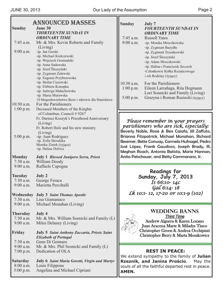 JUNE 30, 2013 Sunday 7:45 a.m. 9:00 a.m. 10:30 a.m. 1:00 p.m. 5:00 p.m. ANNOUNCED MASSES June 30 THIRTEENTH SUNDAY IN ORDINARY TIME Mr. & Mrs. Kevin Roberts and Family (Living) -śp. Jan Gorski -śp. Michael Kiełczewski -śp. Wojciech Gromadzki -śp. Anna Sadowska -śp. Józef Śleszyński -śp. Zygmunt Zalewski -śp. Eugenia Przyborowska -śp. Stefan Ciszewski -śp. Elżbieta Konopka -śp. Jadwiga Małachowska -śp. Maria Murawska -O błogosławieństwo Boże i zdrowie dla Stanisława Deceased Members of the Knights of Columbus, Council # 9267 Fr. Dariusz Koszyk’s Priesthood Anniversary (Living) Fr. Robert Holz and his new ministry (Living) -śp. Juan Rodríguez -śp. Zofia Skrodzka Monika Zietek (żyjąca) -śp. Halina Doliwa July 1 Blessed Junipero Serra, Priest William Doody Raffaele Capogna Tuesday 7:30 a.m. 9:00 a.m. July 2 George Feraca Marietta Perciballi Wednesday July 3 Saint Thomas Apostle 7:30 a.m. Lisa Giamanaco 9:00 a.m. Michael Monahan (Living) Thursday 7:30 a.m. 9:00 a.m. July 4 Mr. & Mrs. William Sosnicki and Family (L) Miles Delaney (Living) Friday July 5 Saint Anthony Zaccaria, Priest; Saint Saturday 8:00 a.m. 5:00 p.m. Sunday 7:45 a.m. 9:00 a.m. 10:30 a.m. 1:00 p.m. 5:00 p.m. July 7 FOURTEENTH SUNDAY IN ORDINARY TIME Russell Yates -śp. Monika Mroczkowska -śp. Zygmunt Bazydło -śp. Zygmunt Trzonkowski -śp. Józef Śleszyński -śp. Adam Mroczkowski -śp. Halina i Franciszek Szczech -Członkowie Kółka Rożańcowego i ich Rodziny (żyjący) For the Parishioners Eileen Larrañaga, Rita Hegmann Lori Sosnicki and Family (Living) Grazyna i Roman Rusiecki (żyjący) For the Parishioners Monday 7:30 a.m. 9:00 a.m. 7:30 a.m. 9:00 a.m. 7:00 p.m. Page 2 Our Lady of the Assumption Elizabeth of Portugal Gene Di Gennaro Mr. & Mrs. Phil Sosnicki and Family (L) Dedication of OLA July 6 Saint Maria Goretti, Virgin and Martyr Louis Filippone Angelina and Michael Cipriani Please remember in your prayers parishioners who are sick, especially: Beverly Noble, Rosie & Ben Caiafa, Jill Zaffuto, Brianna Fitzpatrick, Michael Monahan, Richard Besemer, Bette Conway, Carmela Hufnagel, Pedro José López, Frank Gaudioso, Joseph Brady, III, Meghan Roach, Antonia Batista, Marie Hannan, Anita Petschauer, and Betty Cammarano, Jr. Readings for Sunday, July 7, 2013 Is 66:10- 14c Gal 6:14- 18 Lk 10:1- 12, 17-20 0r 10:1-9 (102) WEDDING BANNS Andrew Alguera & Karen Lozano Juan Aracena Marte & Miladys Tineo Christopher Green & Andrea Occhipinti Christopher Berry & Marta Moszkowicz JUNE 30, 2013 Our Lady of the Assumption Page 3 ANNIVERSARY OF THE DEDICATION OF OUR LADY OF THE ASSUMPTION JULY 5, 2013 Just a li!le history of the beginning of our wonderful Parish that some of you may or may not remember…. The Parish of Our Lady of the Assump"on was established on June 15, 1929 by the Most Reverend Thomas E. Molloy. Ground was broken for the “Basement” Chapel on October 14, 1929 on land donated by Mr. John Cam‐ pagnoli, a real estate agent with offices in Manha!an and Copiague. His ads in the newspaper said that Copiague was “an Italian village, close to the sea with jobs, water, gas, a school and the railroad.” It was Mr. Campagnoli who invited Guglielmo Marconi to visit Copiague, then Marconiville, in 1917. Father Del Vecchio supervised the buildings as we know them today. He wrote to Monsignor James H. Griffiths in Brooklyn, New York on June 30, 1942 to tell him about Copiague. The Monsignor had agreed to come to preach at the Dedica"on ceremony on July 5, 1942. The dedica"on of a church is a very much celebrated "me for Catholic Churches around the world. Please join your fellow parishioners on Friday, July 5th in the Church at 7:00pm. Refreshments will be served immediately a%er the Mass in the Lower Church Hall. SACRIFICIAL GIVING Parish Financial Summary Week of June 23, 2013 Weekly Budget $ 10,000.00 Collection $ 10,199.00 +/- $10,000 +$ 199.00 Year to date +$ 12,041.00 Mass Attendance 2231 Same week last year $ 10,311.00 Your kind and generous support of our parish is greatly appreciated. Our Lady of the Assumption Parish Renovation Campaign “Our Parish . . . Our Future” Total Pledged: $ 376,522 Paid to Date: $ 138,232 # of Gifts: 272 % of Goal: 68% Campaign Goal: $550,000 Needed to Reach Goal: $173,428 Thank you for your support! SECOND COLLECTION SUNDAY, JUNE 30TH PETER’S PENCE Rectory and other parish offices will be CLOSED Thursday, July 4, 2013 INDEPENDENCE DAY OUR LADY OF THE ASSUMPTION Feast Volunteer Form Please sign up NOW to help our annual event. Kindly fill out the form below and place it in the collection basket or bring it to the Rectory. You may volunteer one night or all five nights. Any time will be greatly appreciated. Name ___________________________________________ Address ___________________________________________ Phone __________________________________ PLEASE CHOOSE FROM THE FOLLOWING: SECURITY_____ __VEGAS _____ CHIPS _____ GAMES ______ BEER______ CHANCES_______HOSPITALITY _____ PUBLICITY_______ _____ RAFFLE_______ ENTERTAIMENT________ Please note: All volunteers must have a background check and be Virtus trained. Many of our volunteers have met these requirements. All records are kept in the Rectory so your name can be checked if you are unsure. Vendors are needed for our Feast. If anyone is interested, please call Deacon Phil at the Rectory (842-5211, ext. 29) JUNE 30, 2013 Page 4 Our Lady of the Assumption Registration for the 2013-2014 School Year We are preparing for the 2013-2014 Religious Education school year and the registration process will be getting underway shortly. At this time, you should be aware of the following: • Classes for the upcoming year will begin on Tuesday, October 1, 2013. • Religious Ed registration (and re-registration) will be conducted on Tuesdays, Wednesdays, and Thursdays from July 16 through September 19. In July, office hours will be 2 PM to 5:30 PM. Hours for August and September will be different; they will be 