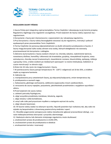 Termy Cieplickie ul. Park Zdrojowy 5 58-560 Jelenia Góra tel.: +48 75 75 46 901 e-mail: [email protected] www.termycieplickie.pl REGULAMIN SAUNY FIŃSKIEJ 1.Sauna Fińska jest integralną częścią kompleksu Termy Cieplickie i obowiązują na jej terenie przepisy Regulaminu Ogólnego oraz regulamin szczegółowy. Przed wejściem do Sauny należy zapoznać się z regulaminem. 2.Korzystanie z Sauny jest równoznaczne z zapoznaniem się i akceptacją regulaminu. 3.Przy korzystaniu z Sauny należy bezwzględnie stosować się do regulaminu, instrukcji i poleceń wydawanych przez pracowników Term Cieplickich. 4.Termy Cieplickie nie ponoszą odpowiedzialności za skutki zdrowotne przebywania w Saunie. Z Sauny mogą korzystać tylko osoby zdrowe oraz osoby, których dolegliwości nie stanowią przeciwwskazań do korzystania z zabiegów. 5.Zabrania się korzystania z Sauny osobom chorym na: choroby zakaźne, nadciśnienie tętnicze, nowotwory złośliwe, hemofilię i skłonności do krwotoków, grzybicę, niewydolność krążenia, stany astmatyczne, choroby naczyń krwionośnych, stwardnienie rozsiane, klaustrofobię, epilepsję, infekcje z gorączką i inne, a także osobom po niedawnych operacjach i w stanie intoksykacji, kobietom w czasie menstruacji i w okresie ciąży. 6.Dzieci do 16 roku życie nie mogą korzystać z Sauny. 7.W pomieszczeniu Sauny panuje temperatura 70 - 120°C i wilgotność od 10 do 35%, a źródłem ciepła są rozgrzane kamienie. 8. Zabrania się: a. manipulowania przy ustawieniach Sauny, jej włączania/wyłączania, zmian temperatury itp. b. przebywania w saunach nago, c. hałasowania, głośnego zachowania, zakłócania wypoczynku innym użytkownikom, d. wnoszenia do sauny napojów, pożywienia, jakichkolwiek przedmiotów z wyjątkiem ręczników i ubioru. 9.Przed wejściem do sauny należy: a. załatwić potrzeby fizjologiczne, b. zdjąć wszystkie przedmioty metalowe, biżuterię, zegarek, c. zdjąć okulary i szkła kontaktowe, d. umyć całe ciało pod prysznicem mydłem a następnie wytrzeć do sucha, e. zdjąć obuwie basenowe. 10. W Saunie należy siadać na własnym ręczniku. Ręcznik powinien być rozłożony tak, aby ciało nie stykało się bezpośrednio z drewnianą powierzchnią siedziska i oparć. 11. Wszelkie pogorszenie samopoczucia należy niezwłocznie zgłaszać pracownikowi obsługi , a w razie niebezpieczeństwa skorzystać z przycisku alarmowego. 12. Nadużycie alarmu lub złamanie niniejszego regulaminu może skutkować: a. anulowaniem prawa do przebywania w strefie SPA, b. anulowaniem prawa do przebywania w obiekcie c. anulowaniem karnetu i rezerwacji Termy Cieplickie ul. Park Zdrojowy 5 58-560 Jelenia Góra tel.: +48 75 75 46 901 e-mail: [email protected] www.termycieplickie.pl