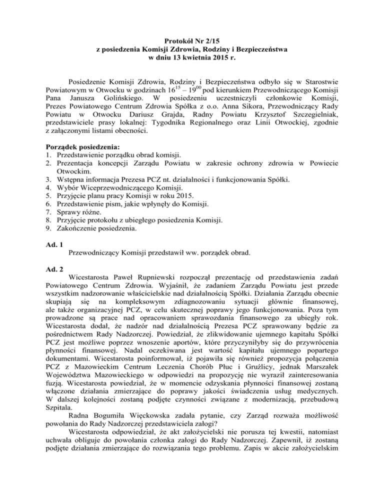 Protokół Nr 2/15 z posiedzenia Komisji Zdrowia, Rodziny i Bezpieczeństwa w dniu 13 kwietnia 2015 r. Posiedzenie Komisji Zdrowia, Rodziny i Bezpieczeństwa odbyło się w Starostwie Powiatowym w Otwocku w godzinach 1615 – 1900 pod kierunkiem Przewodniczącego Komisji Pana Janusza Golińskiego. W posiedzeniu uczestniczyli członkowie Komisji, Prezes Powiatowego Centrum Zdrowia Spółka z o.o. Anna Sikora, Przewodniczący Rady Powiatu w Otwocku Dariusz Grajda, Radny Powiatu Krzysztof Szczegielniak, przedstawiciele prasy lokalnej: Tygodnika Regionalnego oraz Linii Otwockiej, zgodnie z załączonymi listami obecności. Porządek posiedzenia: 1. Przedstawienie porządku obrad komisji. 2. Prezentacja koncepcji Zarządu Powiatu w zakresie ochrony zdrowia w Powiecie Otwockim. 3. Wstępna informacja Prezesa PCZ nt. działalności i funkcjonowania Spółki. 4. Wybór Wiceprzewodniczącego Komisji. 5. Przyjęcie planu pracy Komisji w roku 2015. 6. Przedstawienie pism, jakie wpłynęły do Komisji. 7. Sprawy różne. 8. Przyjęcie protokołu z ubiegłego posiedzenia Komisji. 9. Zakończenie posiedzenia. Ad. 1 Przewodniczący Komisji przedstawił ww. porządek obrad. Ad. 2 Wicestarosta Paweł Rupniewski rozpoczął prezentację od przedstawienia zadań Powiatowego Centrum Zdrowia. Wyjaśnił, że zadaniem Zarządu Powiatu jest przede wszystkim nadzorowanie właścicielskie nad działalnością Spółki. Działania Zarządu obecnie skupiają się na kompleksowym zdiagnozowaniu sytuacji głównie finansowej, ale także organizacyjnej PCZ, w celu skutecznej poprawy jego funkcjonowania. Poza tym prowadzone są prace nad opracowaniem sprawozdania finansowego za ubiegły rok. Wicestarosta dodał, że nadzór nad działalnością Prezesa PCZ sprawowany będzie za pośrednictwem Rady Nadzorczej. Powiedział, że zlikwidowanie ujemnego kapitału Spółki PCZ jest możliwe poprzez wnoszenie aportów, które przyczyniłyby się do przywrócenia płynności finansowej. Nadal oczekiwana jest wartość kapitału ujemnego popartego dokumentami. Wicestarosta poinformował, iż pojawiła się również propozycja połączenia PCZ z Mazowieckim Centrum Leczenia Chorób Płuc i Gruźlicy, jednak Marszałek Województwa Mazowieckiego w odpowiedzi na propozycję nie wyraził zainteresowania fuzją. Wicestarosta powiedział, że w momencie odzyskania płynności finansowej zostaną włączone działania zmierzające do poprawy jakości świadczenia usług medycznych. W dalszej kolejności zostaną podjęte czynności związane z modernizacją, przebudową Szpitala. Radna Bogumiła Więckowska zadała pytanie, czy Zarząd rozważa możliwość powołania do Rady Nadzorczej przedstawiciela załogi? Wicestarosta odpowiedział, że akt założycielski nie porusza tej kwestii, natomiast uchwała obliguje do powołania członka załogi do Rady Nadzorczej. Zapewnił, iż zostaną podjęte działania zmierzające do rozwiązania tego problemu. Zapis w akcie założycielskim powinien zostać uzupełniony lub należałoby w tej kwestii uchylić uchwałę, ponieważ występuje sprzeczność. Radna Bogumiła Więckowska zapytała z jakiego programu operacyjnego zostaną pozyskane środki na remonty w Szpitalu? Prezes PCZ Anna Sikora wyjaśniła, że środki przeznaczone np. na profilaktykę, mogą zostać wydatkowane również na remonty. Wicestarosta w imieniu Właściciela PCZ zadeklarował pomoc w kwestii organizacji środków strukturalnych oraz pomoc w pisaniu wniosków. Starosta Mirosław Pszonka dodał, że dostępne będą środki z Urzędu Marszałkowskiego na wsparcie Szpitali, zostaną również uruchomione samorządowe instrumenty wsparcia. Radny Grzegorz Michalczyk zadał pytanie, jakie były powody odwołania Prezesa Gałabudy oraz czy i jakie kroki Zarząd zamierza podjąć w stosunku do byłego Zarządu Spółki? Wicestarosta oznajmił, że podstawowym powodem odwołania Prezesa była utrata zaufania, gdyż Pan Gałabuda ukrywał przed właścicielem istotne informacje świadczące przede wszystkim o sytuacji finansowej Spółki. Dodał, że w oparciu o informacje uzyskane od nowego Prezesa, zostaną podjęte kroki wobec byłego Zarządu. Radny Grzegorz Michalczyk zaproponował, aby Zarząd przemyślał propozycję pracowników dotyczącą wprowadzenia do Rady Nadzorczej członka załogi. Wicestarosta powiedział, że współpraca z załogą jest dobra. Stwierdził, iż wybór członków do nowego składu Rady Nadzorczej powinien odbyć się po zakończeniu obecnej kadencji, czyli z końcem bieżącego roku. Radny Grzegorz Michalczyk zapytał o kwalifikacje zawodowe obecnych członków Rady Nadzorczej. Wicestarosta oznajmił, że tylko jeden z członków Rady nie spełnia kryteriów, jednakże musi on w ciągu sześciu miesięcy uzupełnić egzamin, który będzie uprawniał go do zasiadania w składzie Rady Nadzorczej. Następnie Wicestarosta przedstawił kompetencje pozostałych członków Rady. Radny Krzysztof Szczegielniak zauważył, iż powołanie członka załogi do Rady Nadzorczej nie jest łamaniem prawa, a dokonanie takiego powołania nie pociągnęłoby za sobą konsekwencji prawnych. Ad. 3 Przewodniczący Komisji zaprezentował sylwetkę Prezes PCZ Spółka z o.o. Anny Sikory, następnie przekazał jej głos. Prezes PCZ Pani Anna Sikora na wstępie zaznaczyła, że sytuacja PCZ jest bardzo trudna. Konto Spółki jest zajęte przez komornika, który pobiera opłatę w wysokości 8%, a w przypadku kontraktu z Narodowym Funduszem Zdrowia opłata komornicza wynosi 15%. W trakcie działalności Spółki nigdy nie uregulowano opłat za sprzątanie i za salowe oraz korzystanie z sieci wodociągowej i kanalizacyjnej. Od maja ubiegłego roku nie płacono ZUS-u oraz Urzędu Skarbowego. Pani Prezes powiedziała, że udało się jej doprowadzić do trzy miesięcznej ugody z ZUS-em. Poinformowała, iż zgodnie z wolą Właściciela rozpoczęto audyty, w czterech głównych obszarach, mianowicie: medycznym, finansow