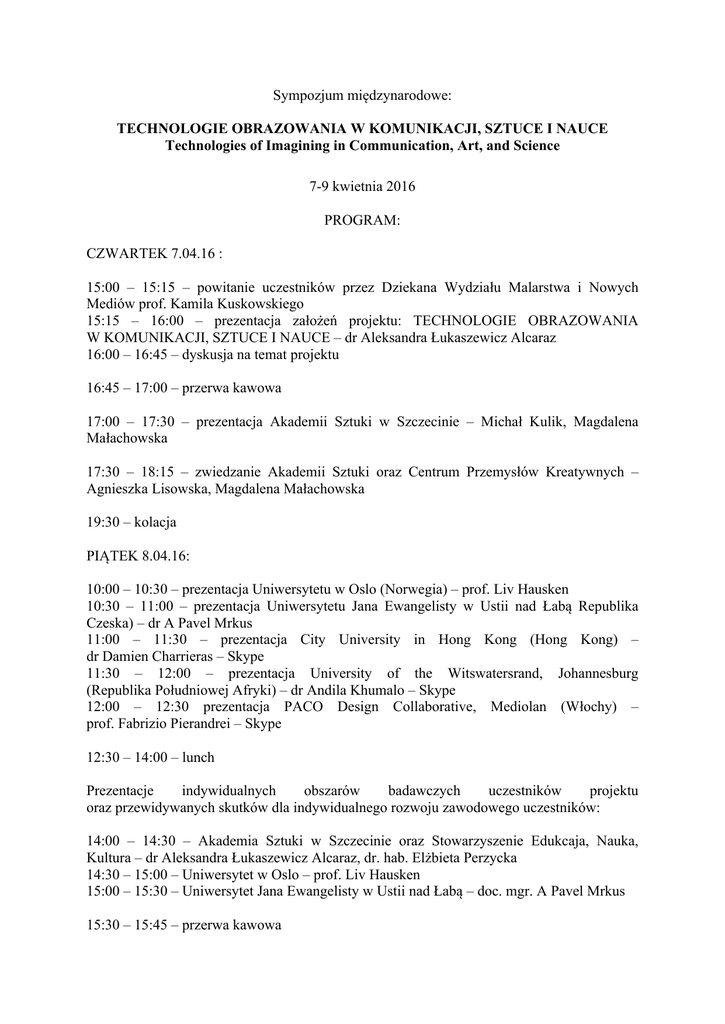 Sympozjum międzynarodowe: TECHNOLOGIE OBRAZOWANIA W KOMUNIKACJI, SZTUCE I NAUCE Technologies of Imagining in Communication, Art, and Science 7-9 kwietnia 2016 PROGRAM: CZWARTEK 7.04.16 : 15:00 – 15:15 – powitanie uczestników przez Dziekana Wydziału Malarstwa i Nowych Mediów prof. Kamila Kuskowskiego 15:15 – 16:00 – prezentacja założeń projektu: TECHNOLOGIE OBRAZOWANIA W KOMUNIKACJI, SZTUCE I NAUCE – dr Aleksandra Łukaszewicz Alcaraz 16:00 – 16:45 – dyskusja na temat projektu 16:45 – 17:00 – przerwa kawowa 17:00 – 17:30 – prezentacja Akademii Sztuki w Szczecinie – Michał Kulik, Magdalena Małachowska 17:30 – 18:15 – zwiedzanie Akademii Sztuki oraz Centrum Przemysłów Kreatywnych – Agnieszka Lisowska, Magdalena Małachowska 19:30 – kolacja PIĄTEK 8.04.16: 10:00 – 10:30 – prezentacja Uniwersytetu w Oslo (Norwegia) – prof. Liv Hausken 10:30 – 11:00 – prezentacja Uniwersytetu Jana Ewangelisty w Ustii nad Łabą Republika Czeska) – dr A Pavel Mrkus 11:00 – 11:30 – prezentacja City University in Hong Kong (Hong Kong) – dr Damien Charrieras – Skype 11:30 – 12:00 – prezentacja University of the Witswatersrand, Johannesburg (Republika Południowej Afryki) – dr Andila Khumalo – Skype 12:00 – 12:30 prezentacja PACO Design Collaborative, Mediolan (Włochy) – prof. Fabrizio Pierandrei – Skype 12:30 – 14:00 – lunch Prezentacje indywidualnych obszarów badawczych uczestników projektu oraz przewidywanych skutków dla indywidualnego rozwoju zawodowego uczestników: 14:00 – 14:30 – Akademia Sztuki w Szczecinie oraz Stowarzyszenie Edukcaja, Nauka, Kultura – dr Aleksandra Łukaszewicz Alcaraz, dr. hab. Elżbieta Perzycka 14:30 – 15:00 – Uniwersytet w Oslo – prof. Liv Hausken 15:00 – 15:30 – Uniwersytet Jana Ewangelisty w Ustii nad Łabą – doc. mgr. A Pavel Mrkus 15:30 – 15:45 – przerwa kawowa 15:45 – 16:15 – City University in Hong Kong – dr Damien Charrieras – Skype 16:15 – 16:45 – University of the Witswatersrand – dr Andila Khumalo – Skype 16:45 – 17:15 – PACO Design Collaborative – prof. Fabrizio Pierandrei – Skype 17:15 – 18:30 – kolacja w restauracji „Dzika Gęś” 19:00 – Filharmonia im. Mieczysława Karłowicza w Szczecinie SOBOTA 9.04.16 10:00 – 12:00 – dyskusja panelowa podsumowująca sympozjum