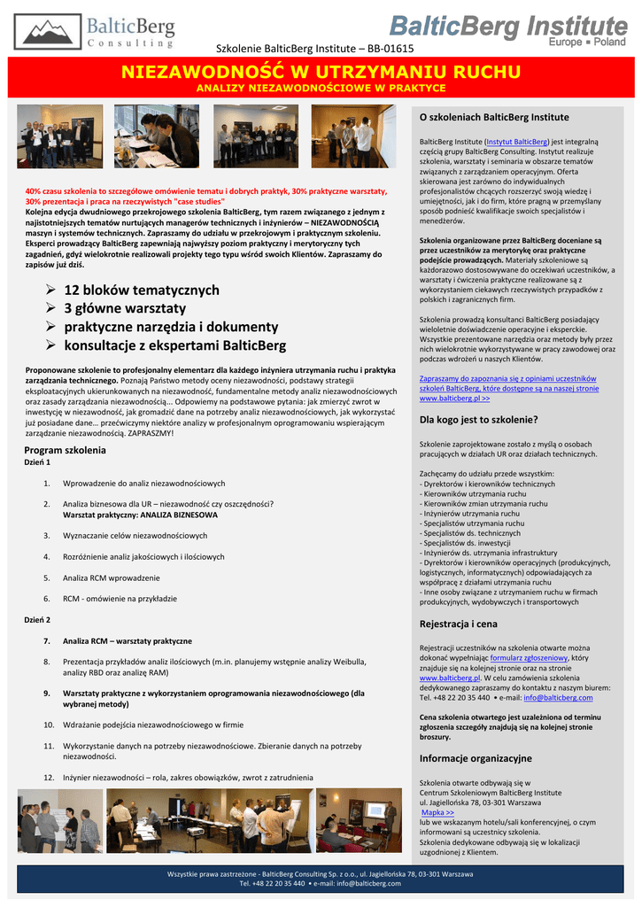 Szkolenie BalticBerg Institute – BB-01615 NIEZAWODNOŚĆ W UTRZYMANIU RUCHU ANALIZY NIEZAWODNOŚCIOWE W PRAKTYCE O szkoleniach BalticBerg Institute 40% czasu szkolenia to szczegółowe omówienie tematu i dobrych praktyk, 30% praktyczne warsztaty, 30% prezentacja i praca na rzeczywistych "case studies" Kolejna edycja dwudniowego przekrojowego szkolenia BalticBerg, tym razem związanego z jednym z najistotniejszych tematów nurtujących managerów technicznych i inżynierów – NIEZAWODNOŚCIĄ maszyn i systemów technicznych. Zapraszamy do udziału w przekrojowym i praktycznym szkoleniu. Eksperci prowadzący BalticBerg zapewniają najwyższy poziom praktyczny i merytoryczny tych zagadnień, gdyż wielokrotnie realizowali projekty tego typu wśród swoich Klientów. Zapraszamy do zapisów już dziś. 12 bloków tematycznych 3 główne warsztaty praktyczne narzędzia i dokumenty konsultacje z ekspertami BalticBerg Proponowane szkolenie to profesjonalny elementarz dla każdego inżyniera utrzymania ruchu i praktyka zarządzania technicznego. Poznają Państwo metody oceny niezawodności, podstawy strategii eksploatacyjnych ukierunkowanych na niezawodność, fundamentalne metody analiz niezawodnościowych oraz zasady zarządzania niezawodnością... Odpowiemy na podstawowe pytania: jak zmierzyć zwrot w inwestycję w niezawodność, jak gromadzić dane na potrzeby analiz niezawodnościowych, jak wykorzystać już posiadane dane… przećwiczymy niektóre analizy w profesjonalnym oprogramowaniu wspierającym zarządzanie niezawodnością. ZAPRASZMY! BalticBerg Institute (Instytut BalticBerg) jest integralną częścią grupy BalticBerg Consulting. Instytut realizuje szkolenia, warsztaty i seminaria w obszarze tematów związanych z zarządzaniem operacyjnym. Oferta skierowana jest zarówno do indywidualnych profesjonalistów chcących rozszerzyć swoją wiedzę i umiejętności, jak i do firm, które pragną w przemyślany sposób podnieść kwalifikacje swoich specjalistów i menedżerów. Szkolenia organizowane przez BalticBerg doceniane są przez uczestników za merytorykę oraz praktyczne podejście prowadzących. Materiały szkoleniowe są każdorazowo dostosowywane do oczekiwań uczestników, a warsztaty i ćwiczenia praktyczne realizowane są z wykorzystaniem ciekawych rzeczywistych przypadków z polskich i zagranicznych firm. Szkolenia prowadzą konsultanci BalticBerg posiadający wieloletnie doświadczenie operacyjne i eksperckie. Wszystkie prezentowane narzędzia oraz metody były przez nich wielokrotnie wykorzystywane w pracy zawodowej oraz podczas wdrożeń u naszych Klientów. Zapraszamy do zapoznania się z opiniami uczestników szkoleń BalticBerg, które dostępne są na naszej stronie www.balticberg.pl >> Dla kogo jest to szkolenie? Szkolenie zaprojektowane zostało z myślą o osobach pracujących w działach UR oraz działach technicznych. Program szkolenia Dzień 1 1. szkolenia: Wprowadzenie do analiz niezawodnościowych Program 2. Analiza biznesowa dla UR – niezawodność czy oszczędności? Warsztat praktyczny: ANALIZA BIZNESOWA 3. Wyznaczanie celów niezawodnościowych 4. Rozróżnienie analiz jakościowych i ilościowych 5. Analiza RCM wprowadzenie 6. RCM - omówienie na przykładzie Dzień 2 Zachęcamy do udziału przede wszystkim: - Dyrektorów i kierowników technicznych - Kierowników utrzymania ruchu - Kierowników zmian utrzymania ruchu - Inżynierów utrzymania ruchu - Specjalistów utrzymania ruchu - Specjalistów ds. technicznych - Specjalistów ds. inwestycji - Inżynierów ds. utrzymania infrastruktury - Dyrektorów i kierowników operacyjnych (produkcyjnych, logistycznych, informatycznych) odpowiadających za współpracę z działami utrzymania ruchu - Inne osoby związane z utrzymaniem ruchu w firmach produkcyjnych, wydobywczych i transportowych Rejestracja i cena 7. Analiza RCM – warsztaty praktyczne 8. Prezentacja przykładów analiz ilościowych (m.in. planujemy wstępnie analizy Weibulla, analizy RBD oraz analizę RAM) 9. Warsztaty praktyczne z wykorzystaniem oprogramowania niezawodnościowego (dla wybranej metody) 10. Wdrażanie podejścia niezawodnościowego w firmie 11. Wykorzystanie danych na potrzeby niezawodnościowe. Zbieranie danych na potrzeby niezawodności. 12. Inżynier niezawodności – rola, zakres obowiązków, zwrot z zatrudnienia Rejestracji uczestników na szkolenia otwarte można dokonać wypełniając formularz zgłoszeniowy, który znajduje się na kolejnej stronie oraz na stronie www.balticberg.pl. W celu zamówienia szkolenia dedykowanego zapraszamy do kontaktu z naszym biurem: Tel. +48 22 20 35 440 • e-mail: [email protected] Cena szkolenia otwartego jest uzależniona od terminu zgłoszenia szczegóły znajdują się na kolejnej stronie broszury. Informacje organizacyjne Szkolenia otwarte odbywają się w Centrum Szkoleniowym BalticBerg Institute ul. Jagiellońska 78, 03-301 Warszawa Mapka >> lub we wskazanym hotelu/sali konferencyjnej, o czym informowani są uczestnicy szkolenia. Szkolenia dedykowane odbywają się w lokalizacji uzgodnionej z Klientem. Wszystkie prawa zastrzeżone - BalticBerg Consulting Sp. z o.o., ul. Jagiellońska 78, 03-301 Warszawa Tel. +48 22 20 35 440 • e-mail: [email protected] Szkolenie BalticBerg Institute – BB-01615 NIEZAWODNOŚĆ W UTRZYMANIU RUCHU ANALIZY NIEZAWODNOŚCIOWE W PRAKTYCE Dlaczego BalticBerg? Nasze szkolenia to: dopracowane programy szkoleniowe stale doskonalone w oparciu o szczegółowe wywiady z Klientami wysoka efektywność – możliwe szybkie zastosowanie wiedzy w praktyce najwyższy poziom merytoryczny poparty doświadczeniem w dziesiątkach projektów doradczych wiele praktycznych przykładów oraz aktywna dyskusja pomiędzy Uczestnikami Szkolenia otwarte prowadzi Pan Arkadiusz Burnos oraz inni eksperci BalticBerg Arkadiusz Burnos – manager operacyjny oraz ekspert BalticBerg w zakresie zarządzania operacyjnego ze szczególnym ukierunkowaniem na zarządzanie maj