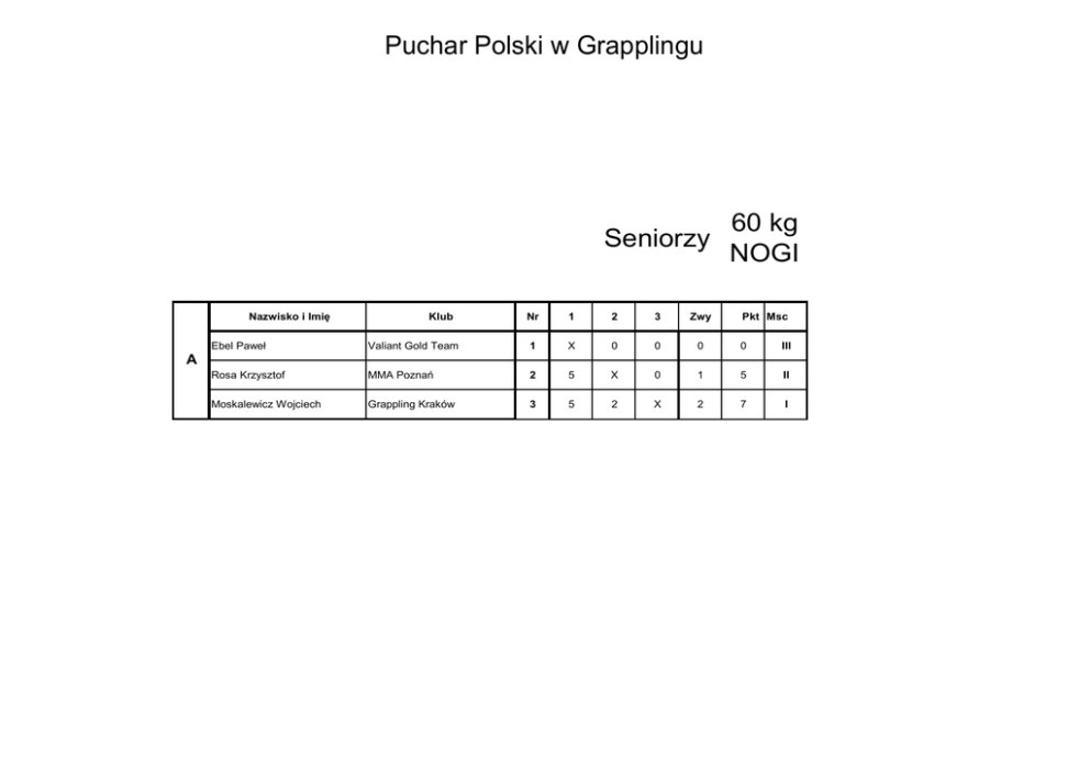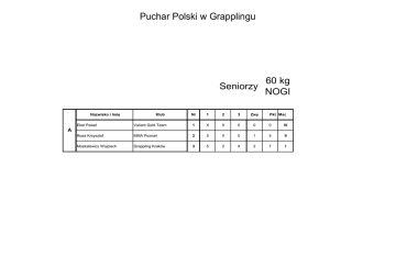 Puchar Polski w Grapplingu Seniorzy Nazwisko i Imię Klub Nr 1 2 3 Zwy 60 kg NOGI Pkt Msc Ebel Paweł Valiant Gold Team 1 X 0 0 0 0 III Rosa Krzysztof MMA Poznań 2 5 X 0 1 5 II Moskalewicz Wojciech Grappling Kraków 3 5 2 X 2 7 I A Runda eliminacyjna Num Pays 1/4 Finału 1/2 Finału Finał Lp Pays 1 17 Klasyfikacja Nom Loska Jędrzej Puchar Polski w Grapplingu 1/4 Finału Runda eliminacyjna 1/2 Finału Finał Num Pays 1 2 3 Jędrzejczak Mieczysła Berserker's Team 0 Jędrzejczak Mieczysła Berserker's Team Czechowski Rafał Grappling Kraków 5 Czechowski Rafał Grappling Kraków Kurpik Daniel Berserker's Team Świnoujście 5 Kurpik Daniel Berserker's Team Świnoujście Jabłoński Aleksander MMA Poznań 4 5 5 Trzcionka Robert Bastion Tychy 6 0 Konopiński Paweł Copacabana 7 5 Bąk Bartosz Łomatro Racibórz 8 0 9 0 Górny Adam Berserker's Team Świnoujście 10 3 Tarnawski Kamil Łomatro Racibórz 11 0 12 4 0 5 Czechowski Rafał Grappling Kraków 0 Czechowski Rafał Grappling Kraków 0 Kurpik Daniel Berserker's Team Świnoujście Jabłoński Aleksander MMA Poznań Loska Jędrzej Copacabana 5 Trzcionka Robert Bastion Tychy 0 Trzcionka Robert Bastion Tychy 0 Bąk Bartosz Łomatro Racibórz Kowalczyk Maciej Berserker's Team Podstawczuk Piotr Berserker's Team 5 0 Jędrzejczak Mieczysła Berserker's Team Pays Klasyfikacja Nom Loska Jędrzej 1 17 Copacabana 2 10 Grappling Kraków 3 15 Bastion Tychy 3 10 Berserker's Team 4 6 5 5 6 0 6 0 6 0 6 0 6 0 6 0 Czechowski Rafał Trzcionka Robert Kurpik Daniel Tarnawski Kamil Łomatro Racibórz Bąk Bartosz Łomatro Racibórz Podstawczuk Piotr Berserker's Team Górny Adam Berserker's Team Świnoujście Kowalczyk Maciej Berserker's Team Konopiński Paweł Copacabana Jędrzejczak Mieczysła Berserker's Team Jabłoński Aleksander MMA Poznań 0 Tarnawski Kamil Łomatro Racibórz 3 5 65 kg NOGI Loska Jędrzej Copacabana Loska Jędrzej Copacabana Loska Jędrzej Copacabana 5 Kurpik Daniel Berserker's Team Loska Jędrzej Copacabana Lp 5 Trzcionka Robert Bastion Tychy Kurpik Daniel Berserker's Team 3 Tarnawski Kamil Łomatro Racibórz 0 Podstawczuk Piotr Berserker's Team Trzcionka Robert Bastion Tychy 0 Tarnawski Kamil Łomatro Racibórz Team Racibórz 0 Jędrzejczak Mieczysła 0 Berserker's Team Podstawczuk Piotr Berserker's Team Puchar Polski w Grapplingu 1/4 Finału Runda eliminacyjna 1/2 Finału Finał Lp Num Pays 1 0 2 5 3 5 4 0 5 0 Krasuski Hubert MMA Poznań 1 Makowski Wojciech Dragon Koszalin Lasot Rafał Grappling Kraków 0 0 Lasot Rafał Grappling Kraków Chachlica Artur Berserker's Team Warchoł Norbert ZKS Bielawianka Bielawa 6 5 Palmowski Michał Gwiazda Bydgoszcz Palmowski Michał Gwiazda Bydgoszcz 8 5 9 0 Sadzak Adrian Berserker's Team 10 5 Chachlica Artur Berserker's Team 11 0 Sobolewski Arkadiusz 5 12 5 0 5 Lasot Rafał Grappling Kraków Lasot Rafał Grappling Kraków 0 1/4 Finale Num Pays 6 3 10 3 15 5 5 5 0 7 0 8 0 9 0 10 0 11 0 Makowski Wojciech Dragon Koszalin Lasot Rafał Grappling Kraków Wrześniewski Daniel Berserker's Team Palmowski Michał Gwiazda Bydgoszcz Sobolewski Arkadiusz Valiant Gold Team Sadzak Adrian Berserker's Team Warchoł Norbert ZKS Bielawianka Bielawa Strzesak Jarosław Berserker's Team Krasuski Hubert MMA Poznań Sadzak Adrian Berserker's Team Chachlica Artur Berserker's Team Wrześniewski Daniel Berserker's Team Palmowski Michał Gwiazda Bydgoszcz Wrześniewski Daniel Berserker's Team 5 Wrześniewski Daniel Berserker's Team Sadzak Adrian Berserker's Team 1/2 Finale Finale 1 - 2 Cl 1 1 2 70 kg NOGI 0 1/8 Finale 20 Berserker's Team Wrześniewski Daniel Berserker's Team 0 Krasuski Hubert MMA 5 Chachlica Artur 1 Chachlica Artur Berserker's Team Wrześniewski Daniel Berserker's Team Poznań Klasyfikacja Nom Chachlica Artur Berserker's Team 5 Valiant Gold Team Makowski Wojciech Dragon Koszalin Strzesak Jarosław Berserker's Team 0 7 Makowski Wojciech Dragon Koszalin Pays 0 Gregorek Marek Pays 12 Nom Kloc Grzegorz Berserkers Team Targalski Kamil Puchar Polski w Grapplingu 1/8 Finale 1/4 Finale 1/2 Finale Finale 1 - 2 Cl Num Pays 1 0 Gregorek Marek Berserkers Team 3 2 5 Kloc Grzegorz Berserkers Team Kloc Grzegorz Berserkers Team 4 3 3 Koperski Kamil Berserkers Team 4 0 Piekarz Andrzej AKS Białogard 0 5 7 8 9 10 11 0 5 3 0 5 0 Ziemkiewicz Paweł WKS Gwardia Koperski Kamil Berserkers Team Targalski Kamil WKS Gwardia Kloc Grzegorz Berserkers Team 3 6 Kloc Grzegorz Berserkers Team Targalski Kamil WKS Gwardia 1 12 2 8 3 13 3 6 4 5 5 3 6 0 6 0 6 Wiktor Jakub Berserkers 6 Wiktor Jakub Berserkers 0 Abramiuk Mariusz Valiant Gold Team Pays 6 Targalski Kamil WKS Gwardia 0 0 0 Nom Kloc Grzegorz Berserkers Team Targalski Kamil WKS Gwardia Held Marcin Gracie Barra Koperski Kamil Berserkers Team Wiktor Jakub Berserkers Abramiuk Mariusz Valiant Gold Team Piekarz Andrzej AKS Białogard Gregorek Marek Berserkers Team Marzeta Karol AKS Białogard Maślij Kamil Berserkers Team Ziemkiewicz Paweł WKS Gwardia 0 Abramiuk Mariusz Valiant Gold Team Marzeta Karol AKS Białogard 0 Held Marcin Gracie Barra Held Marcin Gracie Barra 75 kg NO GI 3 Held Marcin Gracie Barra Maślij Kamil Berserkers Team REPASAŻ 3 Koperski Kamil 5 Held Marcin Gracie Barra Berserkers Team Held Marcin Koperski Kamil 0 Gregorek Marek Gracie Barra Berserkers Team 0 Wiktor Jakub Berserkers Team Berserkers 1/8 Finale 1/4 Finale Num Pays 1/2 Finale Finale 1 - 2 Cl 1 1 0 Trzos Daniel Pays 13 Nom Baginski Łukasz Berserkers Team Mitosek Kamil Held Marcin Koperski Kamil 0 Gregorek Marek Gracie Barra Berserkers Team 0 Wiktor Jakub Berserkers Team Puchar Polski w Grapplingu Berserkers 1/8 Finale 1/4 Finale 1/2 Finale Finale 1 - 2 Num Pays 1 0 Trzos Daniel Top Team 3 2 5 Baginski Łukasz Berserkers Team Baginski Łukasz Berserkers Team 5 3 3 Kałuszewski Maciej Berserkers Team 0 44 50 60 Glabus Maciej Berserkers Team 0 Kałuszewski Maciej Berserkers Team Glabus Maciej Berserkers Team Niewiadomski Jarosław MMA Poznań Baginski Łukasz Berserkers Team Kazimierczak Aleksander MMA Poznań 