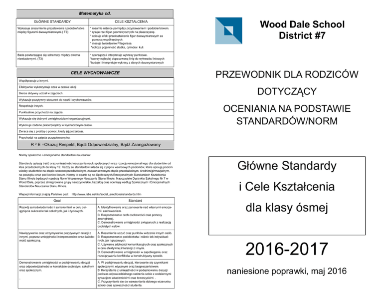 Matematyka cd. GŁÓWNE STANDARDY CELE KSZTAŁCENIA Wykazuje zrozumienie przystawania i podobieństwa między figurami dwuwymiarowymi.( T3) * rozumie różnice pomiędzy przystawaniem i podobieństwem. * rysuje rzut figur geometrycznych na płaszczyznę. * opisuje efekt przekształcenia figur dwuwymiarowych za pomocą współrzędnych. * stosuje twierdzenie Pitagorasa. *oblicza pojemność stożka, cylindra i kuli. Bada powtarzające się schematy między dwoma niewiadomymi. (T3) * sporządza i interpretuje wykresy punktowe. *tworzy najlepiej dopasowaną linię do wykresów liniowych *buduje i interpretuje wykresy z danych dwuwymiarowych Wood Dale School District #7 PRZEWODNIK DLA RODZICÓW CELE WYCHOWAWCZE Współpracuje z innymi. Efektywnie wykorzystuje czas w czasie lekcji DOTYCZĄCY Bierze aktywny udział w zajęciach. Wykazuje pozytywny stosunek do nauki i wychowawców. OCENIANIA NA PODSTAWIE STANDARDÓW/NORM Respektuje innych. Punktualnie przychodzi na zajęcia. Wykazuje się dobrymi umiejętnościami organizacyjnymi. Wykonuje zadane prace/projekty w wyznaczonym czasie. Zwraca się z prośbą o pomoc, kiedy jej potrzebuje. Przychodzi na zajęcia przygotowany/na. R ² E =Okazuj Respekt, Bądź Odpowiedzialny, Bądź Zaangażowany Normy społeczne i emocjonalne standardów nauczania:: Standardy opisują treść oraz umiejętności nauczania nauk społecznych oraz rozwoju emocjonalnego dla studentów od klas przedszkolnych do klasy 12. Każdy ze standardów składa się z pięciu wzorcowych poziomów, które opisują poziom wiedzy studentów na etapie wczesnoprzedszkolnym, zaawansowanym etapie przedszkolnym, średnim/gimnazjalnym, na początku oraz pod koniec liceum. Normy te oparte są na Społecznych/Emocjonalnych Standardach Kształcenia Stanu Illinois będących częścią Norm Wczesnego Nauczania Stanu Illinois. Nauczyciele Dystryktu Szkolnego Nr 7 w Wood Dale, poprzez zintegrowane grupy nauczycielskie, kształcą oraz oceniają według Społecznych i Emocjonalnych Standardów Nauczania Stanu Illinois. Więcej informacji znajdą Państwo pod: http://www.isbe.net/ils/social_emotional/standards.htm Goal Standard Rozwój samoświadomości i samokontroli w celu osiągnięcia sukcesów tak szkolnych, jak i życiowych. A. Identyfikowanie oraz panowanie nad własnymi emocjami i zachowaniami. B. Rozpoznawanie cech osobowości oraz pomocy zewnętrznej. C. Demonstrowanie umiejętności związanych z realizacją osobistych celów. Nawiązywanie oraz utrzymywanie pozytywnych relacji z innymi, poprzez umiejętności interpersonalne oraz świadomość społeczną. A. Rozumienie uczuć oraz punktów widzenia innych osób. B. Rozpoznawanie podobieństw i różnic tak indywidualnych, jak i grupowych. C. Używanie zdolności komunikacyjnych oraz społecznych w celu efektywnej interakcji z innymi. D. Demonstrowanie umiejętności w zapobieganiu oraz rozwiązywaniu konfliktów w konstruktywny sposób. Demonstrowanie umiejętności w podejmowaniu decyzji oraz odpowiedzialności w kontekście osobistym, szkolnym oraz społecznym. A. W podejmowaniu decyzji, kierowanie się czynnikami społecznymi, etycznymi oraz bezpieczeństwem. B. Korzystanie z umiejętności w podejmowaniu decyzji podczas odpowiedzialnego radzenia sobie z codziennymi sytuacjami akademickimi oraz towarzyskimi. . C. Przyczynianie się do wzmacniania dobrego wizerunku szkoły oraz społeczności studenta. . Główne Standardy i Cele Kształcenia dla klasy ósmej 2016-2017 naniesione poprawki, maj 2016 Szanowni Rodzice, Ten przewodnik ma na celu pomóc rodzicom w uzyskaniu informacji na temat głównych standardów wybranych dla poczczególnych klas. Dla każdego głównego standardu opracowane zostały cele kształcenia/umiejętności, które dziecko powinno opanować w danej klasie. Stanowić one będą kryteria oceniajace stopień opanowania standardu w semestrze. Nauczyciele będą korzystać z tych informacji, aby monitorować i oceniać postępy ucznia w kierunku opanowania tych standardów. Dla rdziców i uczniów informacje te mogą służyć jako wyznacznik celów edukacyjnych. Nie wszystkie standardy są brane pod uwagę podczas oceniania w każdym semestrze. Poniżej podany system oznaczeń pomoże Państwu zrozumieć w jakim okresie uczeń musi opanować wymagane umiejętności. Matematyka GŁÓWNE STANDARDY Stosuje wiedzę matematyczną przy wykonywaniu działań. *rozumie problemy i wykazuje się wytrwałością przy ich rozwiązywaniu *rozumuje abstrakcyjnie i zna wartości liczbowe *przytacza realne argumenty i krytykuje rozumowanie innych *modeluje matematycznie *strategicznie używa odpowiednich narzędzi *zwraca uwagę na precyzję *szuka i wykorzystuje struktury *szuka i wyraża struktury regularności w powtarzających się metodach rozwiązywania zadań Rozpoznaje różnice pomiędzy liczbami wymiernymi i niewymiernymi. (T1) * rozpoznaje liczby wymierne i niewymierne oraz ich wartości w postaci ułamków dziesiętnych. * porównuje wielkość liczb wymiernych i niewymiernych. * określa pozycje liczb wymiernych i niewymiernych na osi liczbowej. Rozumie koncept pierwiastkowania i potęgowania. (T1) * zna i stosuje działania na potęgach. * oblicza pierwiastki drugiego i trzeciego stopnia. * przeprowadza obliczenia wykorzystując metody naukowe. Demonstruje wiedzę na temat wartości zmiennych przy rozwiązywaniu równań. (T1, T2) * rozwiązuje równania z jedną niewiadomą stosując wszystkie operacje matematyczne. * rozwiązuje równania z dwiema niewiadomymi stosując wszystkie operacje matematyczne. * rozwiązuje równania grupując niewiadome oraz łącząc podobne wyrażenia. * stosuje równania oraz proces rozwiązywania w różnych sytuacjach. Analizuje I rozwiązuje równania liniowe. (T2) * rysuje wykresy wartości proporcjonalnych, interpretując współczynnik równania jako nachylenie krzywej. * rozpoznaje nachylenie krzywej oraz punkt przecięcia w tabelce, równaniu i na wykresie. * analizuje i roz