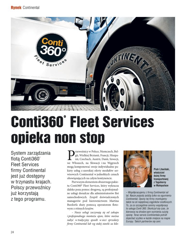 Rynek Continental Conti360° Fleet Services opieka non stop System zarządzania flotą Conti360° Fleet Services firmy Continental jest już dostępny w trzynastu krajach. Polscy przewoźnicy już korzystają z tego programu. 24 P rzewoźnicy w Polsce, Niemczech, Belgii, Wielkiej Brytanii, Francji, Hiszpanii, Czechach, Austrii, Danii, Szwecji, we Włoszech, na Słowacji i na Węgrzech mogą komponować swoje indywidualne pakiety usług z szerokiej oferty modułów serwisowych Continental w jednolitych cenach obowiązujących na całym kontynencie. Pierwszym elementem obszernego pakietu Conti360° Fleet Services, który wykracza daleko poza pomoc drogową, są profesjonalne usługi doradcze dla administratorów flot samochodowych. Zespół doświadczonych managerów pod kierownictwem Martina Burdorfa służy pomocą operatorom flotowym z różnych krajów. – Nasze usługi zaczynają się od zakupu i profesjonalnego montażu opon, które można nabyć w tradycyjny sposób w sieci sprzedaży firmy Continental lub wg stałej stawki za kilo- Piotr Litwiński, właściciel dużej firmy transportowej z Tęgoborzy w Małopolsce – Współpracujemy z firmą Continental od lat. Nasze pojazdy jeżdżą tylko na ogumieniu Continental. Opony tej firmy montujemy także na oś napędową ciągników siodłowych. To, za co szczególnie cenimy współpracę to usługa Conti 360. Skończył się czas, że kierowca na drodze sam wymienia zużytą oponę. Teraz serwis Continentala potrafi dojechać szybko w każde miejsce na mapie Europy. Takich partnerów się ceni. metr. Właściwy wybór i staranne monitorowanie eksploatacji opon jako ważnego zasobu mogą wnieść duży wkład w poprawę wyników ekonomicznych firmy – mówi Marcin Cywiński z Continental Polska. wej uwalniają przewoźników od tych czasochłonnych i kosztownych rutynowych zadań. Opcjonalne usługi ContiFleetChecks mają za zadanie ujawnić słabe punkty w parku oponiarskim floty i zwiększyć przejrzystość kosztów. Idealna opona do wszelkich zastosowań Ogólnoeuropejska usługa pomocy drogowej Continental Narzędzie ContiTireFinder pozwala wybrać z szerokiej oferty firmy Continental opony, które najlepiej odpowiadają potrzebom przewoźników. Następnie ContiCostCalculator określa najbardziej ekonomiczną oponę do ich konkretnego zastosowania. Program, posiadający certyfikat niemieckiego niezależnego stowarzyszenia kontroli technicznej DEKRA, opiera się na bardzo rozbudowanej bazie opon i oferuje różne możliwości wprowadzania danych. Dostępny jest dla wszystkich klientów i zainteresowanych stron. W ramach opcjonalnej usługi ContiFleetCheck eksperci śledzą cały cykl życia opon aż po planowaną wymianę, organizując przeglądy i przeprowadzając regularne pomiary ciśnienia i głębokości bieżnika. Elektroniczny system ContiFleetReporting zapewnia klientom Conti360° dostęp do wszystkich danych dotyczących opon, raportów na temat ich stanu i analizy kosztów przez cały okres eksploatacji opony, nieprzerwanie rejestrując jej historię i wyraźnie informując, gdy stan opony oraz plan serwisowy wskazują, że niezbędna jest wymiana. Na życzenie pakiet Conti360° Fleet Services może dostarczać osobne raporty kosztów i zużycia dla opon do pojazdów ciężarowych. – Współpracujemy z firmą Continental od lat. Nasze pojazdy jeżdżą tylko na ogumieniu Continental. Opony tej firmy montujemy także na oś napędową ciągników siodłowych. To, za co szczególnie cenimy współpracę to usługa Conti 360. Skończył się czas, że kierowca na drodze sam wymienia zużytą oponę. Teraz serwis Continentala potrafi dojechać szybko w każde miejsce na mapie Europy. Takich partnerów się ceni – mówi Piotr Litwiński, właściciel dużej firmy transportowej z Tęgoborzy w Małopolsce. Dzisiaj firma Continental oferuje 24-godzinną usługę pomocy drogowej w 37 europejskich państwach. Gwarantuje ona klientom przywrócenie mobilności pojazdu w ciągu 3-4 godzin, zależnie od kraju. Sama pomoc jest świadczona przez rozległą sieć serwisową obejmującą około 2500 partnerów Conti360°. Przewoźnicy dzwonią na bezpłatny numer i otrzymują natychmiastową pomoc w odpowiednim języku – niepotrzebne staje się długie i często kosztowne poszukiwanie lokalnych warsztatów. Modułowa struktura pakietu Conti360° Fleet Services pozwala dopasować umowy Continental Fleet do wymagań przewoźnika, zależnie od wielkości firmy i sposobu użytkowania pojazdów. Ta zaleta daje także mniejszym firmom, które posiadają mniej pojazdów ciężarowych, szansę na zawarcie umowy oferującej jednakowy zakres usług i ujednoliconą strukturę cen w całej Europie. Opr. M. Mazur Życie po życiu U schyłku życia opony opiekę nad nią przejmuje profesjonalna usługa zarządzania karkasami ContiCasingManagement, organizując zbiórkę, inspekcję i odkup. Jeśli opona wymaga wymiany na drodze, usługa ContiBreakdownService zapewnia, że czas postoju jest jak najkrótszy. Usługi zarządzania oponami i pomocy drogo25