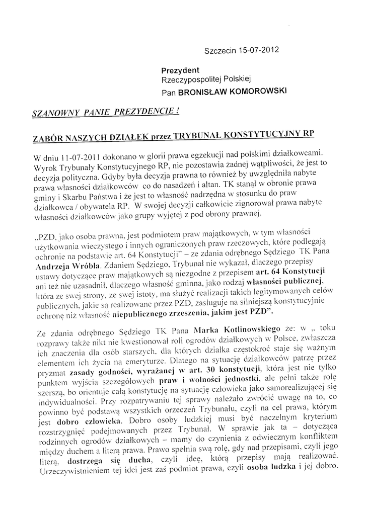 Szczecin15-07-2012 Prezydent itejPolskiej RzeczyposPol KOMOROWSKI PanBRONISI-AW SZAIVO ZABOR NASZYCH DZIAI-EK rzCZTRYBUNAL KONSTYTUCYJNY RP nad polskimi dzialkowcami' s, dniu ll-01-201 I dokonano w gl0rii prawa egzekucji Zadneiw4tpliwoici' 2e iest to S/yrok Trybunaly Konstytucyjnego RP, nie pozostawra rorvnte1by uwzglgdnilanabyte decyzjapolityczna.Gdyby byia decyzjaprawnato TK stan4tw obronieprawa pru*u *turnos.i dzialkowcow co do nasadzeni altan. nadrzqdnau' stosunkudo praw gminy i SkarbuPanstwai ze jest to r'vlasnoSc zignorowal prarvanabyte clziatkorvca/ obywatela Rp. w srvojej decyzji calkor,vicie prawnej' rvlasnoscidzialkor.vcall'jako grupy wyjqtej z pod obrony pra\v rnaiqtkor'q'ch,n' ty''trlrvlastrosci ,.?ZD,jako osobapra\\ lla. jcst poclrniotettr rzeczowvch,ktore pocllegaj4 i innl,ch ograniczclny'ch-prarv .rzl,tkou,aniarviecz),stego Sgdziego TK Pana zdaniaocrrebnego ochronie,a pocista*.ieart. 6-r Konstf,tr-rcji" r-e nie u'vkazai.dlaczegop|zepisl' An4rzeja W16bla. ZclaniernSeclziego.irl"bunal Konstvtucii praw rnajqtko*'r.[ ,4 niezgo.lnez przepiset. art' 64 clotl.czace 'sta\\,--.', jako rocizai*lasno5ci publicznej' anr teznie uzas.clnil,dlaczegorn'iasnoiigminna, rna si-irz,virealizacii takich legit1"mo*'an)'chce16rv ktora ze su,e.jstr.olr\,,ze s*ei istoty,," zPZi).zaslr-rgujena silniejsz4konstl'tr'icljr-rie jakie sa realizo\\iane'prze pr-rbiiczt-r1,cl-i, jakinr jcst ?ZD" ' o zr zes- ztnia, c r c l r r o nnei z ri 'l a stl o i cn i e p u b l i cz-neg pana Marka Kotlinorvskiego zt'. ,r _..tokr'r T.e zclaria och.ebnegoSedziego TK roli ogrodo*' clzialko*}'ch *' Polsce. ztr'laszcza rozpra\\n tar<ze'i1<t ,ie 1.r,,--stionon,ai czgstokroi staje sie r'r'azn)'tl rch znaczeniaclla osrib starszvcir.clla litolych cizialka svtLlacjedziaikorvcori'pat'ze p1-ze7' elemerte'r icir 2vcia 1raerllef'turze. Dlatego na ktora 'iest nie t-vlko zasacly godnoSci, lv1'r:rianej lv art. 30 konst-Vtucji, pr,l.'znrat p u n k t e r n l r l j s c i a s z c z e g o l o i r , j , c h p , u , , i l v o l n o S c i i e d n o s t k i , a l e p e } r r i t a ksie zerole jako sarrorealizLriqcej czlorvieka s),tuacje na ko'st-vtucjg szerszil.bo orientr;ie cal4 u\\Iagq na to' co Przl' rozpatr,vrvaniute.i sprau'rvnalezaio zu'rocic inch,,u'iclualt-rosci. cz,vli na cel pl'awa' ktor.vm po*,inno b,vc pods,*i,q u,szystkich orzeczen Tr1"br-l'atu, kryteriu'r jest dobro czlorvicka. l)obro osob,v hiclz-l<iejtnr-tsi b,uc naczelnl'll-t dot-Vczqca W sprau'ie jak ta rozstrz,vgr-riecpodejgrorvanycl'rprzez Tr,vb1rnat' czynien\a z odrvieczn-vmkonllikteril rodzirrnl,ch ogr-ocloivclziatkorvy"ch l'nalny c1o tol9, gcly nad przepisami' cz'vli jego rr-riqdzl,dttcheil a litera prawa. Pt'arvospelnia su'4 przepis,v rnaj4 realizorvai' 1iter4, tlostrzega siq tlucltit. czyli ideg, itto'4 czyli osoba ludzka i jej dobro' urzeczvu,istnienierntej icleijest zas podrniot plawa, nie Dostrzegamrealne zagrozeniadla t,vchrvartoScilv sytuacji, gd," ttstarvoda'uvca Konstytucljnego.Refonna inst,vtucjiogrodorv Tr,vbr-rnah-t zrealizr4ena czas r,v,vroku a ustalvodau'cama nielatrve rv Polscemusi byc bardzo przemySlana. clzialkoivy,,ch interesow ze sob4w sprzecznosci rv ustarvieczgstopozostaj4cych zadaliepogodzenia przez Poiski Zwr4zek u,ielu podmiotorv,m.in. dzialkorvcow.rept'ezentorvanych a tak2e przede r,vszystkirnw Warszarvie Dzialkorvc6rv,grniu, inrvestor6r,v, h przezdekretwarszawski". ieli poszkodor.vanyc h r,via6cic dar.r,nyc polskichmiast.Nasze ponadtopragnQzwrocic Jeszcze na inny aspektrnieszkaric6w przez I 692,4 wojewodztwoobejrnuje22892km2zamieszkale Zachodniopomorskie tys. ludnoSciw tym odsetekludnoScimiejskiejwynosi 68,8oA. 45,4o a Lubelskie46,60/o. 4Io , Swigtokrzyskie Dla przykladuPodkarpackie fabryki Zpodanegoprzykladuwynika,2e mieszkaficommiasttrzebazagwarantowad tlenujakimi i4 ogrodydzialkowei uwzglEdnidwydluzonyobligatoryjniezawodowy warunki do wypoczynkul' okrespracydo lat 6l -/miejsco\vepowszechne W kryzysieSwiatowymlv tym i krajowyrnt4 decyzl4TK, bqdzieniszczonymaj4tek dzialkowcow. Po wejsciunowej ustawyobowi4zujqceoplatyza dzialkqdla duzejcz96ci dzialkowcow,bgd4nie do przyjgciai powstaniesytuacja,2e dzialkowiecbEdzie zrlluszonypozostawicdzialkg.Pytanie,kto mu zaplac\za nasadzenia,altankEt za godzinpracy,gdy nawozrl czqstoziemie,kopai ro\lY, tysiqceprzepracowanych grodrit i...n, oplacalza wykonaniesiecielektryczneji r.vodneji brat udzial w drzewai krzevvyktore produkuj4tlen f,osrtachcalej intiastruktury.Ponadtozasadzal srvojemienie bezzaplatygminie.i to rnaby6 rniasta.Terazma oclclad rrieszkancom zy autorytetprawnyTK w panstwie,realizujqpolitykq pafisfw,oprarva?,a najrvyzs panstrva- koszternpolskiegodzialkowca niszcz4cgo i w ten spos6b sklada mu w miastach. terenowwstydliwychwczeSniej za u2y2nienie ,.podziekowanie" IE ! rt1,Ponie PREZYDEIVC Szunoru NIaj4cna wzglgdziewYrokTK , zrvracarnysig do PanaPrezydentao zadbaniei rvobecdzialkorvcow. i a pra\\'akonstytucyjnego ie przestrzegan zachou'an Z wyrazami szacunku i PowaZanta V-ce Prezes Okrggou'ego Zarzqdt PZD Szczectn l -l inz. I ozef Romanor,vski Otrzymujq: t L . P r e z y d eRn P 2. PrezesPZD D/ a 3. OZPZa Prezes Zarz4duPZD Szczecin Okrggorvego /-/ mgr TadeuszJarzgbak