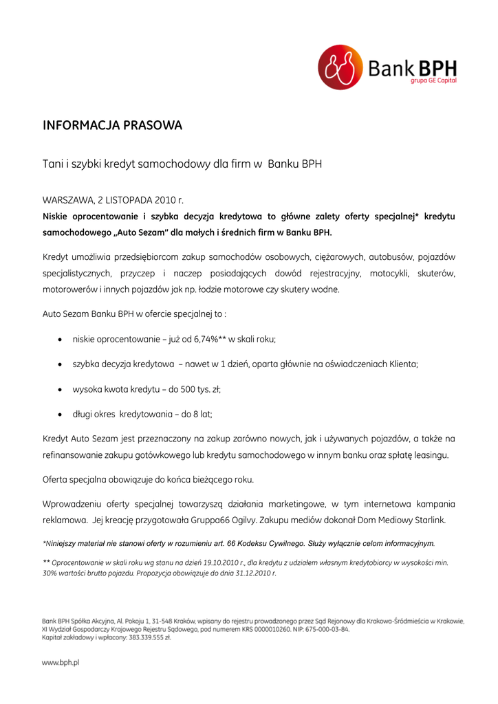 INFORMACJA PRASOWA Tani i szybki kredyt samochodowy dla firm w Banku BPH WARSZAWA, 2 LISTOPADA 2010 r. Niskie oprocentowanie i szybka decyzja kredytowa to główne zalety oferty specjalnej* kredytu samochodowego „Auto Sezam” dla małych i średnich firm w Banku BPH. Kredyt umożliwia przedsiębiorcom zakup samochodów osobowych, ciężarowych, autobusów, pojazdów specjalistycznych, przyczep i naczep posiadających dowód rejestracyjny, motocykli, skuterów, motorowerów i innych pojazdów jak np. łodzie motorowe czy skutery wodne. Auto Sezam Banku BPH w ofercie specjalnej to : • niskie oprocentowanie – już od 6,74%** w skali roku; • szybka decyzja kredytowa – nawet w 1 dzień, oparta głównie na oświadczeniach Klienta; • wysoka kwota kredytu – do 500 tys. zł; • długi okres kredytowania – do 8 lat; Kredyt Auto Sezam jest przeznaczony na zakup zarówno nowych, jak i używanych pojazdów, a także na refinansowanie zakupu gotówkowego lub kredytu samochodowego w innym banku oraz spłatę leasingu. Oferta specjalna obowiązuje do końca bieżącego roku. Wprowadzeniu oferty specjalnej towarzyszą działania marketingowe, w tym internetowa kampania reklamowa. Jej kreację przygotowała Gruppa66 Ogilvy. Zakupu mediów dokonał Dom Mediowy Starlink. *Niniejszy materiał nie stanowi oferty w rozumieniu art. 66 Kodeksu Cywilnego. SłuŜy wyłącznie celom informacyjnym. ** Oprocentowanie w skali roku wg stanu na dzień 19.10.2010 r., dla kredytu z udziałem własnym kredytobiorcy w wysokości min. 30% wartości brutto pojazdu. Propozycja obowiązuje do dnia 31.12.2010 r. *** Bank BPH oferuje swoje produkty i usługi Klientom indywidualnym, małym i średnim przedsiębiorstwom oraz Klientom korporacyjnym. Bogata oferta Banku zawiera m.in.: kredyty, w tym gotówkowe i hipoteczne, konta osobiste, rachunki oszczędnościowe i depozytowe oraz karty kredytowe. Bank BPH prowadzi również działalność w zakresie zintegrowanych usług maklerskich, bankowości skarbowej oraz zarządzania aktywami poprzez spółkę zależną BPH TFI. Klienci Banku mogą korzystać z sieci blisko 300 oddziałów własnych, a także placówek partnerskich i agencji uniwersalnych, jak również z nowoczesnej bankowości internetowej oraz telefonicznej. Bank BPH jest obecny na polskim rynku od ponad 20 lat, a jego dzisiejszy kształt jest wynikiem niedawnego połączenia z GE Money Bankiem. Bank BPH jest spółką publiczną notowaną na Giełdzie Papierów Wartościowych w Warszawie. Siedzibą prawną Banku BPH jest Kraków, biuro centrali znajduje się w Warszawie, a główne centra operacyjne w Gdańsku i Krakowie. Bank BPH wchodzi w skład grupy kapitałowej GE, jednej z największych korporacji na świecie. Aleksandra Kwiatkowska Rzecznik prasowy Bank BPH e-mail: [email protected]