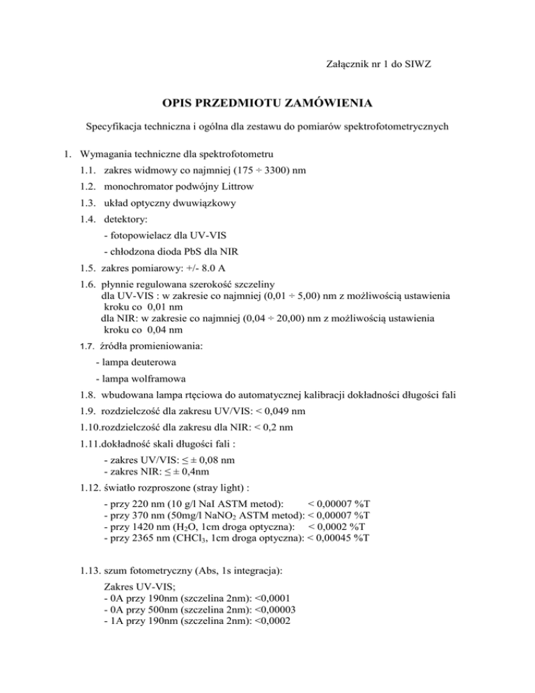 Załącznik nr 1 do SIWZ OPIS PRZEDMIOTU ZAMÓWIENIA Specyfikacja techniczna i ogólna dla zestawu do pomiarów spektrofotometrycznych 1. Wymagania techniczne dla spektrofotometru 1.1. zakres widmowy co najmniej (175 ÷ 3300) nm 1.2. monochromator podwójny Littrow 1.3. układ optyczny dwuwiązkowy 1.4. detektory: - fotopowielacz dla UV-VIS - chłodzona dioda PbS dla NIR 1.5. zakres pomiarowy: +/- 8.0 A 1.6. płynnie regulowana szerokość szczeliny dla UV-VIS : w zakresie co najmniej (0,01 ÷ 5,00) nm z możliwością ustawienia kroku co 0,01 nm dla NIR: w zakresie co najmniej (0,04 ÷ 20,00) nm z możliwością ustawienia kroku co 0,04 nm 1.7. źródła promieniowania: - lampa deuterowa - lampa wolframowa 1.8. wbudowana lampa rtęciowa do automatycznej kalibracji dokładności długości fali 1.9. rozdzielczość dla zakresu UV/VIS: < 0,049 nm 1.10.rozdzielczość dla zakresu dla NIR: < 0,2 nm 1.11.dokładność skali długości fali : - zakres UV/VIS: ≤ ± 0,08 nm - zakres NIR: ≤ ± 0,4nm 1.12. światło rozproszone (stray light) : - przy 220 nm (10 g/l NaI ASTM metod): < 0,00007 %T - przy 370 nm (50mg/l NaNO2 ASTM metod): < 0,00007 %T - przy 1420 nm (H2O, 1cm droga optyczna): < 0,0002 %T - przy 2365 nm (CHCl3, 1cm droga optyczna): < 0,00045 %T 1.13. szum fotometryczny (Abs, 1s integracja): Zakres UV-VIS; - 0A przy 190nm (szczelina 2nm): <0,0001 - 0A przy 500nm (szczelina 2nm): <0,00003 - 1A przy 190nm (szczelina 2nm): <0,0002 - 1A przy 500nm (szczelina 2nm): <0,00006 - 2A przy 500nm (szczelina 2nm): <0,0001 - 3A przy 500nm (szczelina 2nm): <0,0003 - 4A przy 500nm (szczelina 2nm): <0,0008 - 5A przy 500nm (szczelina 2nm): <0,002 - 6A przy 500nm (szczelina 2nm): <0,0045 Zakres NIR: - 0A przy 1500nm (stała energia): <0,00004 - 2A przy 1500nm (stała energia): <0,0005 - 3A przy 1500nm (stała energia): <0,0003 1.14. dokładność fotometryczna ( Abs, Double Apperture): < 0,00025 1.15. liniowość fotometryczna: zakres UV-VIS: - przy 1A: <0,0007 A - przy 2A: <0,0014 A - przy 3A: <0,005 A zakres NIR: - przy 1A: < 0,0015A - przy 2A: < 0,007A 1.16. możliwość pracy z akcesoriami: - uchwytem termostatowanym elementem Peltier’a dla kuwet o drodze optycznej 10 mm w zakresie 0-100°C - uchwytem wielopozycyjnym 6x6 termostatowanym elementem Peltier’a dla kuwet o drodze optycznej 10 mm w zakresie 0-100°C - automatyczną przystawką do wyznaczania dokładności fotometrycznej 2. Konieczne wyposażenie: 2.1.oprogramowanie sterujące zestawem do pomiarów spektrofotometrycznych pracujące w środowisku Windows 2000, Windows XP lub Windows 7 wraz z niezbędnymi kartami komunikacyjnymi. Wymagania licencyjne na oprogramowanie sterujące: - prawo do wielokrotnego użycia jednego obrazu nośnika w procesie instalacji; - prawo do instalowania wszelkich poprawek opublikowanych przez producenta oprogramowania; - prawo do przenoszenia oprogramowania na inny komputer Zamawiającego bez utraty licencji; - prawo do bezpłatnego, w okresie gwarancji, aktualizowania oprogramowania poprzez zainstalowanie, w porozumieniu z Zamawiającym, przez serwis Wykonawcy nowszych wersji oprogramowania z zachowaniem wszystkich pól eksploatacji. 2.2 pełne oprogramowanie umożliwiające co najmniej: - pomiar widmowego współczynnika przepuszczania, gęstości optycznej widmowego współczynnika przepuszczania i długości fali w zakresie opisanym w punktach 1.1, 1.5, 1.6, 1.9, 1.10, 1.11, 1.12, 1.13, 1.14, 1.15 - wykonywanie testów walidacyjnych dla sprawdzenia dokładności skali długości fali 2.3. oprogramowanie umożliwiające wyznaczanie następujących parametrów barwy: • składowych trójchromatycznych X,Y,Z • współrzędnych chromatyczności, x,y,z • parametrów CIE L*a*b* • parametrów CIE L*U*V* • parametrów Hunter Lab L a b 2.4. oprogramowanie pracujące zgodnie z wymogami GLP/GMP. 2.5. uchwyt do ciała stałego umożliwiający wprowadzenie szkiełek 2.6. uchwyt do kuwet i filtrów w oprawkach 1x1 cm 2.7. Komputer: procesor nie gorszy niż klasy x86, dwurdzeniowy, czterowątkowy (min. 2,5 GHz, 3 MB cache), max. TDP 35W, dysk min. HDD 500GB, pamięć: min. 3GB RAM, DVD-RW,USB, 10/100/1000 Mbit/s, mysz i klawiatura USB Monitor: LCD, 22”, min. rozdzielczość HD Sieciowa drukarka laserowa: min. 600 x 600dpi, druk min. 17 str./min w czerni i w kolorze, duplex, wbudowany serwer druku, kolorowa A4, System operacyjny: w wersji 32-bit, poprawnie współpracujący z Microsoft Office Professional 2010 oraz systemem domenowym MS Windows Server, obsługujący technologię Microsoft Silverlight, licencja OEM z nośnikiem, komplet sterowników Oprogramowanie biurowe: oprogramowanie poprawnie współpracujące z systemem operacyjnym MS Windows 7 Professional, zapewniające pełną, bezproblemową konwersję danych i eksport danych z Microsoft Professional Office 2003 i 2007, licencja OEM z nośnikiem UPS: pojemność mocy wyjściowej min. 2000 VA, nominalna wartość napięcia na wyjściu min. 230V, porty DB-9 RS-232, 2U, sterowniki i okablowanie. Wymagania licencyjne do oprogramowania systemowego i biurowego: - prawo do korzystania z oprogramowania zgodnie z jego przeznaczeniem, na komputerze, na którym zostało zainstalowane. 3. Inne wymagania: 3.1. okres gwarancji będzie wynosić co najmniej 12 miesięcy 3.2. serwis gwarancyjny będzie wykonywany w siedzibie Zamawiającego 3.3. instalacja i uruchomienie sprzętu nastąpi we wskazanym laboratorium Zamawiającego 3.4.Wykonawca zapewni przed upływem terminu dostawy przeszkolenie użytkownika w zakresie prawidłowej obsługi przedmiotu zamówienia 3.5.Wykonawca dostarczy przedmiot zamówienia do Głównego Urzędu Miar – Laboratorium Wzorców Spektrofotometrycznych 3.6.termin dostawy: do 10 grudnia 2012 r. 3.7. przedmiot zamówienia musi być fabrycznie nowy, kompletny i po jego zainstalowaniu gotowy do podjęcia działalności bez żadnych dodatkowych kosztów dla Zamawiającego 3.8.Wraz z zestawem spektrofotometrycznym Wykonawca dostarczy instrukc
