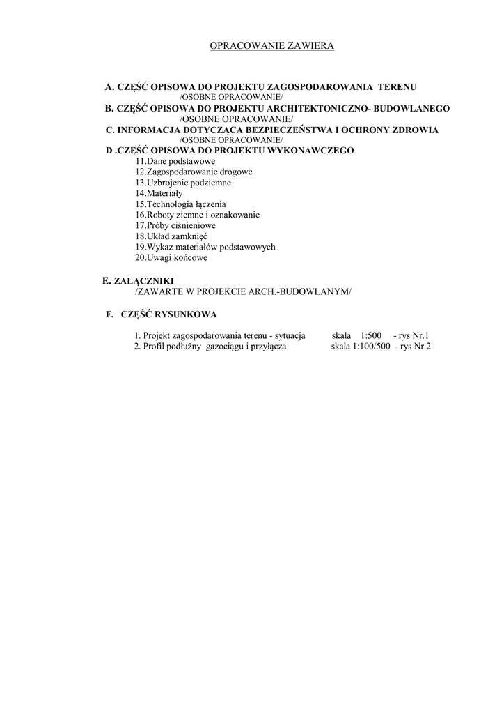 OPRACOWANIE ZAWIERA A. CZĘŚĆ OPISOWA DO PROJEKTU ZAGOSPODAROWANIA TERENU /OSOBNE OPRACOWANIE/ B. CZĘŚĆ OPISOWA DO PROJEKTU ARCHITEKTONICZNO- BUDOWLANEGO /OSOBNE OPRACOWANIE/ C. INFORMACJA DOTYCZĄCA BEZPIECZEŃSTWA I OCHRONY ZDROWIA /OSOBNE OPRACOWANIE/ D .CZĘŚĆ OPISOWA DO PROJEKTU WYKONAWCZEGO 11.Dane podstawowe 12.Zagospodarowanie drogowe 13.Uzbrojenie podziemne 14.Materiały 15.Technologia łączenia 16.Roboty ziemne i oznakowanie 17.Próby ciśnieniowe 18.Układ zamknięć 19.Wykaz materiałów podstawowych 20.Uwagi końcowe E. ZAŁĄCZNIKI /ZAWARTE W PROJEKCIE ARCH.-BUDOWLANYM/ F. CZĘŚĆ RYSUNKOWA 1. Projekt zagospodarowania terenu - sytuacja 2. Profil podłużny gazociągu i przyłącza skala 1:500 - rys Nr.1 skala 1:100/500 - rys Nr.2 „D” CZĘŚĆ OPISOWA DO PROJEKTU WYKONAWCZEGO PRZEBUDOWY UL. ZWYCIĘZCÓW (ODCINEK OD UL. WOJSKA POLSKIEGO DO UL. HARCERSKIEJ ) W SKARŻYSKU KAM. PRZEBUDOWA SIECI GAZOWEJ 11. Dane podstawowe Projekt obejmuje budowę następujących odcinków gazociągów : - dn 50PE wzdłuż ulicy Zwycięzców na odcinku A-B w miejsce będącego w kolizji z projektowaną jezdnią przebudowanego skrzyżowania ul. Zwycięzców i Partyzantów gazociągu dn32 mm, z zabezpieczeniem go jednocześnie rurą osłonową dn90PE - dn 50PE na odcinku B-C włączenie gazociągu dn32PE w ul. Partyzantów do nowego odcinka gazociągu A-B w ul. Zwycięzców w miejsce będącego w kolizji z projektowaną jezdnią rozbudowanego skrzyżowania ul. Zwycięzców i Partyzantów gazociągu dn32 mm - dn 50PE wzdłuż ulicy Zwycięzców na odcinku F-G1-G w miejsce będącego w kolizji z projektowaną jezdnią przebudowanego skrzyżowania ul. Zwycięzców i Harcerskiej gazociągu dn32PE mm, z zabezpieczeniem go jednocześnie rurą osłonową dn90PE - dn 50PE na odcinku I-G1 włączenie gazociągu dn32PE w ul. Harcerskiej do nowego odcinka gazociągu F-G1-G w ul. Zwycięzców w miejsce będącego w kolizji z projektowaną jezdnią rozbudowanego skrzyżowania ul. Zwycięzców i Harcerskiej gazociągu dn32PE mm -O1-O2 - rura osłonowa dn 90PE - zabezpieczenie istniejącego gazociągu dn32PE na przekroczeniu jezdni ul. Zwycięzców w rejonie skrzyżowania z ul. Partyzantów. -O3-O4 - rura osłonowa dn 90PE - zabezpieczenie gazociągu dn32PE w ul. Zwycięzców przekroczeniu jezdni ul. 17-go Stycznia na -H1-H - rura osłonowa dn 90PE - zabezpieczenie przyłącza na przekroczeniu jezdni ul. Zwycięzców do budynku Nr.21, oraz jego przedłużenie do włączenia z przebudowanym na odcinku F-G1-G gazociągiem dn32PE 12. Zagospodarowanie drogowe Skrzyżowania projektowanej sieci gazowej z przebudowywanymi odcinkami ulic projektuje się wykonać wykopem otwartym, zabezpieczając przewody gazowe rurami osłonowymi z rur PE. Średnice i długości rur osłonowych dla wykonania ww. przekroczeń przedstawiono na rysunkach projektu zagospodarowania terenu, oraz na profilach przekroczeń sieci gazowej, które szczegółowo określają zagłębienia przewodów gazowych na ww. skrzyżowaniach dostosowane do rzędnych projektowanych ulic. Jako prowadnice rur przewodowych w rurach osłonowych należy zastosować pierścienie oporowe lub specjalne płozy dystansowe. Uszkodzone nawierzchnie istniejącego zagospodarowania drogowego ulegną rekonstrukcji w trakcie realizacji wymiany nawierzchni zgodnie z warunkami określonymi w decyzjach zarządców dróg na podstawie projektu drogowego. 13. Uzbrojenie podziemne Skrzyżowania projektowanych przewodów gazowych z uzbrojeniem podziemnym w postaci rurociągów wody, gazu, kanalizacji sanitarnej i deszczowej, przewodów energetycznych i teletechnicznych, oraz kanalizacji kablowej wymagają zachowania odległości pionowej między zewnętrznymi ściankami przewodu gazowego, a zewnętrznymi ściankami krzyżujących się przewodów podziemnych w wielkości minimum 20cm. Odległość ta może być zmniejszona pod warunkiem zastosowania rur osłonowych na sieci gazowej, lub osłon montowanych na przewodach energetycznych i teletechnicznych. Na przewodach gazowych należy montować rury osłonowe (RO) z PE szeregu SDR 17,6 o długościach minimum 1,5m, układanych symetrycznie w stosunku do osi krzyżujących się przewodów. Na kablach należy montować osłony rurowe dzielone do kabli AROT, typ PS 110 PE, o długościach minimum 1,0m (po 0,5m na stronę od osi przewodu gazowego).Skrzyżowania projektowanej sieci gazowej z przeszkodami terenowymi należy wykonać zgodnie z normą PN–91/M–34501, przy uwzględnieniu projektu postanowień Rozporządzenia Ministra Gospodarki z dnia 2001.07.30 w sprawie warunków technicznych jakim powinny odpowiadać sieci gazowe. 13. Materiały Rury PE Przewody gazowe projektuje się z rur PE typ 100, szeregu SDR 11. Na rury osłonowe zaleca się rury PE szeregu SDR 17,6, Rury polietylenowe służące do rozprowadzania gazu powinny posiadać atest Instytutu Górnictwa Naftowego i Gazownictwa w Krakowie. Należy stosować rury w kolorze żółtym. Rury powinny być odpowiednio oznakowane przez producenta. Rury PE winny spełniać wymogi normy PN-EN 1555:2004 „Systemy przewodów gazowych z tworzyw sztucznych do przesyłania paliw gazowych. Polietylen (PE)”. Kształtki PE Zmiany kierunku trasy o kątach ostrych projektowanego przewodu gazowego należy realizować przy pomocy fabrycznie wykonanych kształtek. Zmiany kierunku trasy o kątach łagodnych dokonywane będą przy wykorzystaniu elastyczności rur PE. Minimalny promień gięcia rur PE w temperaturze 00C wynosi 50 x d, w temperaturze +100C 35 x d, a w temperaturze +200C 20 x d, gdzie d – średnica zewnętrzna rury PE. Złącza PE/STAL Kształtki te nie występują w opracowaniu 14. Technologia łączenia Rury PE Łączenie rur polietylenowych o średnicach do 63mm włącznie, należy wykonywać tylko metodą zgrzewania elektrooporowego, przy użyciu kształtek z wtopionym drutem elektrooporowym. W elektro-kształtki wsuwa się przycięte prostopadle i oczyszczone skro