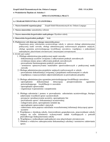Zespół Szkół Ekonomicznych im. Oskara Langego ZSE: 111.6.2016 w Wodzisławiu Śląskim ul. Szkolna 1 OPIS STANOWISKA PRACY A. CHARAKTERYSTYKA STANOWISKA 1. Nazwa komórki organizacyjnej: Zespół Szkół Ekonomicznych im. Oskara Langego 2. Nazwa stanowiska: samodzielny referent 3. Nazwa stanowiska bezpośrednio nadrzędnego: Dyrektor szkoły 4. Stanowiska bezpośrednio podległe: brak 5. Podstawowe cele dotyczące danego stanowiska pracy: Organizacja pracy sekretariatu uczniowskiego szkoły w zakresie obsługi administracyjnej praktycznej nauki zawodu, obsługi administracyjnej realizowanych projektów unijnych, obsługi egzaminu potwierdzającego kwalifikacje zawodowe, współpracy z jednostkami nadrzędnymi, placówkami oświatowymi i instytucjami zewnętrznymi. 6. Krótki opis zadań: 1. Obsługa administracyjna praktycznej nauki zawodu: - dokumentacja uczniów związana z odbywaniem praktyk zawodowych - ewidencja miejsc pracy odbywania praktyk zawodowych - prowadzenie harmonogramu praktyk zawodowych - terminowe opracowywanie materiałów sprawozdawczych z praktycznej nauki zawodu 2. Obsługa administracyjna projektów unijnych realizowanych w szkole - prowadzenie dokumentacji związanej z projektami realizowanymi w szkole - współpraca z nauczycielami odpowiedzialnymi za prowadzone projekty 3. Obsługa administracyjna egzaminu potwierdzającego kwalifikacje zawodowe - sporządzanie dokumentacji dotyczącej przeprowadzenia egzaminu potwierdzającego kwalifikacje w zawodzie - sporządzanie sprawozdań - organizacja wyposażenia i zaopatrzenia 4. Obsługa sekretariat i pomoc w prowadzeniu sekretariatu uczniowskiego, bieżące załatwianie wszelkich spraw uczniowskich - przyjęcia i przekazywania uczniów, sporządzanie list - prowadzenie spraw i dokumentacji uczniowskiej - redagowanie pism, sporządzanie notatek itp. - sporządzanie sprawozdań i statystyk - załatwianie stron poprzez udzielanie wszechstronnej informacji dotyczącej spraw uczniów 5. Współpraca z dyrekcją szkoły, kierownikiem gospodarczym, pracownikami szkoły mająca na celu terminowe wykonywanie zadań wynikających z potrzeb prawidłowego funkcjonowania szkoły 6. Współpraca z jednostkami nadrzędnymi oraz placówkami oświatowymi. 7. Dbałość o właściwe zabezpieczenie dokumentacji szkolnej i terminowe załatwianie spraw. 1 7. Odpowiedzialność: - służbowa: wynikająca z powszechnie obowiązujących przepisów prawa - finansowa: wynikająca z powszechnie obowiązujących przepisów prawa - inna : wynikająca z powszechnie obowiązujących przepisów prawa 8. Upoważnienia na stanowisku. Samodzielność decyzyjna. Przygotowywanie bądź parafowanie dokumentów oraz korespondencji związanej z zakresem obowiązków. 9. Współpraca (kontakty służbowe wewnętrzne i zewnętrzne): Wewnętrzna: wszystkie komórki Zespołu Szkół Ekonomicznych, Zewnętrzna: instytucje publiczne. 10. Zasady określania zastępstw (zaznaczyć właściwe): Zgodnie z decyzją Dyrektora szkoły w sprawie określania zastępstw. 11. Informacja o warunkach pracy (wymaga konsultacji z komórką BHP): - praca biurowa: ……………………………………………………………………………………………… - praca - praca: szczególnej koncentracji …………………………………………………………………….; nie jest przystosowane do pracy na wózku inwalidzkim; - praca wymaga współpracy z systemem informatycznym: godzin; jest z bezpośrednim kontaktem z klientem; - inne (opisać jakie)…………………………………………………………………………. 12. Niezbędne wyposażenie na stanowisku pracy (np. sprzęt informatyczny, oprogramowanie, środki łączności i inne urządzenia): biurko, krzesło obrotowe, szafa na dokumenty, komputer z oprogramowaniem (Word, Excel, program antywirusowy), drukarka, niszczarka, kalkulator, aparat telefoniczny, pendrive B. WYMAGANIA OSOBOWE. 1. Niezbędny poziom i kierunek wykształcenia na stanowisku: - co najmniej wykształcenie wyższe magisterskie 2. Niezbędny staż pracy i doświadczenie zawodowe: - co najmniej 2- letni staż pracy na tym samym lub podobnym stanowisku 3. Niezbędne uprawnienia zawodowe: brak 4. Niezbędne umiejętności i predyspozycje: brak 5. 1) 2) 3) Inne pożądane wyznaczniki decydujące o indywidualnym charakterze danego stanowiska: Doświadczenie w prowadzeniu spraw uczniowskich i obsługi sekretariatu, Znajomość ustawy o pracownikach samorządowych, Znajomość ustawy o ochronie danych osobowych, 2 4) Znajomość Rozporządzenia Ministra Edukacji w sprawie sposobu prowadzenia dokumentacji przebiegu nauczania oraz rodzajów tej dokumentacji, 2) Samodzielność w działaniu, 3) Dyspozycyjność, 4) Operatywność, 5) Umiejętność pracy w zespole, 6) Dobra organizacja pracy. Wodzisław Śl. dnia 03.11.2016r. Dyrektor Zespołu Szkół Ekonomicznych im. Oskara Langego /-/ Maria Lach 3