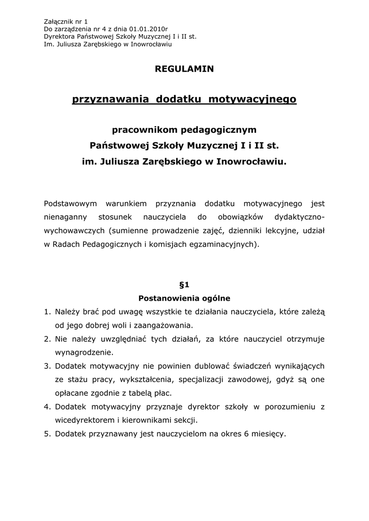 Załącznik nr 1 Do zarządzenia nr 4 z dnia 01.01.2010r Dyrektora Państwowej Szkoły Muzycznej I i II st. Im. Juliusza Zarębskiego w Inowrocławiu REGULAMIN przyznawania dodatku motywacyjnego pracownikom pedagogicznym Państwowej Szkoły Muzycznej I i II st. im. Juliusza Zarębskiego w Inowrocławiu. Podstawowym nienaganny warunkiem stosunek przyznania nauczyciela dodatku do motywacyjnego obowiązków jest dydaktyczno- wychowawczych (sumienne prowadzenie zajęć, dzienniki lekcyjne, udział w Radach Pedagogicznych i komisjach egzaminacyjnych). §1 Postanowienia ogólne 1. Należy brać pod uwagę wszystkie te działania nauczyciela, które zależą od jego dobrej woli i zaangażowania. 2. Nie należy uwzględniać tych działań, za które nauczyciel otrzymuje wynagrodzenie. 3. Dodatek motywacyjny nie powinien dublować świadczeń wynikających ze stażu pracy, wykształcenia, specjalizacji zawodowej, gdyż są one opłacane zgodnie z tabelą płac. 4. Dodatek motywacyjny przyznaje dyrektor szkoły w porozumieniu z wicedyrektorem i kierownikami sekcji. 5. Dodatek przyznawany jest nauczycielom na okres 6 miesięcy. §2 Postanowienia szczegółowe 1. Praca nauczyciela będzie oceniania w następujących dziedzinach: a) działalność dydaktyczna -prowadzenie nieodpłatnie (udokumentowanych),dodatkowych zajęć, z uczniami zdolnymi jak również pomoc uczniom posiadającym trudności w nauce, -przygotowanie uczniów do konkursów, przesłuchań przedmiotowych, artystycznych i innych na szczeblu wojewódzkim, regionalnym i ogólnopolskim, -wprowadzanie i stosowanie nowych metod nauczania, poszerzania literatury, organizacji własnych zasobów nutowych, -przygotowanie uczniów do koncertów szkolnych i poza szkolnych, - wysokie wyniki nauczania – średnia klasy b) samokształcenie -udział czynny i bierny w kursach przedmiotowych, przesłuchaniach, konkursach, festiwalach; c) działalność wychowawcza i opiekuńcza -praca z zespołem klasowym – integracyjne spotkania, koncerty, wyjazdy, frekwencja na zajęciach, udział w koncertach jako wykonawca i słuchacz, -inspirowanie i aktywizowanie rodziców na rzecz szkoły, klasy, -organizowanie imprez szkolnych, -organizowanie wycieczek szkolnych, przedmiotowych, -współpraca z rodzicami uczniów sprawiających kłopoty wychowawcze, -praca na rzecz środowiska (organizowanie i uczestnictwo w imprezach środowiskowych), -opieka nad młodzieżą wyjeżdżającą na konkursy, przesłuchania, festiwale, - opieka nad Samorządem Uczniowskim, d) udział w organach statutowych szkoły - wykonywanie prac na rzecz szkoły poza godzinami pracy, np. usługi transportowe, organizacje imprez, uroczystości, - przewodniczenie pracom komisji szkolnych, -prowadzenie kroniki szkoły, jeżeli nie jest opłacana z innych funduszy, -współpraca z bibliotekarzem w celu wzbogacania księgozbioru. 2. Dodatek motywacyjny nie przysługuje nauczycielom, którzy : a) przebywają na urlopach zdrowotnych lub bezpłatnych, b) powracają z urlopów – zdrowotnych, bezpłatnych, wychowawczych (nabywają uprawnienia po przepracowaniu pół roku), c) nie uczestniczą w wyznaczonych komisjach egzaminacyjnych, d) nie uczestniczą w popisach organizowanych w ramach sekcji. 3. Dodatek ustalony będzie również na podstawie samodzielnie wypełnionej przez nauczyciela ankiety, dostarczonej w wyznaczonym terminie, potwierdzonej przez kierownika sekcji. 4. Dyrektor szkoły, w porozumieniu z wicedyrektorem i kierownikami sekcji, dokonuje 2 razy w roku analizy i oceny pracy wszystkich pracowników pedagogicznych szkoły, po czym podejmuje decyzję o przyznaniu dodatku motywacyjnego informując pisemnie nauczycieli o podjętej decyzji. Informacja ta jest przekazywana do księgowości i dołączona do akt personalnych nauczycieli. 5. Dyrektor ma prawo stosowania dodatkowych kryteriów nie ujętych w powyższym regulaminie. §3 Regulamin wchodzi w życie dnia 01.01.2010r. po upływie dwóch tygodni od dnia podania go do wiadomości pracowników poprzez wyłożenie do wglądu w komórce kadrowej. …………………………………………… Podpis dyrektora