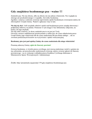 Gdy znajdziesz bezdomnego psa - ważne !!! Znalazłeś psa. Nie ma obroży, albo na obroży nie ma adresu właściciela. Nie wygląda na chorego ani poszkodowanego w wypadku. Jest tylko bezdomny. Zgodnie z ustawą o ochronie zwierząt zapewnienie opieki bezdomnym zwierzętom należy do obowiązków Urzędu Gminy. Wpierw zgłaszasz więc to tam. Nie daj się zbyć. Jeśli urzędnik odmówi opieki nad bezdomnym psem zażądaj datowanej i podpisanej odmowy na piśmie. Pomocne w tym mogą Ci być dokumenty załączone, na końcu, do tego artykułu. Nie daj sobie wmówić, że skoro znalazłeś psa to on jest już Twój. Owszem, możesz zadeklarować przetrzymanie u siebie psa, do czasu odnalezienia przez Urząd Gminy jego właściciela lub do czasu znalezienia dla psa domu stałego ... ale za zwrotem poniesionych kosztów na wyżywienie i opieki weterynaryjnej. Bezdomny pies jest pod opieką Gminy do czasu znalezienia dla niego właściciela! Pisemną odmowę Gminy zgłoś do Starosty powiatu! Zwierzę bezdomne, w świetle prawa cywilnego, jest rzeczą znalezioną i jeżeli w gminie nie ma schroniska, ani przechowalni znalezionych zwierząt, należy zwierzę zgłosić do Starosty powiatowego - na co wskazuje wykładnia prawa Kodeksu Cywilnego dokonana w Ministerstwie Spraw Wewnętrznych i Administracji. Źródło: http://proanimals.org/porady/179-gdy-znajdziesz-bezdomnego-psa