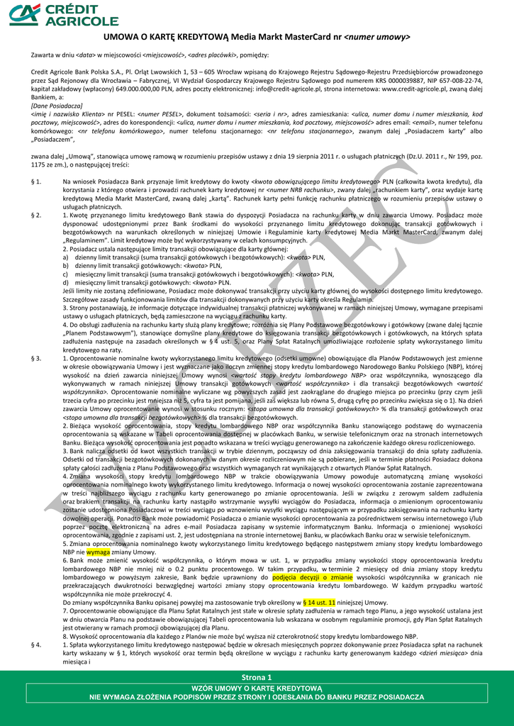 UMOWA O KARTĘ KREDYTOWĄ Media Markt MasterCard nr <numer umowy> Zawarta w dniu <data> w miejscowości <miejscowośd>, <adres placówki>, pomiędzy: Credit Agricole Bank Polska S.A., Pl. Orląt Lwowskich 1, 53 – 605 Wrocław wpisaną do Krajowego Rejestru Sądowego-Rejestru Przedsiębiorców prowadzonego przez Sąd Rejonowy dla Wrocławia – Fabrycznej, VI Wydział Gospodarczy Krajowego Rejestru Sądowego pod numerem KRS 0000039887, NIP 657-008-22-74, kapitał zakładowy (wpłacony) 649.000.000,00 PLN, adres poczty elektronicznej: [email protected], strona internetowa: www.credit-agricole.pl, zwaną dalej Bankiem, a: [Dane Posiadacza] <imię i nazwisko Klienta> nr PESEL: <numer PESEL>, dokument tożsamości: <seria i nr>, adres zamieszkania: <ulica, numer domu i numer mieszkania, kod pocztowy, miejscowośd>, adres do korespondencji: <ulica, numer domu i numer mieszkania, kod pocztowy, miejscowośd> adres email: <email>, numer telefonu komórkowego: <nr telefonu komórkowego>, numer telefonu stacjonarnego: <nr telefonu stacjonarnego>, zwanym dalej „Posiadaczem karty” albo „Posiadaczem”, zwana dalej „Umową”, stanowiąca umowę ramową w rozumieniu przepisów ustawy z dnia 19 sierpnia 2011 r. o usługach płatniczych (Dz.U. 2011 r., Nr 199, poz. 1175 ze zm.), o następującej treści: § 1. § 2. § 3. § 4. Na wniosek Posiadacza Bank przyznaje limit kredytowy do kwoty <kwota obowiązującego limitu kredytowego> PLN (całkowita kwota kredytu), dla korzystania z którego otwiera i prowadzi rachunek karty kredytowej nr <numer NRB rachunku>, zwany dalej „rachunkiem karty”, oraz wydaje kartę kredytową Media Markt MasterCard, zwaną dalej „kartą”. Rachunek karty pełni funkcję rachunku płatniczego w rozumieniu przepisów ustawy o usługach płatniczych. 1. Kwotę przyznanego limitu kredytowego Bank stawia do dyspozycji Posiadacza na rachunku karty w dniu zawarcia Umowy. Posiadacz może dysponowad udostępnionymi przez Bank środkami do wysokości przyznanego limitu kredytowego dokonując transakcji gotówkowych i bezgotówkowych na warunkach określonych w niniejszej Umowie i Regulaminie karty kredytowej Media Markt MasterCard, zwanym dalej „Regulaminem”. Limit kredytowy może byd wykorzystywany w celach konsumpcyjnych. 2. Posiadacz ustala następujące limity transakcji obowiązujące dla karty głównej: a) dzienny limit transakcji (suma transakcji gotówkowych i bezgotówkowych): <kwota> PLN, b) dzienny limit transakcji gotówkowych: <kwota> PLN, c) miesięczny limit transakcji (suma transakcji gotówkowych i bezgotówkowych): <kwota> PLN, d) miesięczny limit transakcji gotówkowych: <kwota> PLN. Jeśli limity nie zostaną zdefiniowane, Posiadacz może dokonywad transakcji przy użyciu karty głównej do wysokości dostępnego limitu kredytowego. Szczegółowe zasady funkcjonowania limitów dla transakcji dokonywanych przy użyciu karty określa Regulamin. 3. Strony postanawiają, że informacje dotyczące indywidualnej transakcji płatniczej wykonywanej w ramach niniejszej Umowy, wymagane przepisami ustawy o usługach płatniczych, będą zamieszczone na wyciągu z rachunku karty. 4. Do obsługi zadłużenia na rachunku karty służą plany kredytowe; rozróżnia się Plany Podstawowe bezgotówkowy i gotówkowy (zwane dalej łącznie „Planem Podstawowym”), stanowiące domyślne plany kredytowe do księgowania transakcji bezgotówkowych i gotówkowych, na których spłata zadłużenia następuje na zasadach określonych w § 4 ust. 5, oraz Plany Spłat Ratalnych umożliwiające rozłożenie spłaty wykorzystanego limitu kredytowego na raty. 1. Oprocentowanie nominalne kwoty wykorzystanego limitu kredytowego (odsetki umowne) obowiązujące dla Planów Podstawowych jest zmienne w okresie obowiązywania Umowy i jest wyznaczane jako iloczyn zmiennej stopy kredytu lombardowego Narodowego Banku Polskiego (NBP), której wysokośd na dzieo zawarcia niniejszej Umowy wynosi <wartośd stopy kredytu lombardowego NBP> oraz współczynnika, wynoszącego dla wykonywanych w ramach niniejszej Umowy transakcji gotówkowych <wartośd współczynnika> i dla transakcji bezgotówkowych <wartośd współczynnika>. Oprocentowanie nominalne wyliczane wg powyższych zasad jest zaokrąglane do drugiego miejsca po przecinku (przy czym jeśli trzecia cyfra po przecinku jest mniejsza niż 5, cyfra ta jest pomijana, jeśli zaś większa lub równa 5, drugą cyfrę po przecinku zwiększa się o 1). Na dzieo zawarcia Umowy oprocentowanie wynosi w stosunku rocznym: <stopa umowna dla transakcji gotówkowych> % dla transakcji gotówkowych oraz <stopa umowna dla transakcji bezgotówkowych> % dla transakcji bezgotówkowych. 2. Bieżąca wysokośd oprocentowania, stopy kredytu lombardowego NBP oraz współczynnika Banku stanowiącego podstawę do wyznaczenia oprocentowania są wskazane w Tabeli oprocentowania dostępnej w placówkach Banku, w serwisie telefonicznym oraz na stronach internetowych Banku. Bieżąca wysokośd oprocentowania jest ponadto wskazana w treści wyciągu generowanego na zakooczenie każdego okresu rozliczeniowego. 3. Bank nalicza odsetki od kwot wszystkich transakcji w trybie dziennym, począwszy od dnia zaksięgowania transakcji do dnia spłaty zadłużenia. Odsetki od transakcji bezgotówkowych dokonanych w danym okresie rozliczeniowym nie są pobierane, jeśli w terminie płatności Posiadacz dokona spłaty całości zadłużenia z Planu Podstawowego oraz wszystkich wymaganych rat wynikających z otwartych Planów Spłat Ratalnych. 4. Zmiana wysokości stopy kredytu lombardowego NBP w trakcie obowiązywania Umowy powoduje automatyczną zmianę wysokości oprocentowania nominalnego kwoty wykorzystanego limitu kredytowego. Informacja o nowej wysokości oprocentowania zostanie zaprezentowana w treści najbliższego wyciągu z rachunku karty generowanego po zmianie oprocentowania. Jeśli w związku z zerowym saldem zadłużenia oraz brakiem transakcji na rachunku karty n