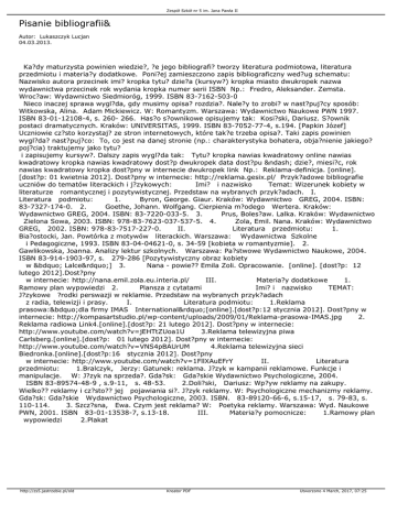 Zespół Szkół nr 5 im. Jana Pawła II Pisanie bibliografii& Autor: Lukaszczyk Lucjan 04.03.2013. Ka?dy maturzysta powinien wiedzie?, ?e jego bibliografi? tworzy literatura podmiotowa, literatura przedmiotu i materia?y dodatkowe. Poni?ej zamieszczono zapis bibliograficzny wed?ug schematu: Nazwisko autora przecinek imi? kropka tytu? dzie?a (kursyw?) kropka miasto dwukropek nazwa wydawnictwa przecinek rok wydania kropka numer serii ISBN Np.: Fredro, Aleksander. Zemsta. Wroc?aw: Wydawnictwo Siedmioróg, 1999. ISBN 83-7162-503-0 Nieco inaczej sprawa wygl?da, gdy musimy opisa? rozdzia?. Nale?y to zrobi? w nast?puj?cy sposób: Witkowska, Alina. Adam Mickiewicz. W: Romantyzm. Warszawa: Wydawnictwo Naukowe PWN 1997. ISBN 83-01-12108-4, s. 260- 266. Has?o s?ownikowe opisujemy tak: Kosi?ski, Dariusz. S?ownik postaci dramatycznych. Kraków: UNIVERSITAS, 1999. ISBN 83-7052-77-4, s.194. [Papkin Józef] Uczniowie cz?sto korzystaj? ze stron internetowych, które tak?e trzeba opisa?. Taki zapis powinien wygl?da? nast?puj?co: To, co jest na danej stronie (np.: charakterystyka bohatera, obja?nienie jakiego? poj?cia) traktujemy jako tytu? i zapisujemy kursyw?. Dalszy zapis wygl?da tak: Tytu? kropka nawias kwadratowy online nawias kwadratowy kropka nawias kwadratowy dost?p dwukropek data dost?pu – dzie?, miesi?c, rok nawias kwadratowy kropka dost?pny w internecie dwukropek link Np.: Reklama-definicja. [online]. [dost?p: 01 kwietnia 2012]. Dost?pny w internecie: http://reklama.gesix.pl/ Przyk?adowe bibliografie uczniów do tematów literackich i j?zykowych: Imi? i nazwisko Temat: Wizerunek kobiety w literaturze romantycznej i pozytywistycznej. Przedstaw na wybranych przyk?adach. I. Literatura podmiotu: 1. Byron, George. Giaur. Kraków: Wydawnictwo GREG, 2004. ISBN: 83-7327-174-0. 2. Goethe, Johann. Wolfgang. Cierpienia m?odego Wertera. Kraków: Wydawnictwo GREG, 2004. ISBN: 83-7220-033-5. 3. Prus, Boles?aw. Lalka. Kraków: Wydawnictwo Zielona Sowa, 2003. ISBN: 978-83-7623-037-537-5. 4. Zola, Emil. Nana. Kraków: Wydawnictwo GREG, 2002. ISBN: 978-83-7517-227-0. II. Literatura przedmiotu: 1. Bia?ostocki, Jan. Powtórka z motywów literackich. Warszawa: Wydawnictwa Szkolne i Pedagogiczne, 1993. ISBN 83-04-04621-0, s. 34-59 [kobieta w romantyzmie]. 2. Gawlikowska, Joanna. Analizy lektur szkolnych. Warszawa: Pa?stwowe Wydawnictwo Naukowe, 2004. ISBN 83-914-1903-97, s. 279-286 [Pozytywistyczny obraz kobiety w „ Lalce”] 3. Nana - powie?? Emila Zoli. Opracowanie. [online]. [dost?p: 12 lutego 2012].Dost?pny w internecie: http://nana.emil.zola.eu.interia.pl/ III. Materia?y dodatkowe 1. Ramowy plan wypowiedzi 2. Plansza z cytatami Imi? i nazwisko TEMAT: J?zykowe ?rodki perswazji w reklamie. Przedstaw na wybranych przyk?adach z radia, telewizji i prasy. I. Literatura podmiotu: 1.Reklama prasowa:„dla firmy IMAS International”[online].[dost?p:12 stycznia 2012]. Dost?pny w internecie: http://kompasartstudio.pl/wp-content/uploads/2009/01/Reklama-prasowa-IMAS.jpg 2. Reklama radiowa Link4.[online].[dost?p: 21 lutego 2012]. Dost?pny w internecie: http://www.youtube.com/watch?v=jEHTtZUoa1U 3.Reklama telewizyjna piwa Carlsberg.[online].[dost?p: 01 lutego 2012]. Dost?pny w internecie: http://www.youtube.com/watch?v=VNS4pBAUrUM 4.Reklama telewizyjna sieci Biedronka.[online].[dost?p:16 stycznia 2012]. Dost?pny w internecie: http://www.youtube.com/watch?v=1FllXAuEFrY II. Literatura przedmiotu: 1.Bralczyk, Jerzy: Gatunek: reklama. J?zyk w kampanii reklamowe. Funkcje i manipulacje. W: J?zyk na sprzeda?. Gda?sk: Gda?skie Wydawnictwo Psychologiczne, 2004. ISBN 83-89574-48-9 , s.9-11, s. 48-53. 2.Doli?ski, Dariusz: Wp?yw reklamy na zakupy. Wielko?? reklamy i cz?sto?? jej pojawiania si?. J?zyk reklamy. W: Psychologiczne mechanizmy reklamy. Gda?sk: Gda?skie Wydawnictwo Psychologiczne, 2003. ISBN. 83-89120-66-6, s.15-17, s. 79-83, s. 110-114. 3. Szcz?sna, Ewa. Czym jest reklama? W: Poetyka reklamy. Warszawa: Wyd. Naukowe PWN, 2001. ISBN 83-01-13538-7, s.13-18. III. Materia?y pomocnicze: 1.Ramowy plan wypowiedzi 2.Plakat http://zs5.jastrzebie.pl/old Kreator PDF Utworzono 4 March, 2017, 07:25