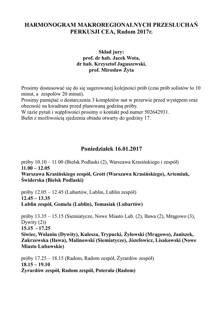 HARMONOGRAM MAKROREGIONALNYCH PRZESŁUCHAŃ PERKUSJI CEA, Radom 2017r. Skład jury: prof. dr hab. Jacek Wota, dr hab. Krzysztof Jaguszewski, prof. Mirosław Żyta Prosimy dostosować się do się sugerowanej kolejności prób (czas prób solistów to 10 minut, a zespołów 20 minut). Prosimy pamiętać o dostarczeniu 3 kompletów nut w przerwie przed występem oraz obecność na kwadrans przed planowaną godziną próby. W razie pytań i wątpliwości prosimy o kontakt pod numer 502642931. Bufet z możliwością zjedzenia obiadu otwarty do godziny 17. Poniedziałek 16.01.2017 próby 10.10 – 11.00 (Bielsk Podlaski (2), Warszawa Krasińskiego i zespół) 11.00 – 12.05 Warszawa Krasińskiego zespół, Grott (Warszawa Krasińskiego), Artemiuk, Świderska (Bielsk Podlaski) próby 12.05 – 12.45 (Lubartów, Lublin, Lublin zespół) 12.45 – 13.35 Lublin zespół, Gomela (Lublin), Tomasiak (Lubartów) próby 13.35 – 15.15 (Siemiatycze, Nowe Miasto Lub. (2), Iława (2), Mrągowo (3), Dywity (2)) 15.15 - 17.25 Siwiec, Wolanin (Dywity), Kulesza, Trypucki, Żyłowski (Mrągowo), Janiszek, Zakrzewska (Iława), Malinowski (Siemiatycze), Józefowicz, Lisakowski (Nowe Miasto Lubawskie) próby 17.25 – 18.15 (Radom, Radom zespół, Żyrardów zespół) 18.15 – 19.10 Żyrardów zespół, Radom zespół, Poterała (Radom) Wtorek 17.01.2017 próby 8.30 – 9.30 (Giżycko (2), Gołdap, Suwałki, Augustów (2)) 9.30 – 11.00 Filipowicz, Haraburda (Augustów), Piniaga (Gołdap), Jagłowski (Suwałki), Chopcia, Teleńko (Giżycko) próby 11.00 – 12.20 (Warszawa Wiktorska, Warszawa Miodowa, Puławy, Płock, Płock zespół, Chełm zespół) 12.20 – 14.00 Chełm zespół, Płock zespół, Jezierski (Płock), Rajzyngier (Puławy), Ostrowski (Warszawa Wiktorska), Bogdańska (Warszawa Miodowa) próby 14.00 – 15.00 (Zambrów, Ostrołęka, Łomża (2), Żyrardów (2)) 15.00 – 16.30 Komża, Zagajewski (Żyrardów), Stefanowicz (Zambrów), Brzostowski (Ostrołęka), Jankiewicz, Szulczyńska (Łomża) próby 16.30 – 17.40 (Warszawa Namysłowska, Wołomin, Warszawa Grochowska, Sochaczew (2), Sochaczew zespół 17.40 – 19.15 Sochaczew zespół, Misiak, Fortuna (Sochaczew), Wardak (Warszawa Grochowska), Kielak (Wołomin), Wąsik (Warszawa Namysłowska) Środa 18.01.2017 próby 8.40 – 9.30 (Białystok) 9.30 – 10.45 Borówko, Fidziukiewicz, Januszewski, Klimiuk, Suchocki (Białystok) próby 10.45 – 11.45 (Kozienice, Grodzisk, Białystok zespół, Warszawa Tyszkiewicza zespół) 11.45 – 12.55 Warszawa Tyszkiewicza zespół, Białystok zespół, Kocyk (Kozienice), Remiszewska (Grodzisk) próby 12.55 – 14.25 (Lidzbark (2), Olsztyn (2), Elbląg (3) i zespół) 14.25 – 16.30 zespół, Grabowski, Wach, Zieliński (Elbląg), Dera, Szałkowski (Olsztyn), Bernatowicz, Ulewicz (Lidzbark Warmiński)