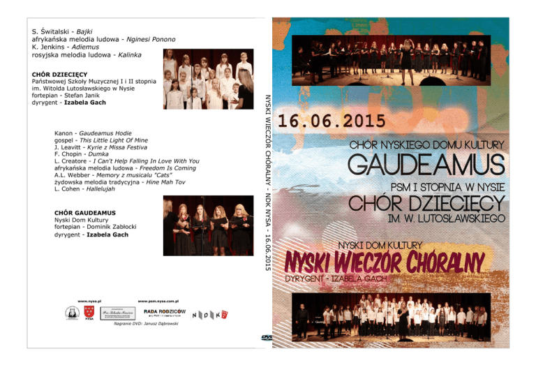 S. Świtalski - Bajki afrykańska melodia ludowa - Nginesi Ponono K. Jenkins - Adiemus rosyjska melodia ludowa - Kalinka Kanon - Gaudeamus Hodie gospel - This Little Light Of Mine J. Leavitt - Kyrie z Missa Festiva F. Chopin - Dumka L. Creatore - I Can't Help Falling In Love With You afrykańska melodia ludowa - Freedom Is Coming A.L. Webber - Memory z musicalu "Cats" żydowska melodia tradycyjna - Hine Mah Tov L. Cohen - Hallelujah CHÓR GAUDEAMUS Nyski Dom Kultury fortepian - Dominik Zabłocki dyrygent - Izabela Gach www.nysa.pl www.psm.nysa.com.pl Nagranie DVD: Janusz Dąbrowski NYSKI WIECZÓR CHÓRALNY - NDK NYSA - 16.06.2015 CHÓR DZIECIĘCY Państwowej Szkoły Muzycznej I i II stopnia im. Witolda Lutosławskiego w Nysie fortepian - Stefan Janik dyrygent - Izabela Gach