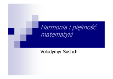 Harmonia i piękność matematyki Volodymyr Sushch Wzór Eulera Zasada złotego podziału Teoria Fraktali Wzór Eulera Równość jest otrzymana ze wzoru Eulera ix e podstawiając = cos x + i sin x Złoty podział Złoty podział liczby Złoty podział dla liczby a tej liczby w postaci sumy ≠ 0 a=b+c dwu składników b , c, takich, Ŝe a b = b c jest to przedstawienie Złoty podział odcinka Zloty podział odcinka jest to wewnętrzny podział tego odcinka na dwie nierówne części tak, aby stosunek długości odcinka a do jego większej części x był równy stosunkowi części x do części mniejszej (a – x), tzn. a x = x a− x czyli x 2 + ax − a 2 = 0 Liczba ϕ (fi) Liczba ϕ jest stałą, która wyraŜa stosunek dwóch części odcinka podzielonego podziałem złotym: a 5 +1 ϕ= = x 2 ϕ ≈ 1,61803398... 1 = ϕ −1 ϕ Ciąg Fibonacciego 1, 1, 2, 3, 5, 8, 13, 21, 34, 55, 89, ... KaŜdy jego wyraz z wyjątkiem dwóch pierwszych powstaje poprzez dodanie do siebie dwóch wyrazów poprzednich. Liczba ϕ ma ścisły związek z ciągiem Fibonacciego. Stosunek dwóch kolejnych wyrazów ciągu Fibonacciego w miarę wzrastania ciągu jest coraz bliŜszy wartości ϕ, np. 13 34 89 = 1,625, = 1,619..., = 1,618..., 8 21 55 Ciąg Fibonacciego ma liczne odpowiedniki w zjawiskach przyrody, np. w biologii, w botanice. Złoty prostokąt Prostokąt, w którym stosunek boków wynosi ϕ nazywamy złotym prostokątem. Konstrukcja złotego prostokąta Pentagram Pentagram jest to pięciokąt foremny gwiaździsty StaroŜytni Grecy uwaŜali złoty podział za idealną proporcję, którą chętnie realizowali w architekturze Przykłady w architekturze Panteon. Świątynia Ateny na Akropolu w Atenach, zbudowana w latach 448-432 p.n.e. Fronton świątyni mieścił się w złotym prostokącie, w którym stosunek boków wyraŜał się liczbą złotą ϕ Piramidy Piramidy w Gizie. JeŜeli weźmiemy przekrój Wielkiej Piramidy, to otrzymamy trójkąt prostokątny, nazywany Trójkątem Egipskim. Stosunek przeciwprostokątnej (wysokości ściany bocznej) do podstawy (połowa wymiaru podstawy) wynosi 1,61804 i róŜni się od liczby ϕ tylko o jeden na piątym miejscu po przecinku. Inne przykłady W ciele ludzkim zarówno cała postać, jak i wiele poszczególnych części podlega prawom złotego cięcia. Apollo Belwederski | UI | | AI | | IE | | AE | | IO | | UO | 1,618034 Linia I dzieli na dwie znamienne części całą postać w "złotej proporcji", linia E wskazuje na tenŜe stosunek głowy do górnej części tułowia, a linia O zaznacza podział nóg w kolanach według złotego cięcia. Kości dłoni Proporcje złotego podziału widać na rysunku kości dłoni D C C B B A 1,618034 Liście Zdumiewające, Ŝe zastosowanie złotego podziału odnaleźć moŜna takŜe w świecie roślin. W ich układzie na wspólnej gałązce moŜna odnaleźć zastosowanie złotego cięcia. Między kaŜdymi dwiema parami listków trzecia leŜy w miejscu złotego cięcia. | AB | | CB | | CD | | ED | 1,618034 Spirala Fibonacciego Najbardziej efektownym przejawem istnienia złotej proporcji w świecie zwierząt są zapewne muszle, których kształt układa się zgodnie z przebiegiem tzw. Spirali Fibonacciego. Spirala Fibonacciego jest równieŜ zasadą wzrostu i wyznacza kształt wielu roślin. Ilość prawo- i lewoskrętnych spiral odpowiada liczbom ciągu Fibonacciego. 34 spirale w jedną i 55 spiral w drugą stronę Stokrotka Szyszka Kalafior